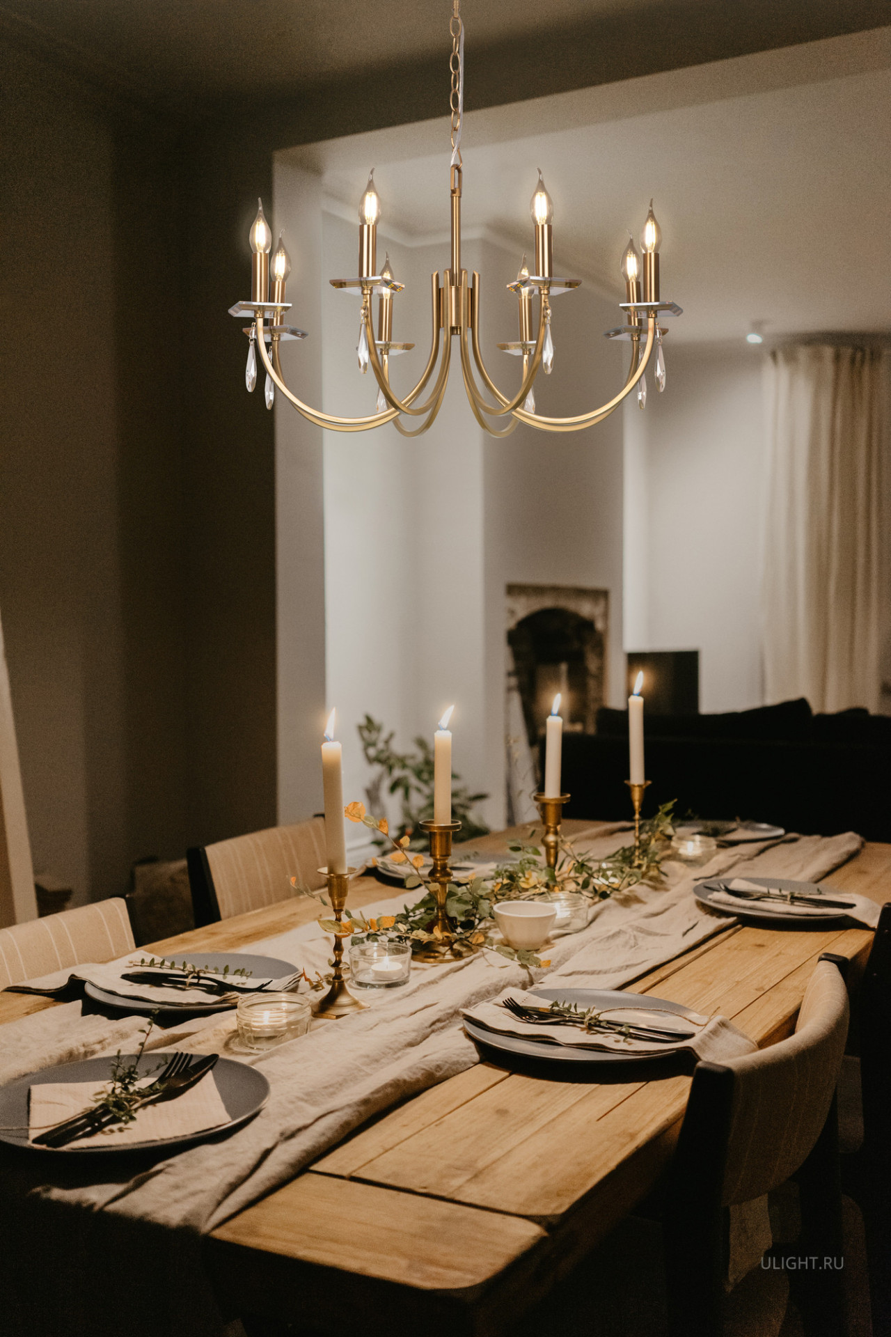 Металлическая арматура в двух оттенках: латунь и никель. Классическая форма плафона в виде свечи. Торшер и настольная лампа имеют тканевые абажуры. Белые – для арматуры цвета никель, оттенка кремовый шампань – для латунной. Декор – прозрачные хрустальные подвесы каплевидной формы. Торшер с цоколем Е27, лампа, бра и люстры – Е14.