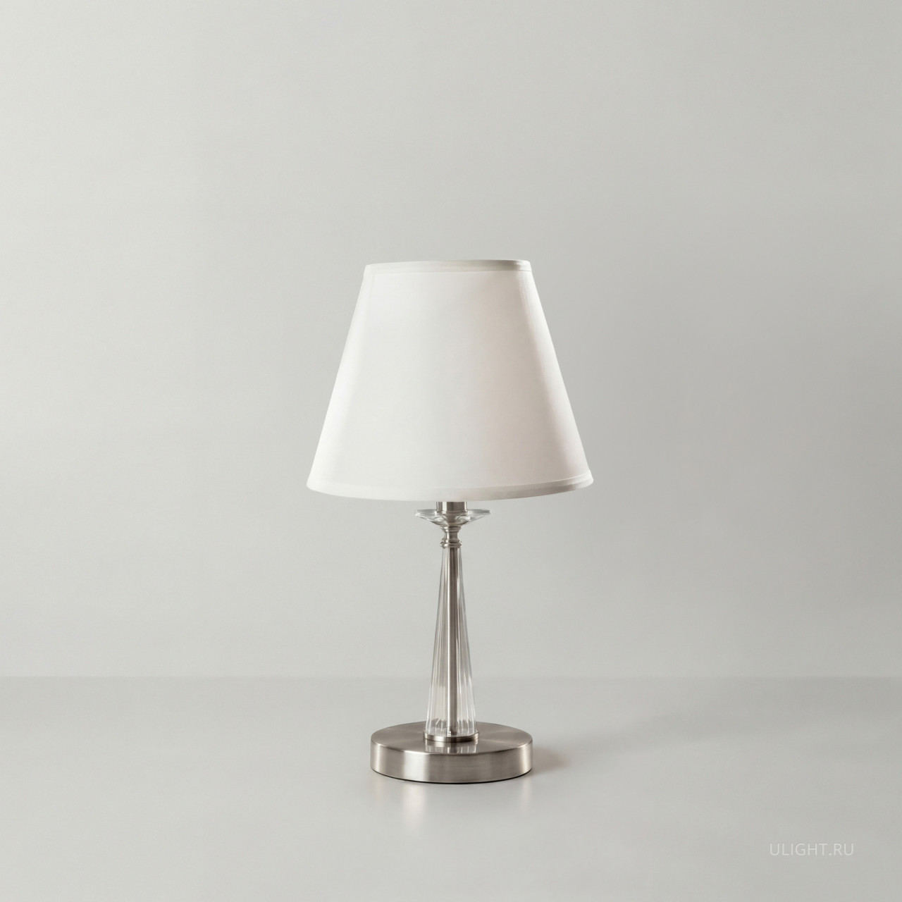 Металлическая арматура в двух оттенках на выбор: латунь и никель. Абажуры – текстиль белого цвета. Декоративные элементы из прозрачного стекла. Источник света – лампа с цоколем E14.