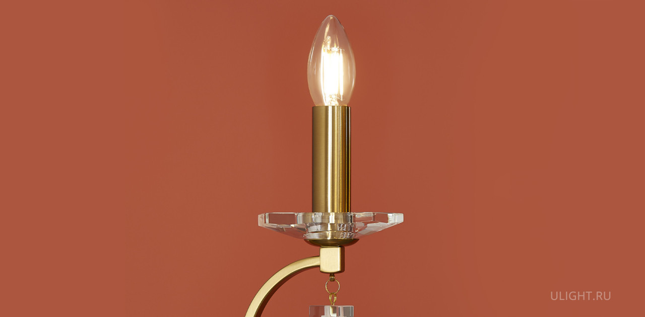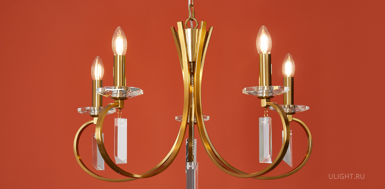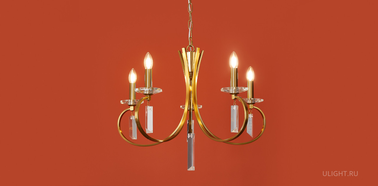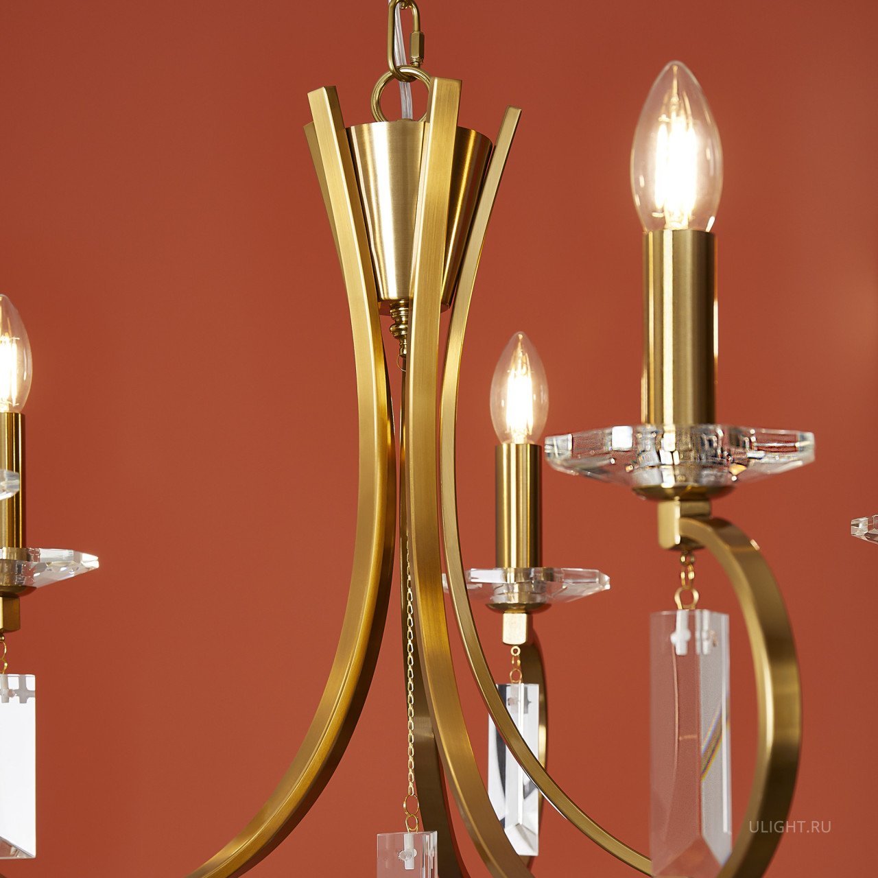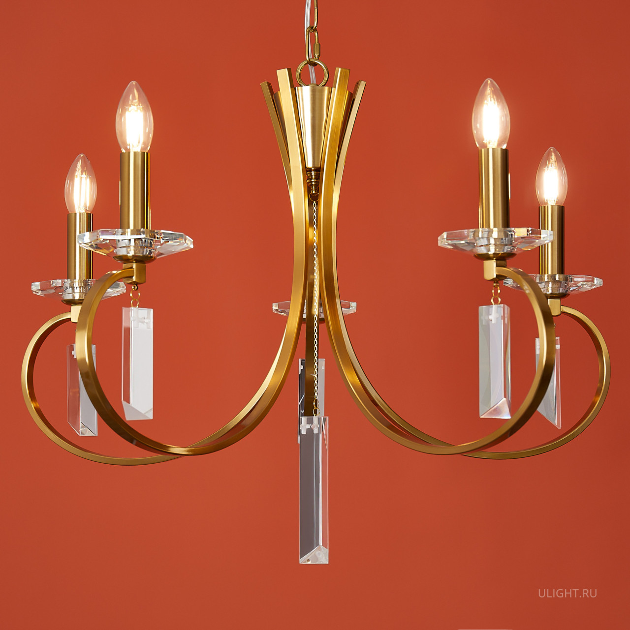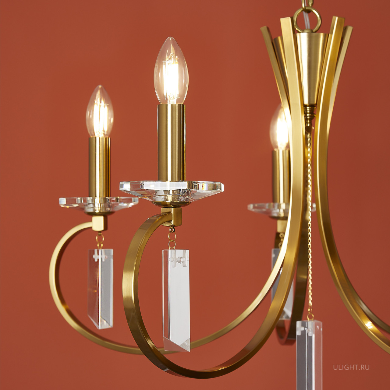 Материал арматуры — металл, цвет — никель или латунь. Подвесные светильники с цоколем E14. Доступны с пятью или шестью источниками света. Грани хрустальных подвесов создают эффект перелива радуги. Центральный декор из стеклянных трубок. Подходит для классических интерьеров.