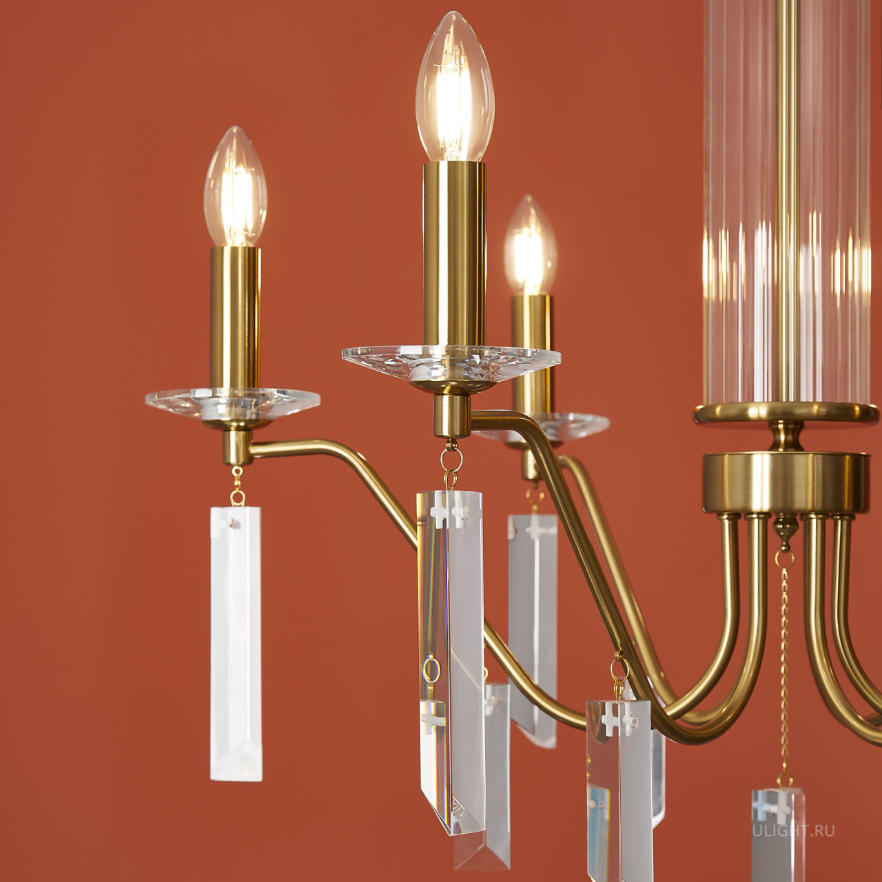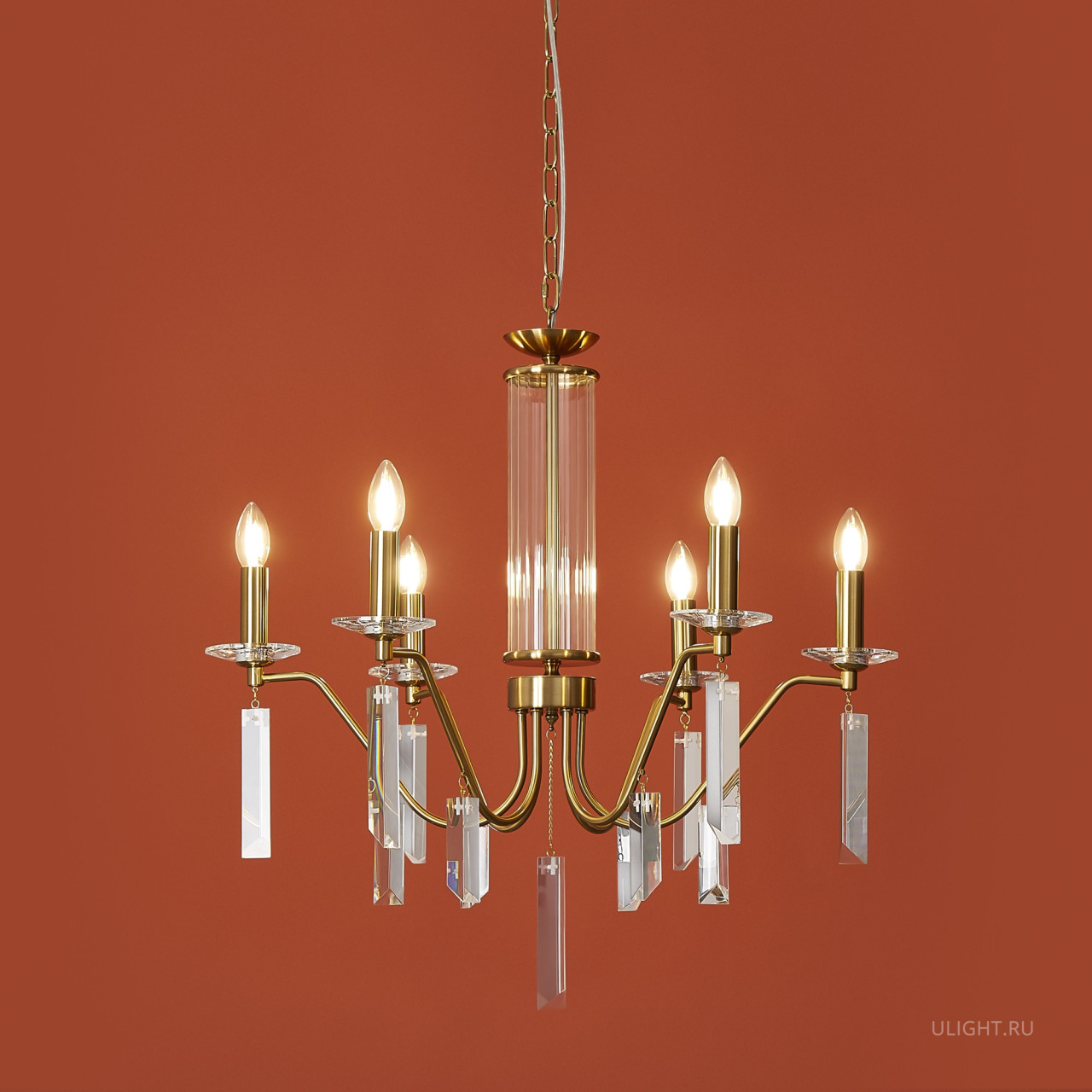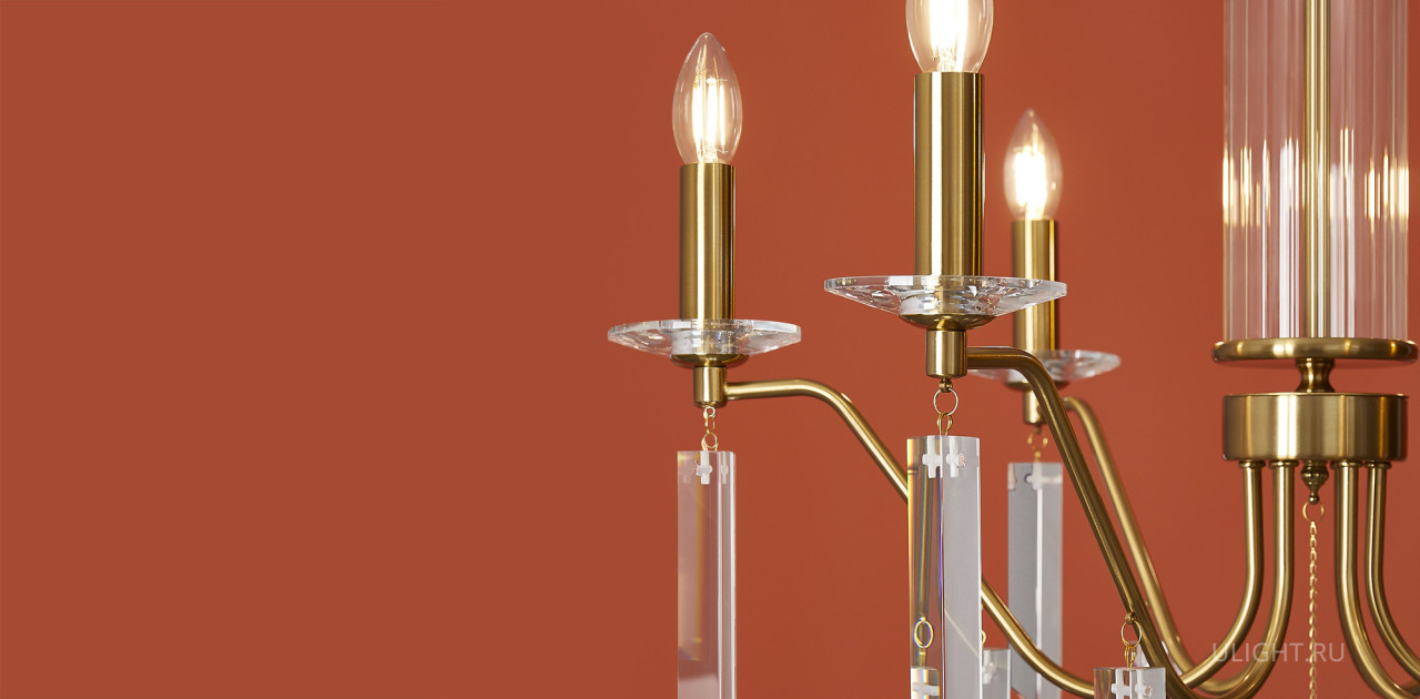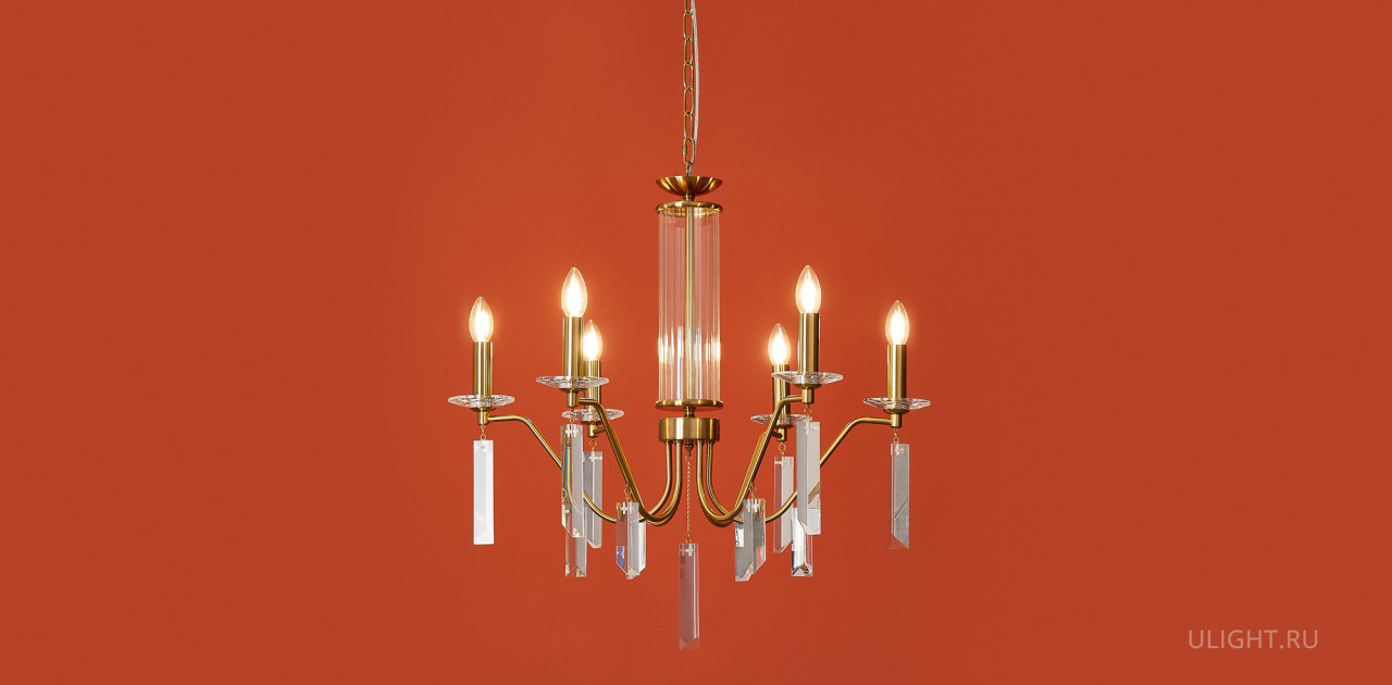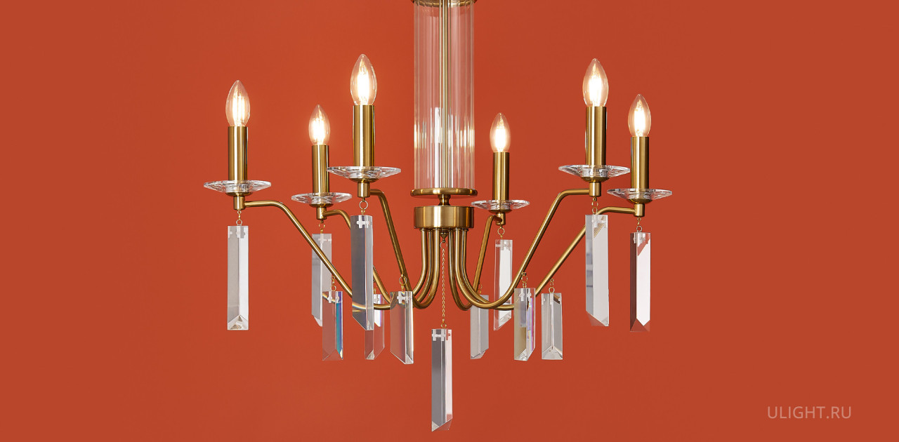 Материал арматуры — металл, цвет — никель или латунь. Подвесные светильники с цоколем E14. Доступны с пятью или шестью источниками света. Грани хрустальных подвесов создают эффект перелива радуги. Центральный декор из стеклянных трубок. Подходит для классических интерьеров.