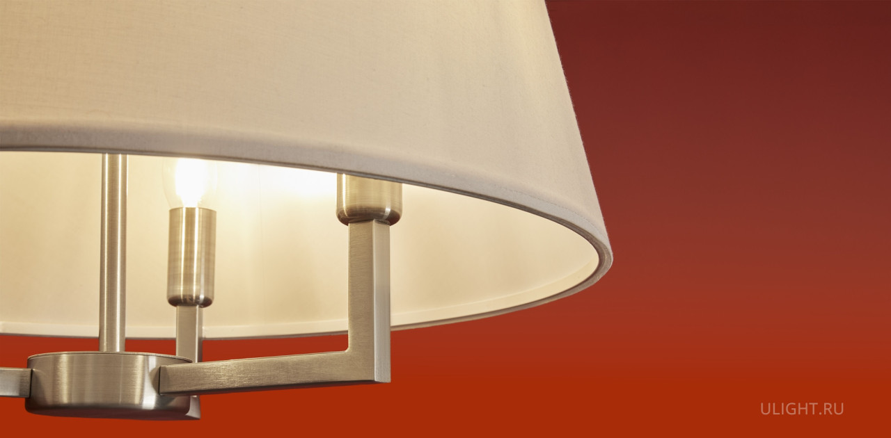 Материал арматуры — металл, цвет — латунь или никель. Потолочные и настенные светильники с цоколем E14. Металлическая арматура строгой геометричной формы. Светлые абажуры из ткани создают мягкий рассеивающий свет. Подходит для оформления классических интерьеров.