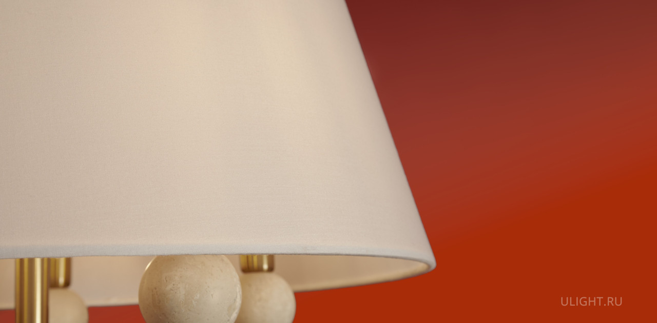 Материал арматуры — металл. Цвет металла — латунь. Абажуры выполнены из белой ткани, которые мягко рассеивают свет. Потолочные и настенные светильники с цоколем E14. Декоративные элементы в форме шара на плафоне выполнены из травертина. Металлическая форма арматуры строгой геометрической формы с пластинами из латуни. Подходит для оформления элегантных классических пространств.