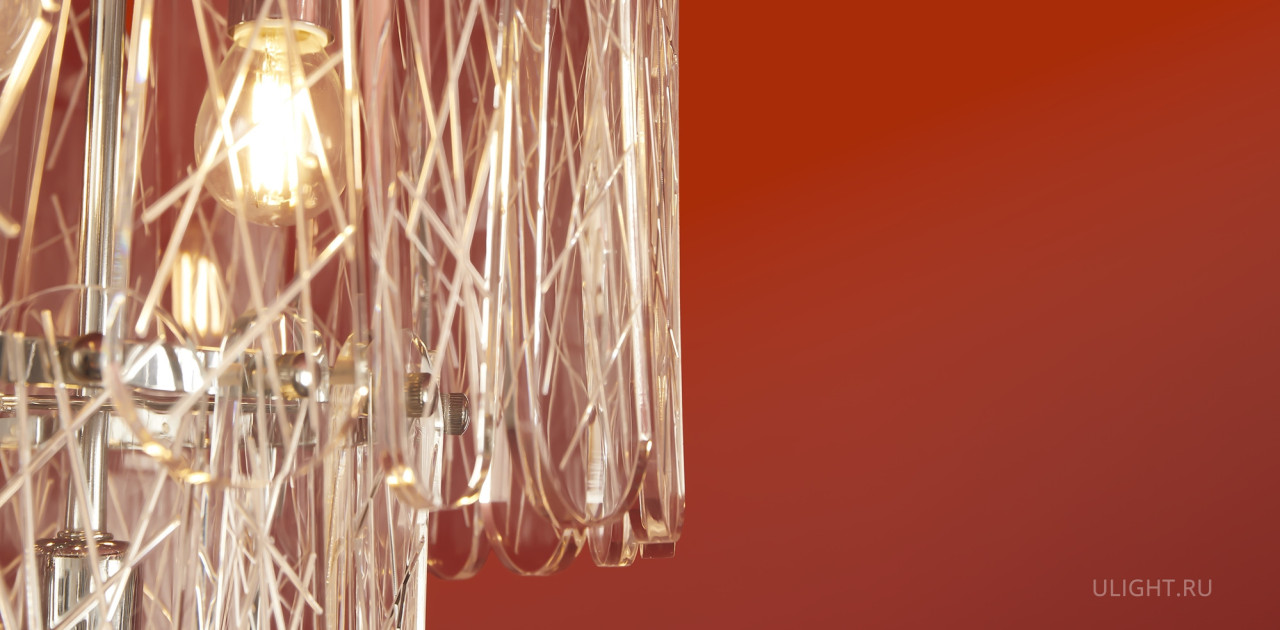 Материал арматуры — металл, цвет — хром. Светильники выполнены из хрусталя с рисунком frozen". Подвесные светильники и бра с цоколем E14. Современный дизайн арматуры, дугообразные формы с хромированной отделкой подчеркивают декоративные хрустальные элементы. Подходит для современных интерьеров."