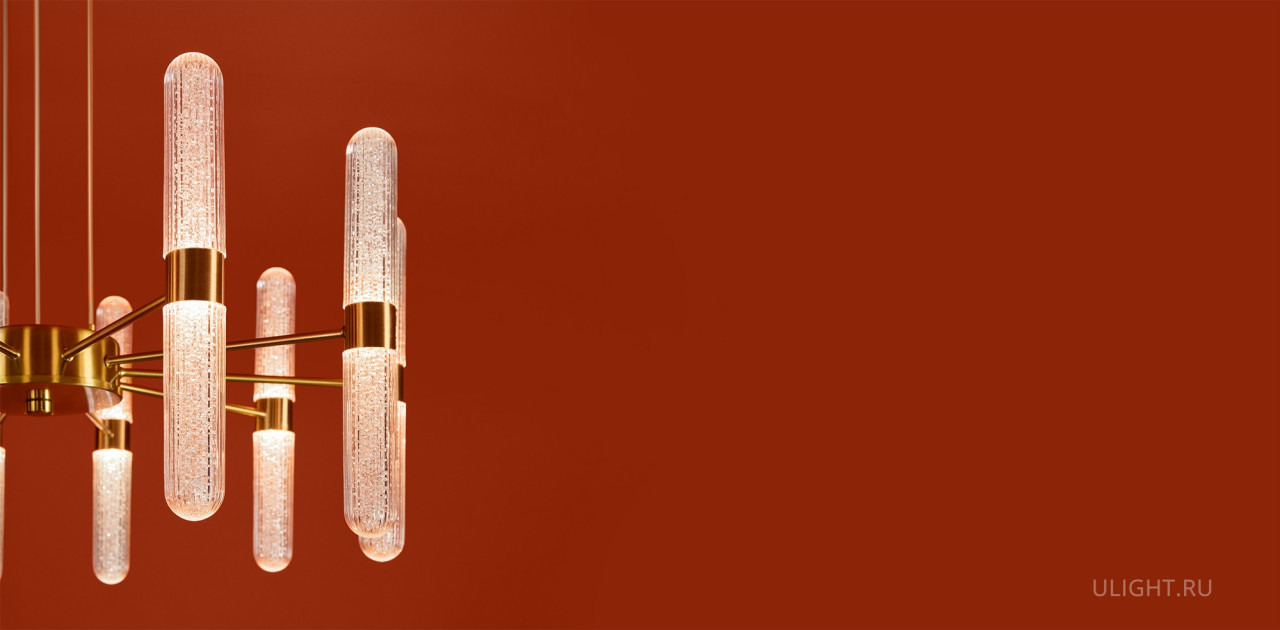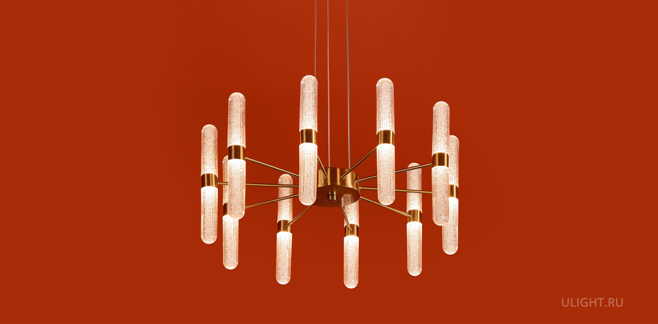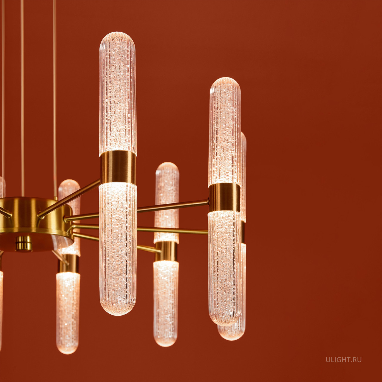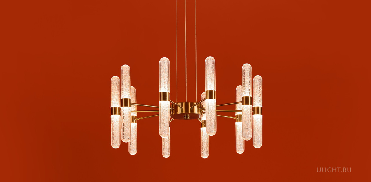 Арматура - металл в цвете латунь и никель. Основной акцент в дизайне люстр Alias сделан на акриловые плафоны, эффект пузырьков. Встроенный LED модуль 2700K. 2 дизайна подвесных светильников.