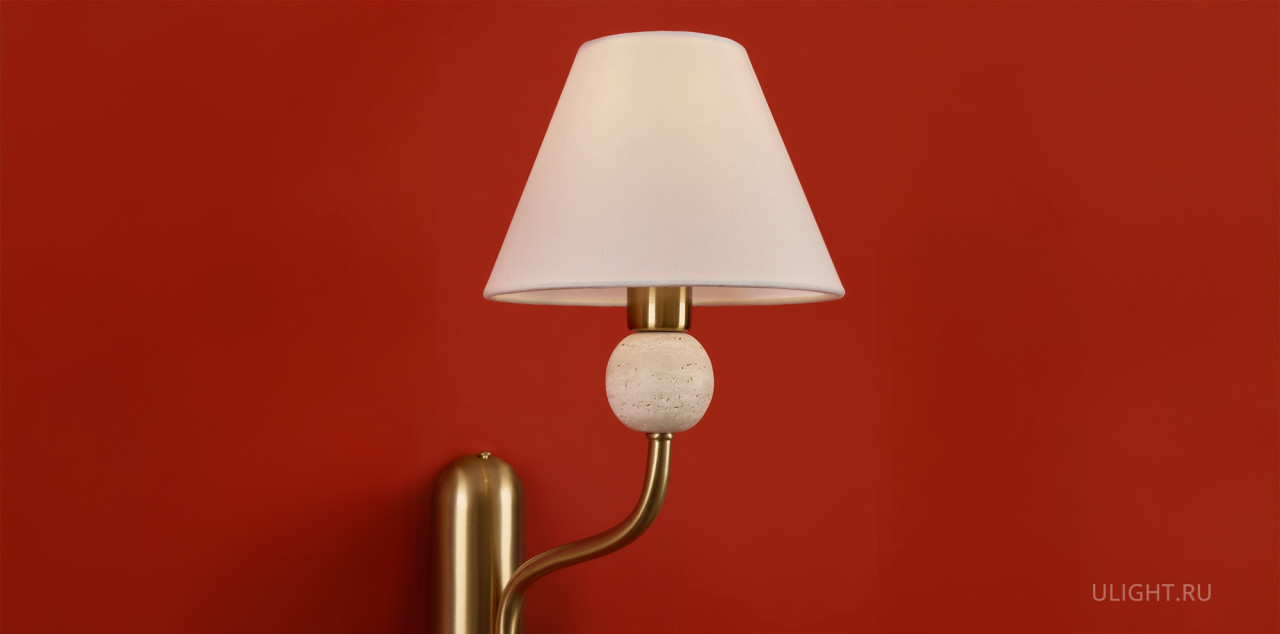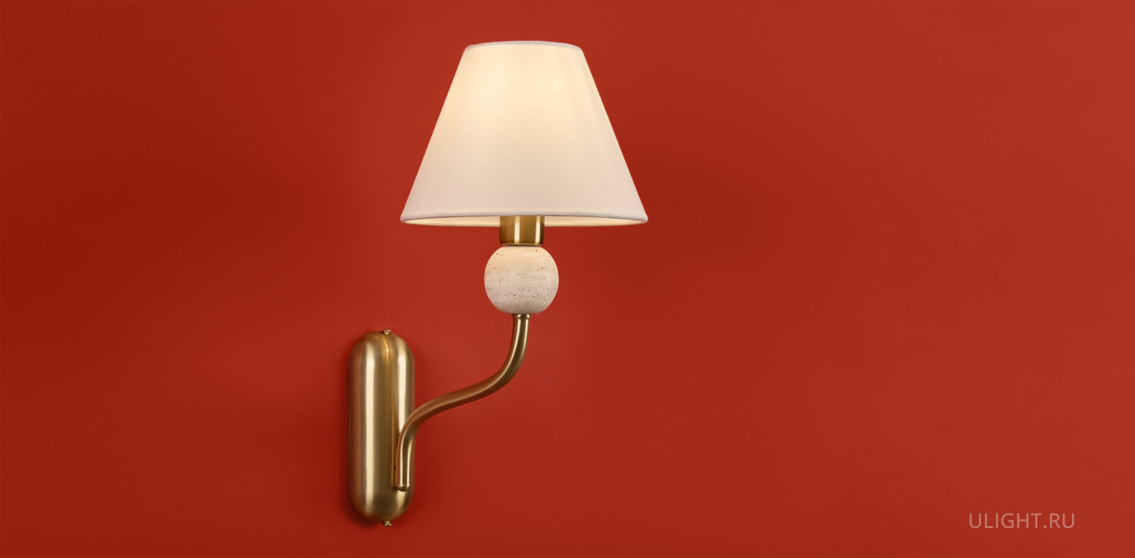 Арматура - металл в цвете латунь. Тканевые абажуры, травертиновые элементы. Лампы E14 (в комплекте). Серия состоит из люстры c 5 плафонами и бра. Трендовое сочетание в классическом стиле.