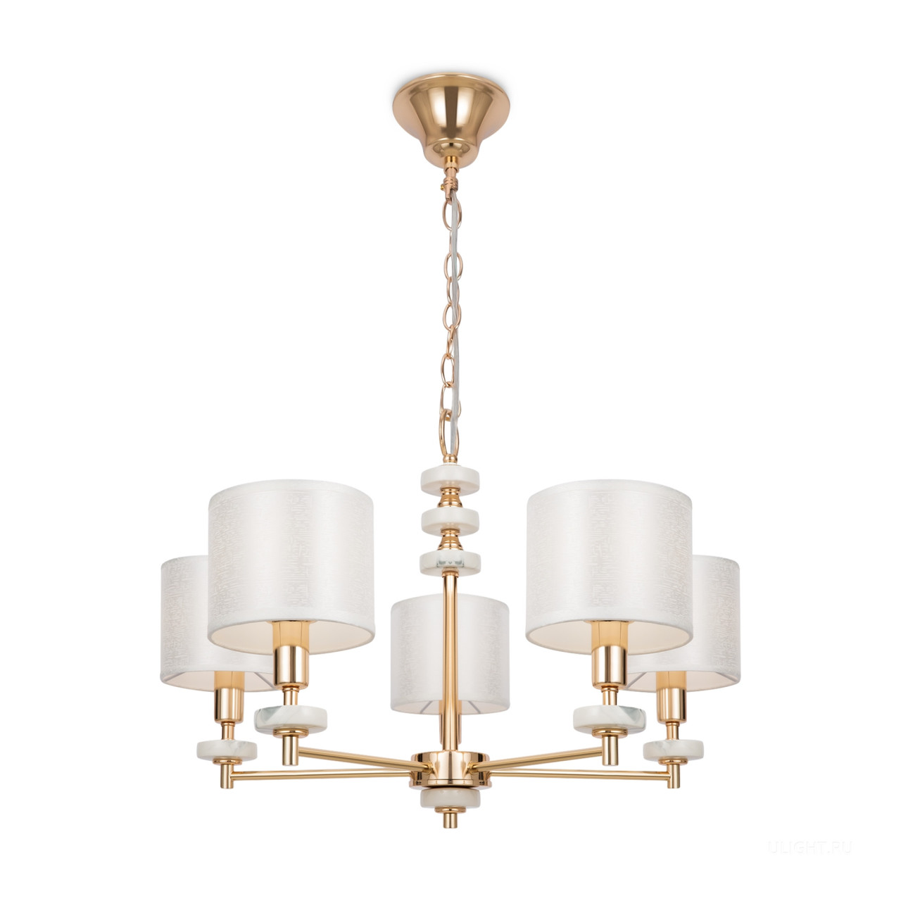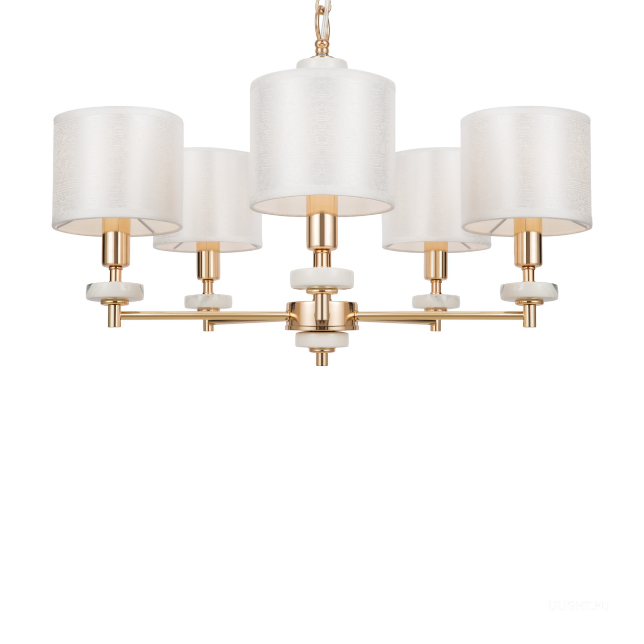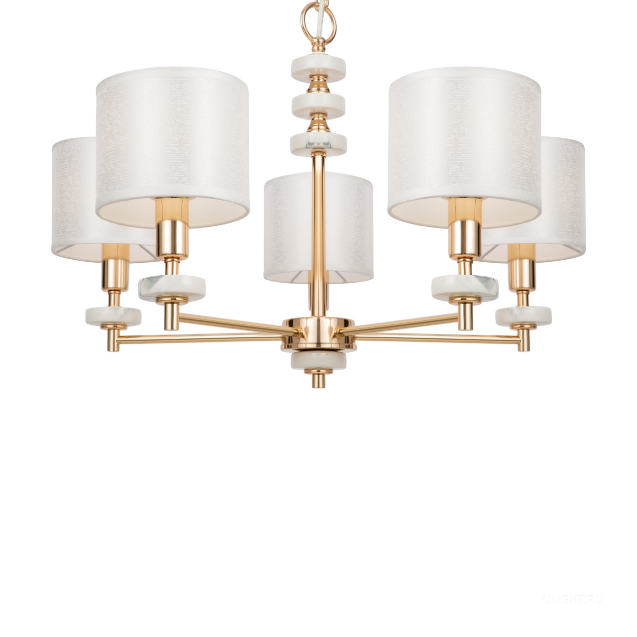 Металлическая арматура золотого оттенка. Абажуры – текстиль на ПВХ кремового цвета. Трендовый керамический декор с имитацией мрамора. Источник света – лампа с цоколем E14.