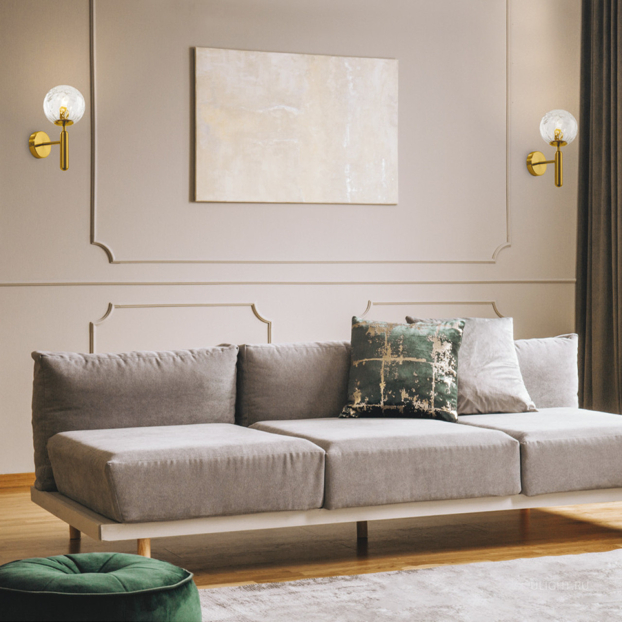 Металлическая арматура оттенка латуни. Плафоны-сферы в двух вариантах: матовое белое стекло и прозрачное с рельефной фактурой. Широкий ассортимент для зональной подсветки. В качестве источника света используется лампа с цоколем Е14.