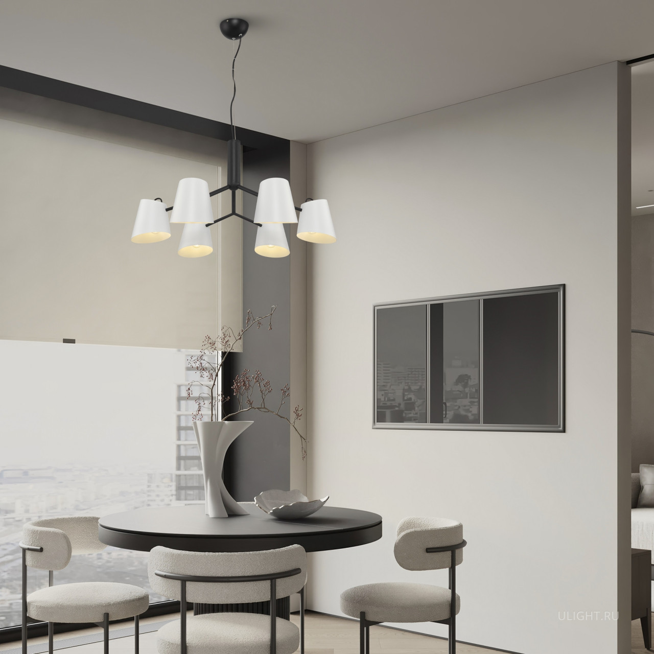 Арматура и плафоны выполнены из металла. Цвет арматуры – черный. Плафоны белого оттенка. Оригинальная форма плафонов с косым срезом. Источник света – лампа с цоколем E14.
