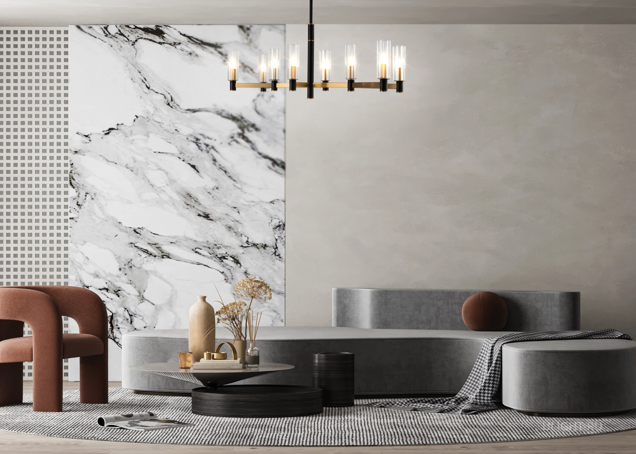 Арматура из металла сочетает два оттенка: черный и латунь. Плафоны цилиндрической формы выполнены из рельефного прозрачного стекла. Актуальная геометрия с настроением американской классики. Источник света – лампа с цоколем E14.
