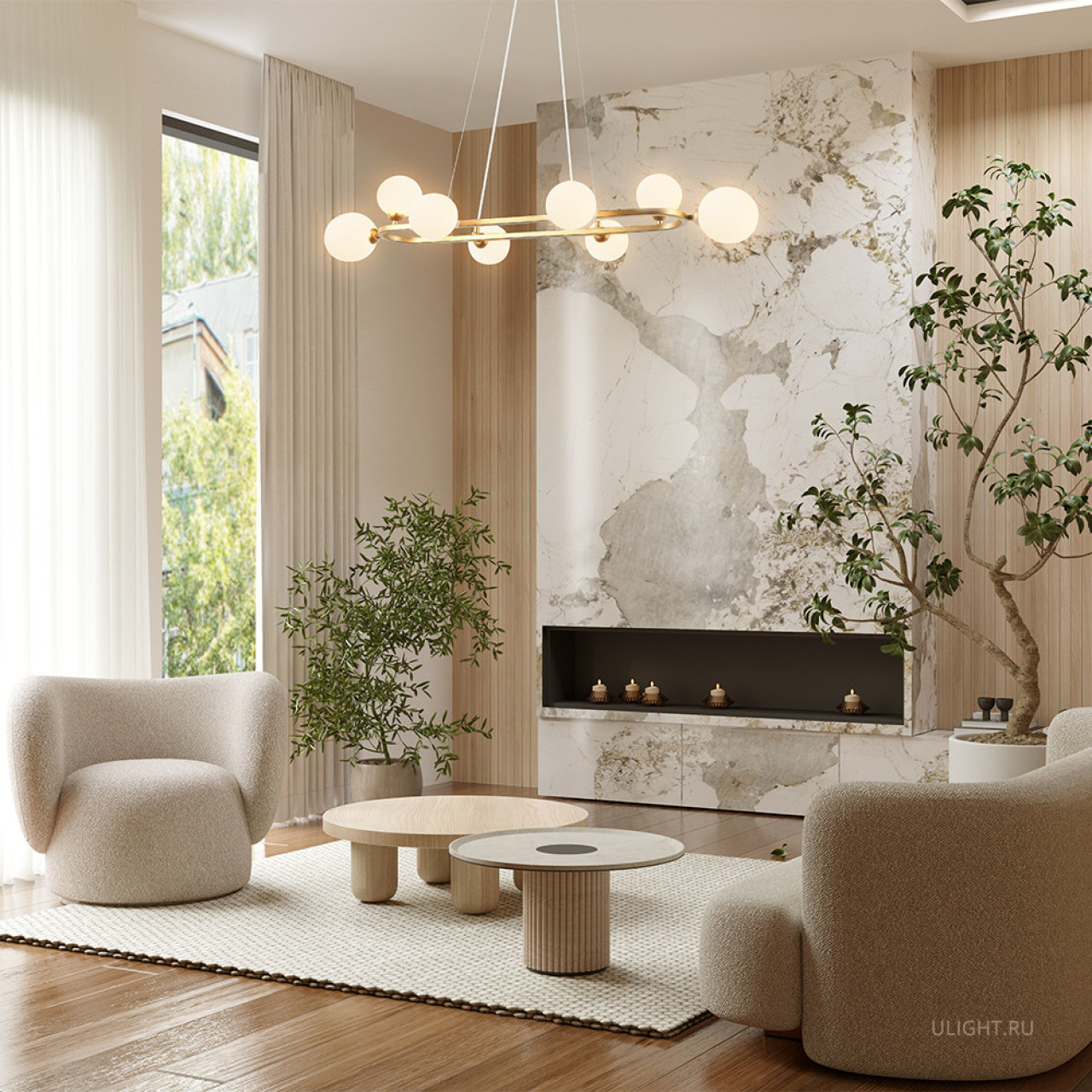 Металлическая арматура, цвета - черный и золотой. Плафоны-сферы из стекла 2х оттенков - матовый белый, полупрозрачный дымчатый - расположены на вытянутом металлическом каркасе, обеспечивая равномерный свет. Тонкие тросы придают светильнику эффект парения. Источник света - лампа с цоколем G9.