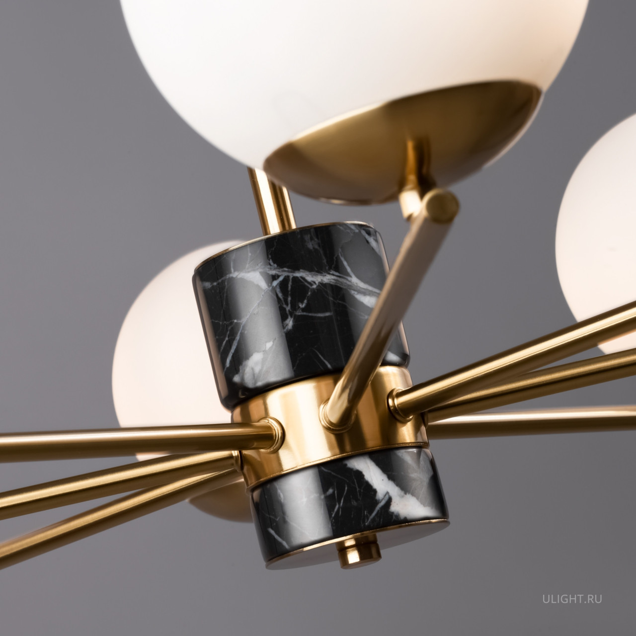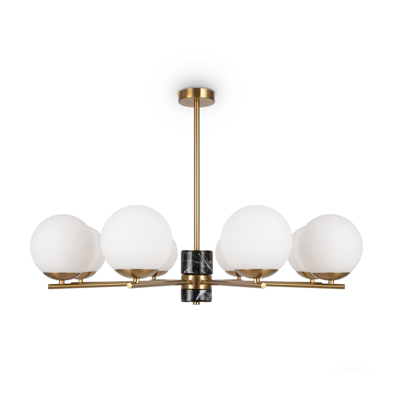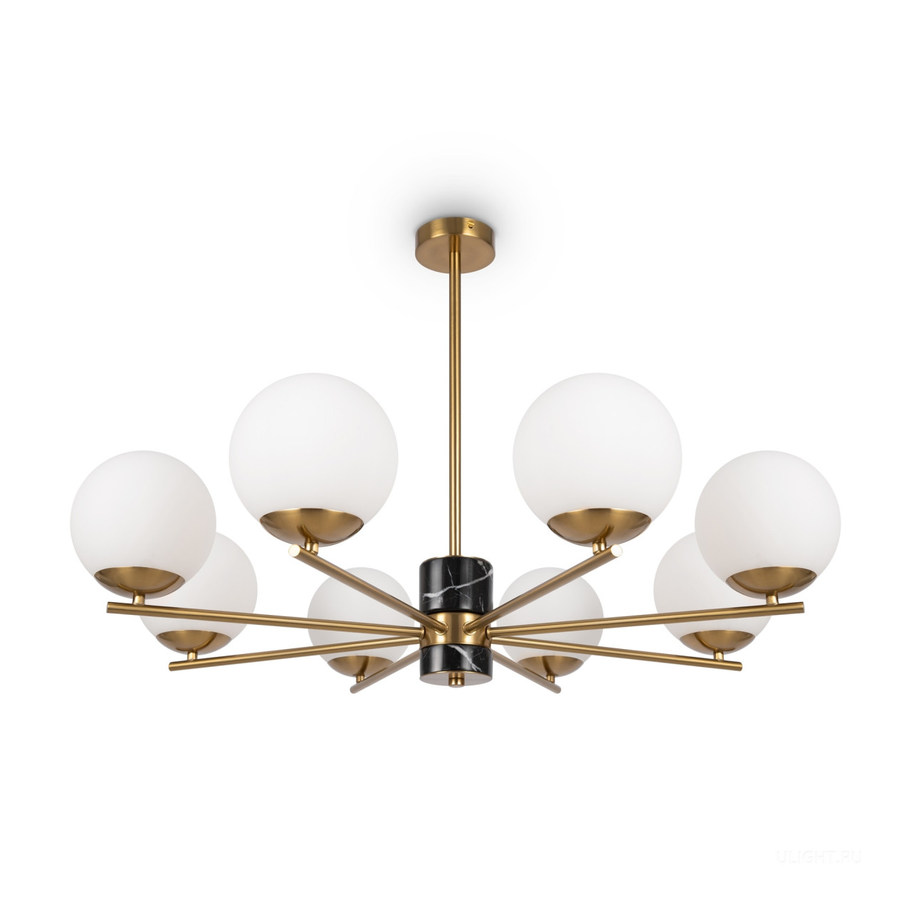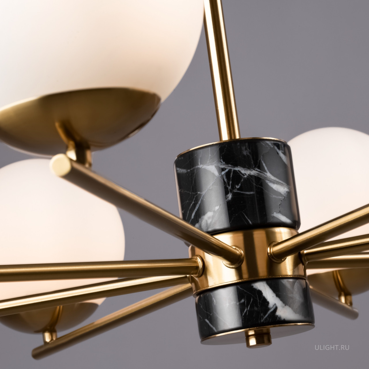 Арматура - металл, цвет - латунь. Мраморные черные элементы в основании. Плафоны-сферы из белого матового стекла с металлической апликацией у основания крепления в цвет арматуры. Сменямый источник света - лампы с цоколем Е27.