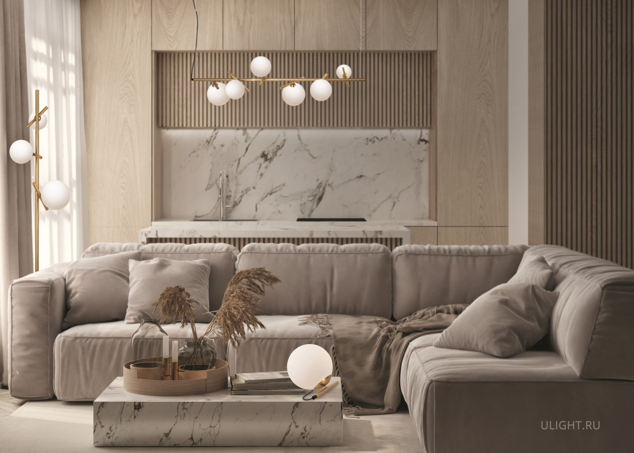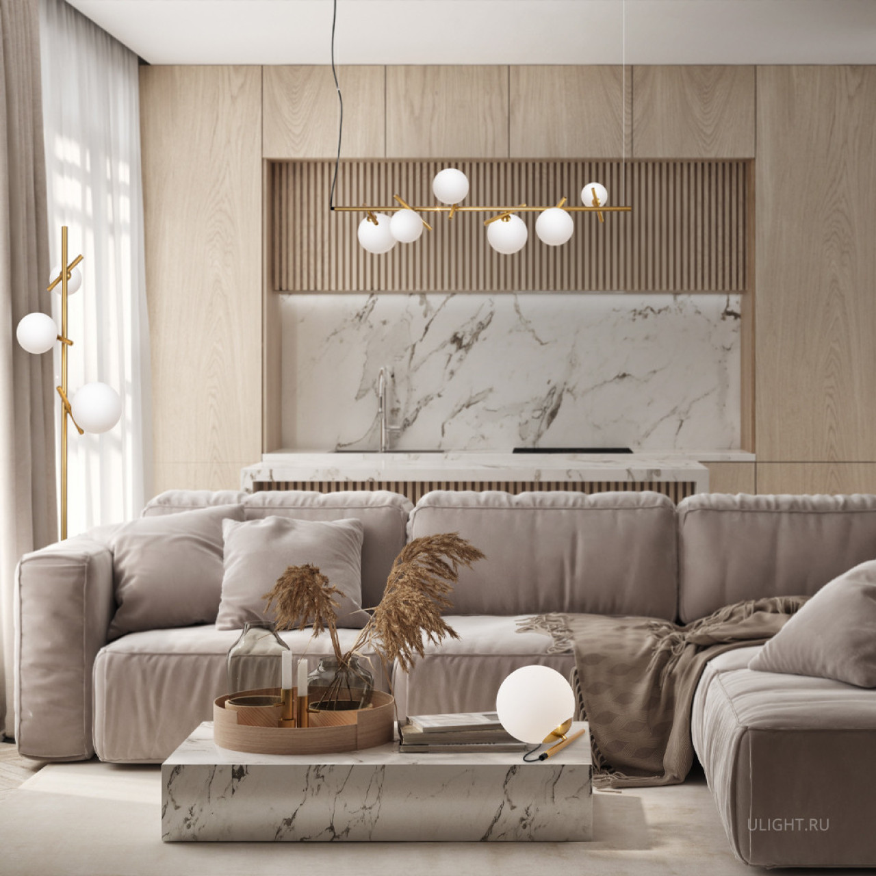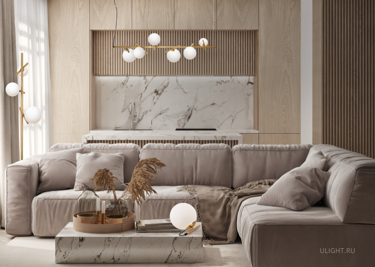 Материал арматуры — рифленый металл, цвет — латунь. Плафоны-сферы из белого матового стекла для мягкого заливающего света. Воздушный образ плафонов, строгие тонкие линии арматуры придадут интерьеру изящество и легкость. Высота подвесов регулируется. Источник света — лампы с цоколем G9.