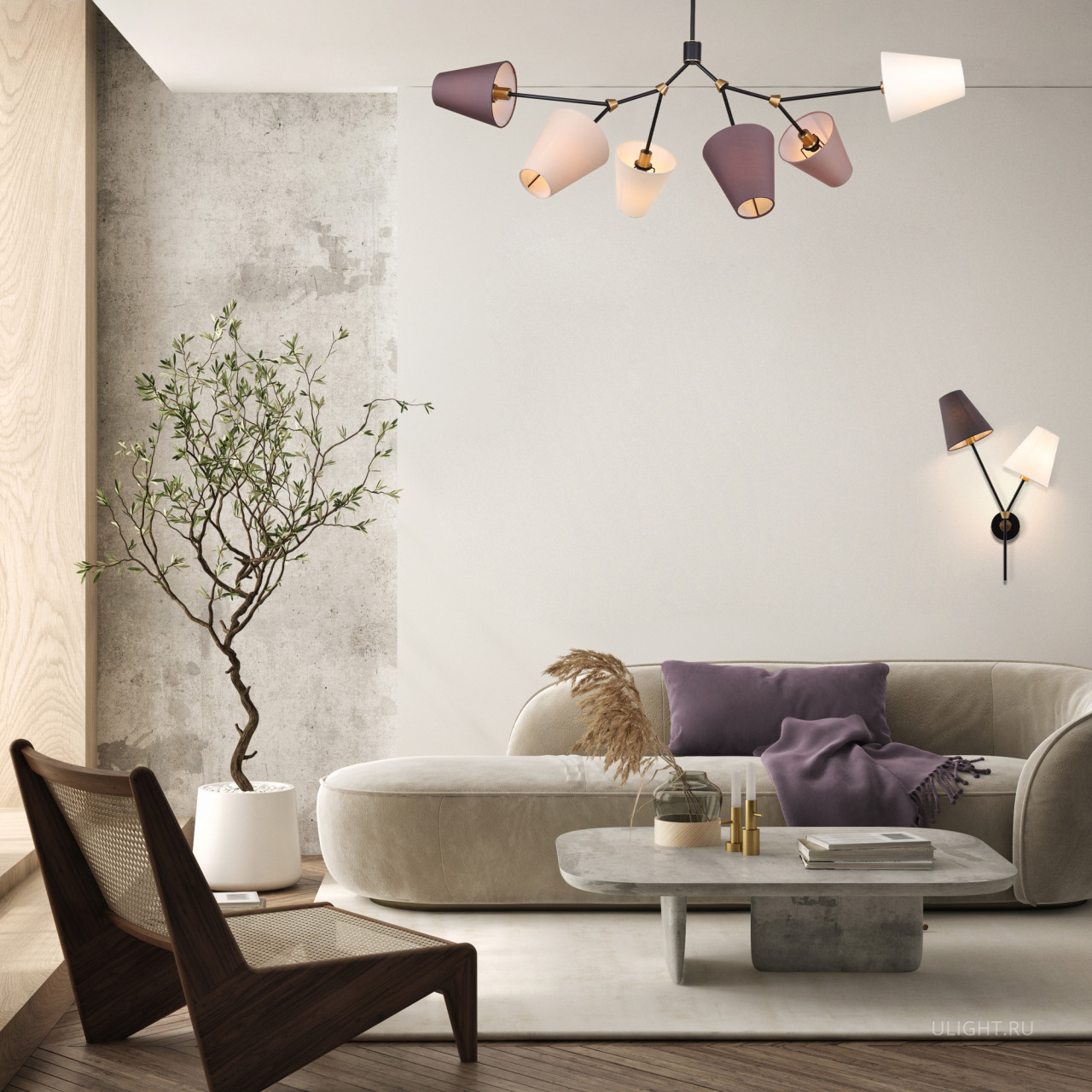 Арматура - металл, цвет — чёрный. Декоративные крепления и вставки цвета латуни. Тканевые абажуры в форме конуса из микса теплых цветов: бежевый и коричневый. Открытые верхние основания абажуров пропускают дополнительный свет. Динамичный дизайн в стиле Casual. Источник света — лампа с цоколем Е14.