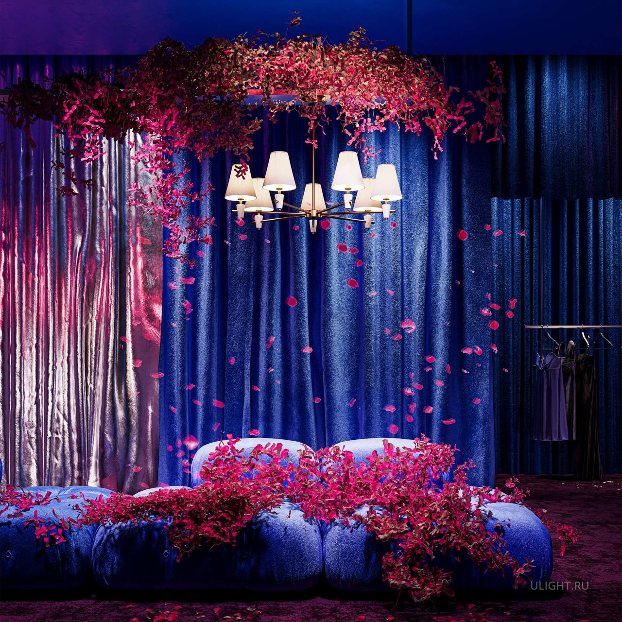 Металлическая арматура в цвете латунь. Дополнительные элементы — минималистичные вставки из натурального белого мрамора. Белые абажуры из ткани в форме конуса. Источник света — лампа с цоколем Е14 или Е27.