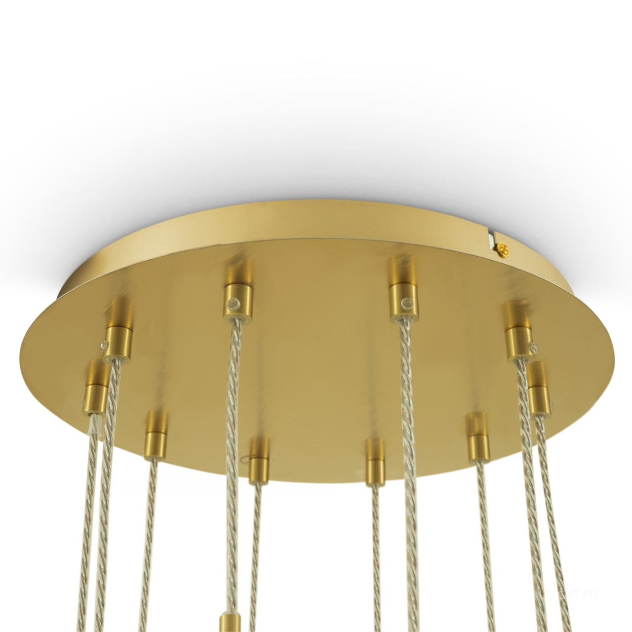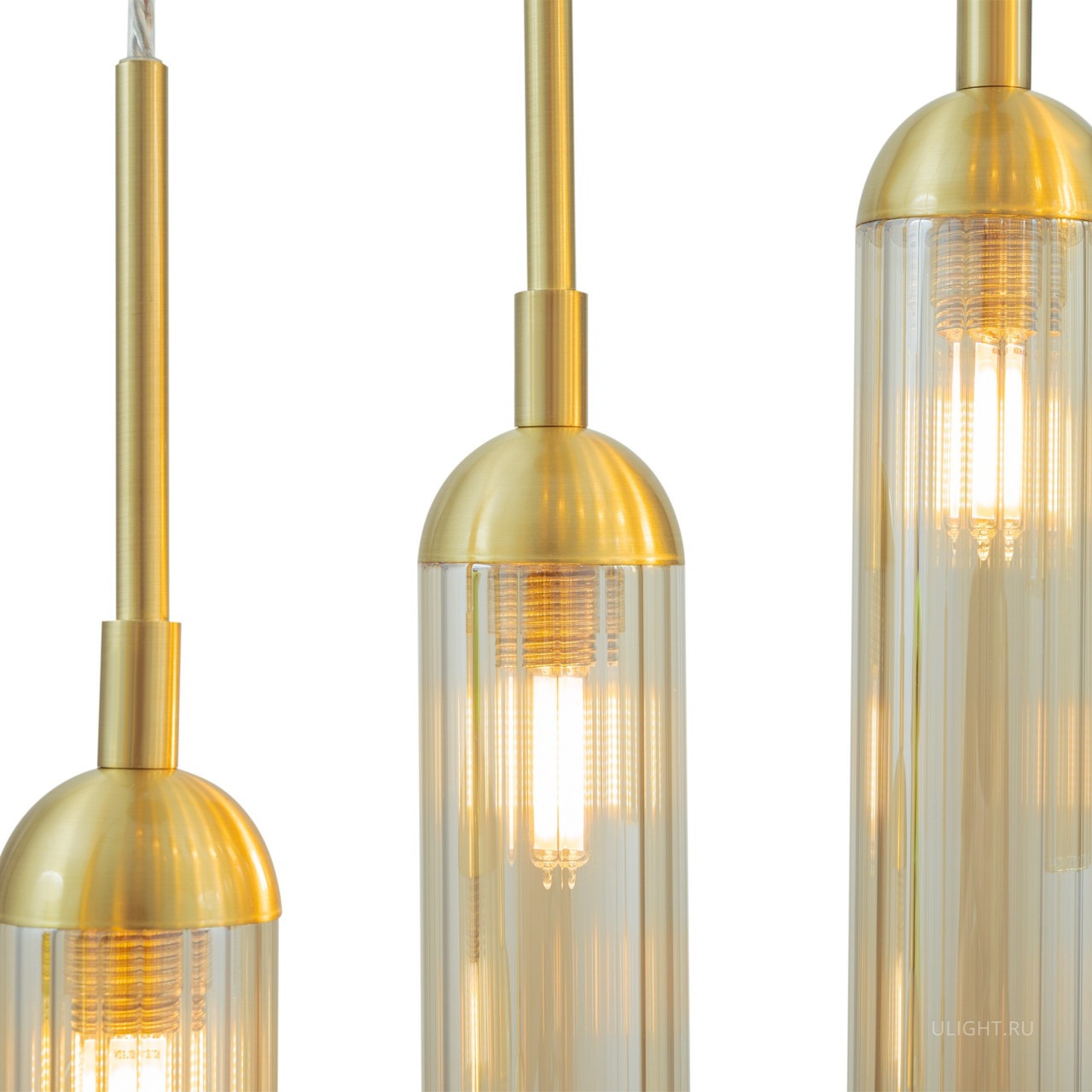 Арматура из металла, цвет — золото. Рельефные плафоны в тренде ZIGZAG. Материал — стекло, цвет — янтарный. Высота подвесных светильников регулируется. Плафоны закреплены на металлическую сферу. Источник света — лампа с цоколем G9.