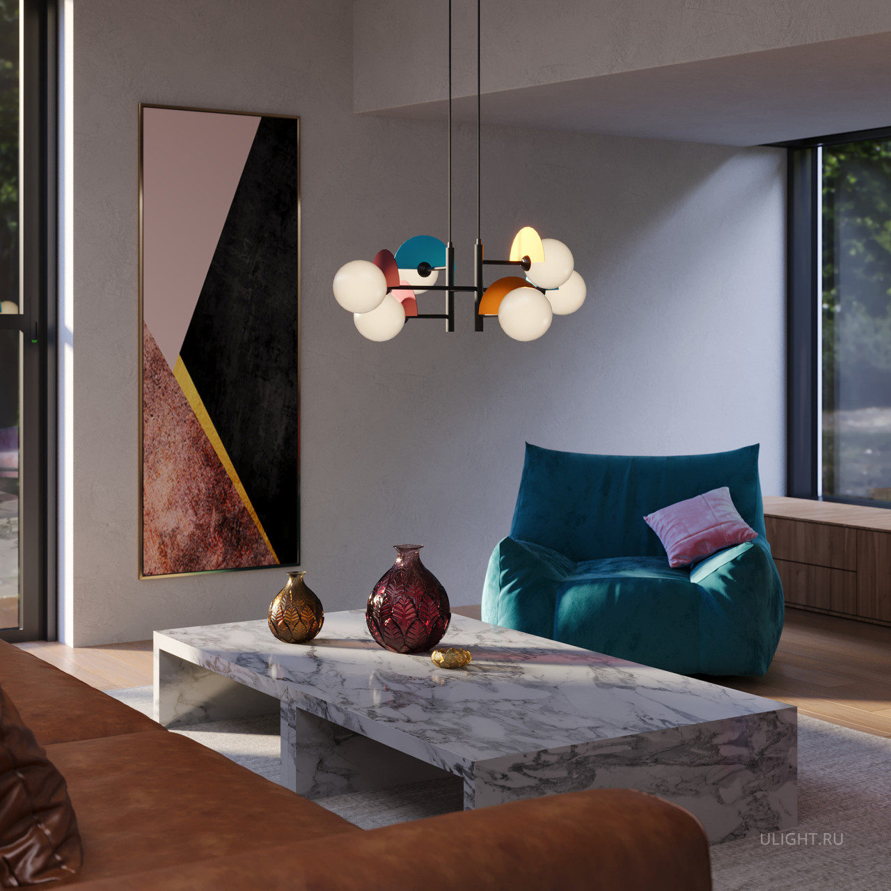 Арматура — металл, цвет — разноцветный или латунь. Белые матовые плафоны из стекла украшены металлическими золотыми или цветными лепестками. Динамичный дизайн для интерьеров в стиле Мемфис. Разнообразие форм в одной конструкции позволяет создать яркое освещение в больших комнатах. Высота регулируется. Источником света служит лампа с цоколем G9.