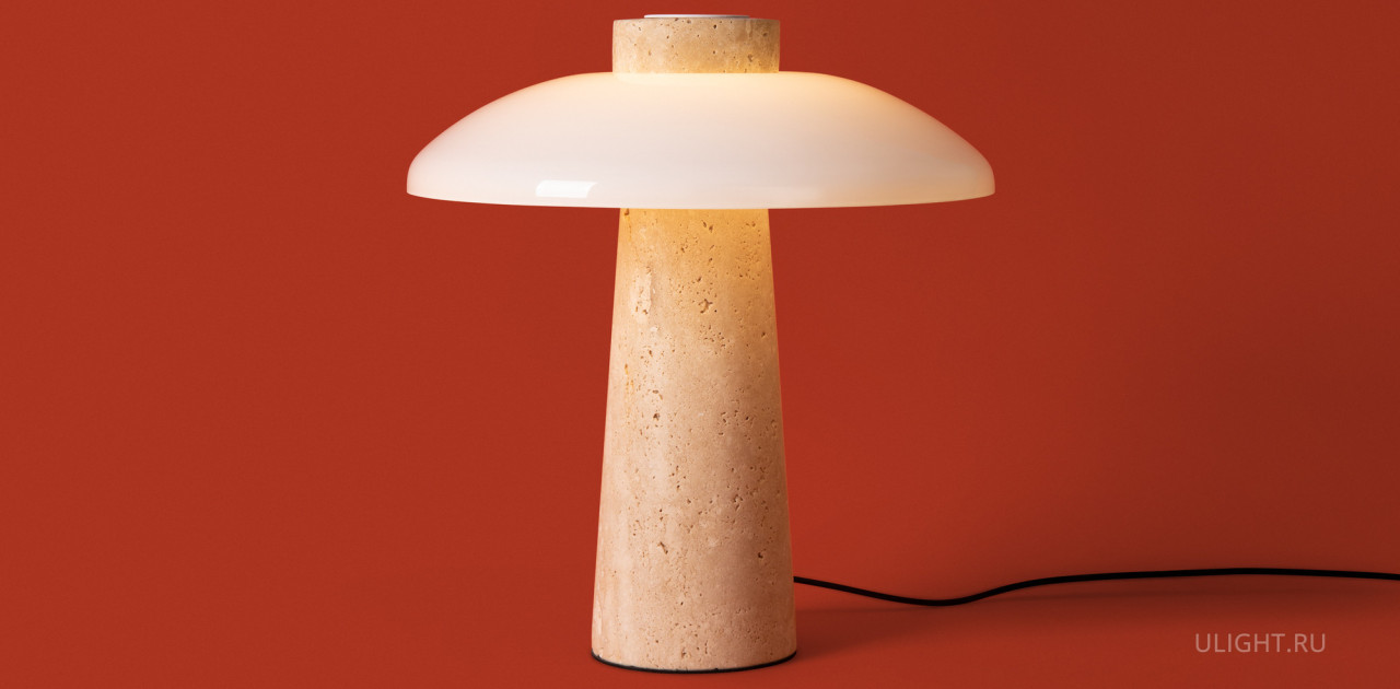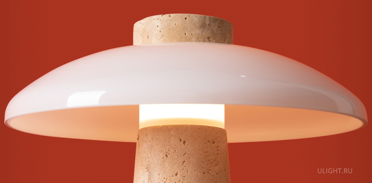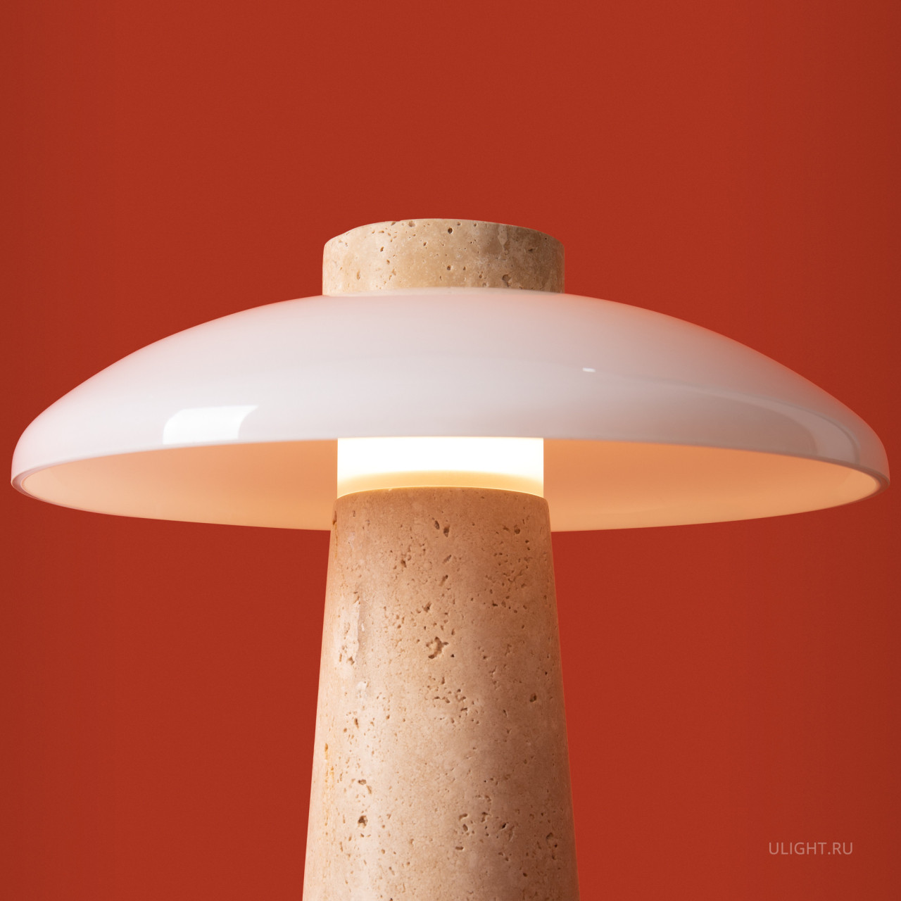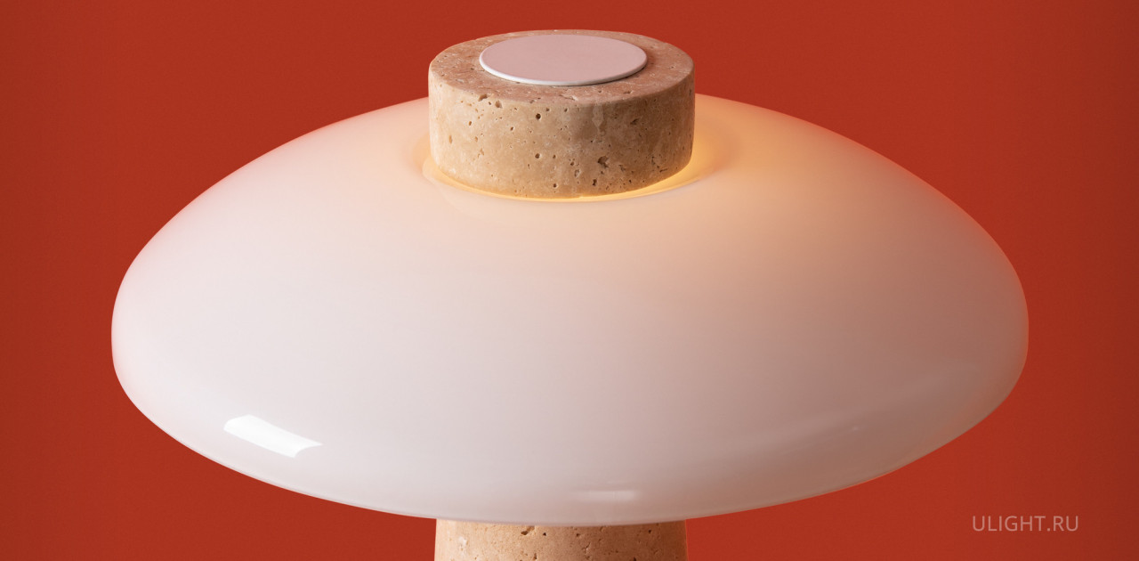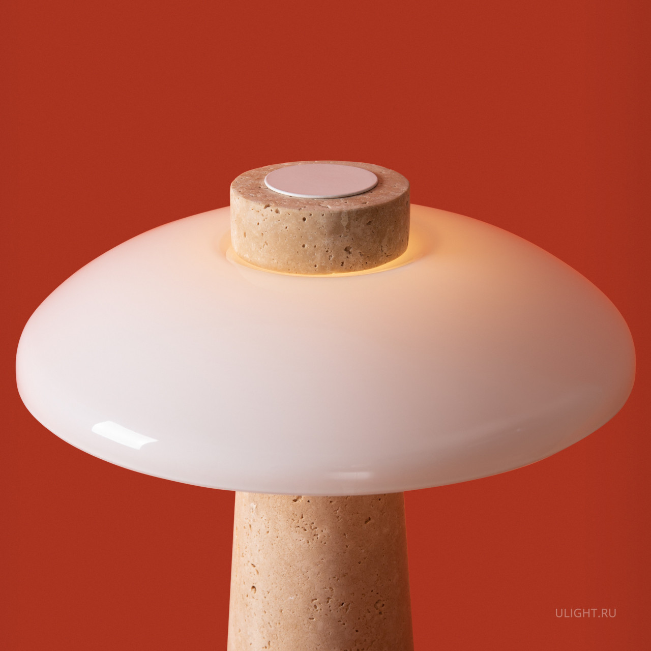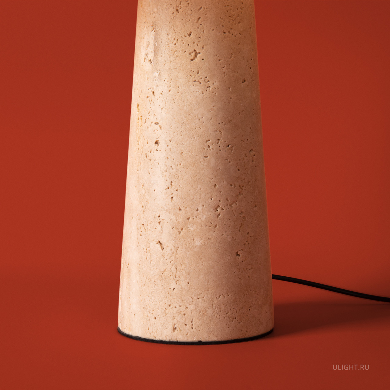Натуральный травертин и стеклянные плафоны. Металл (латунь, черный). Матовые белые абажуры. LED 3000K (E14/G9, не в комплекте). Сенсорное управление. Подвесные светильники с декоративным элментом травертина в виде шара.