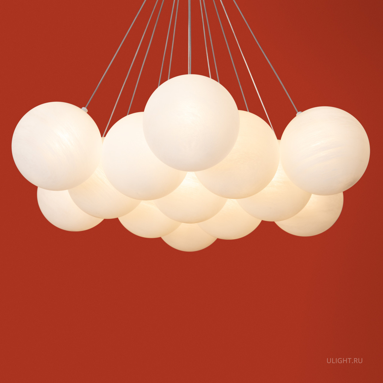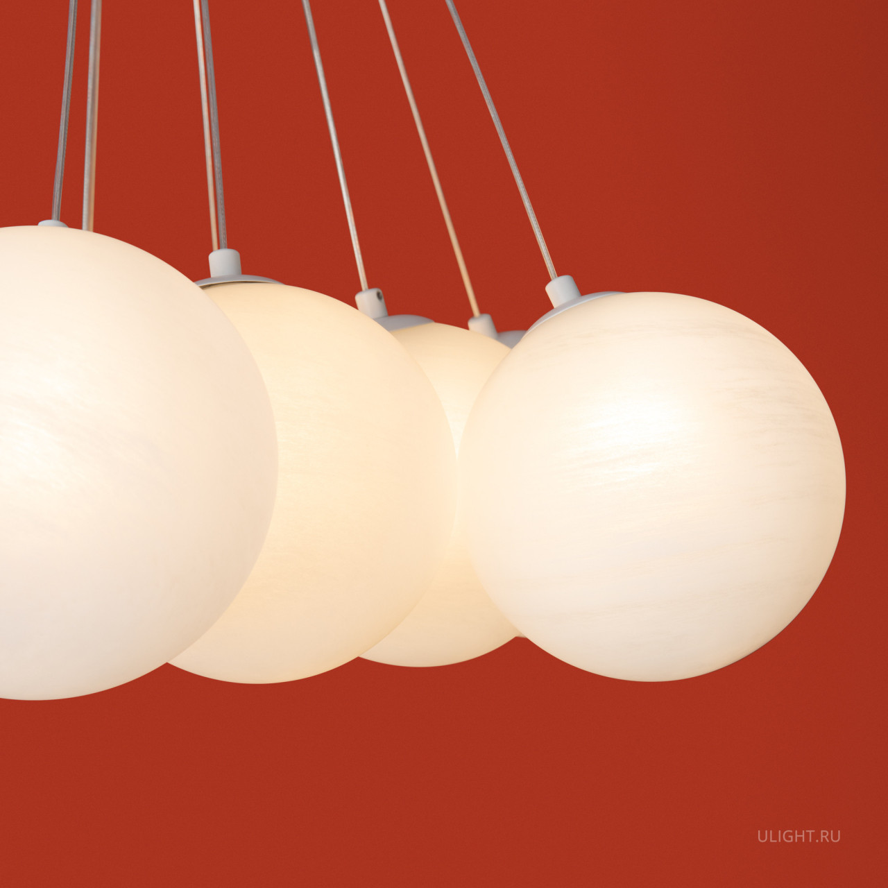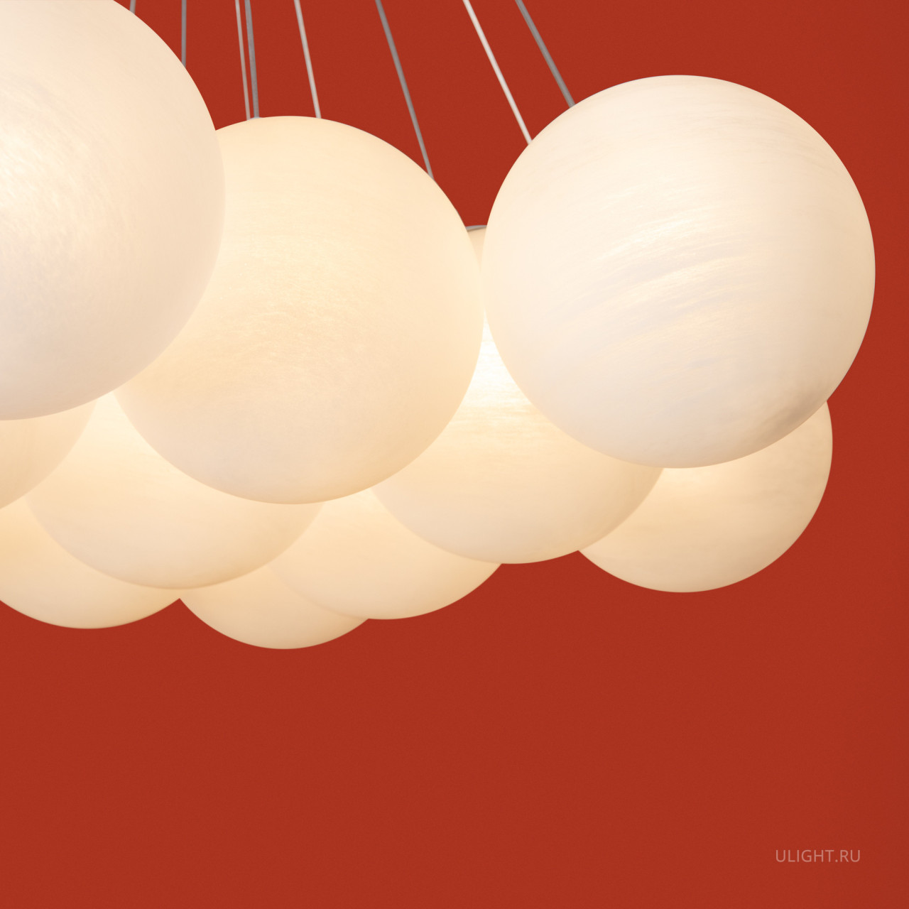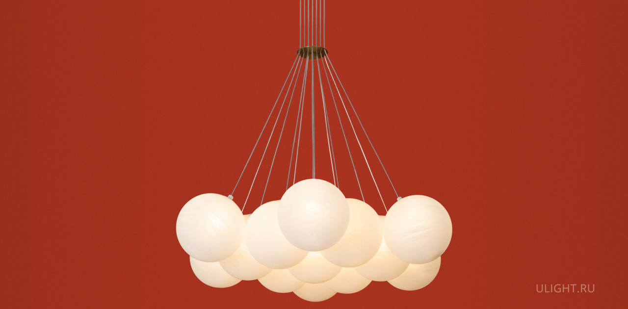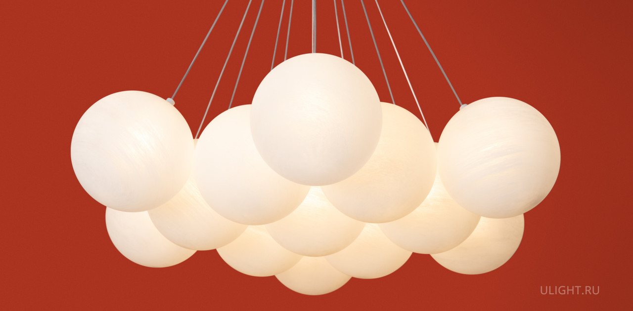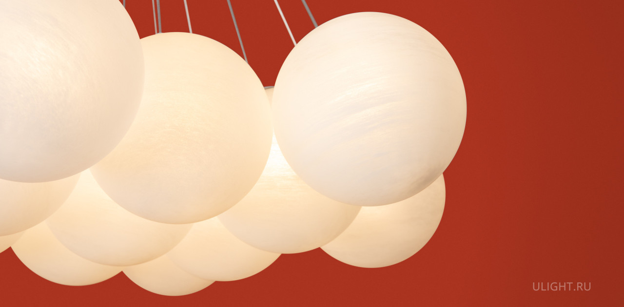Материал арматуры — металл, цвет — хром/латунь. Подвесные светильники c цоколями E14/E27/G9. Белые стеклянные плафоны с рисунком в виде космических планет крепятся на тонких тросах, которые регулируются по высоте, создавая эффект парящих облаков.