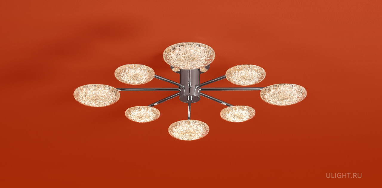 Материал арматуры — металл, цвет — хром. Потолочный светильник оснащен LED-источником света с цветовой температурой 2700К. Плафоны с рисунком из воздушных пузырьков акрила полусферической формы. Футуристичный дизайн идеально дополнит современные интерьеры и помещения с невысокими потолками.