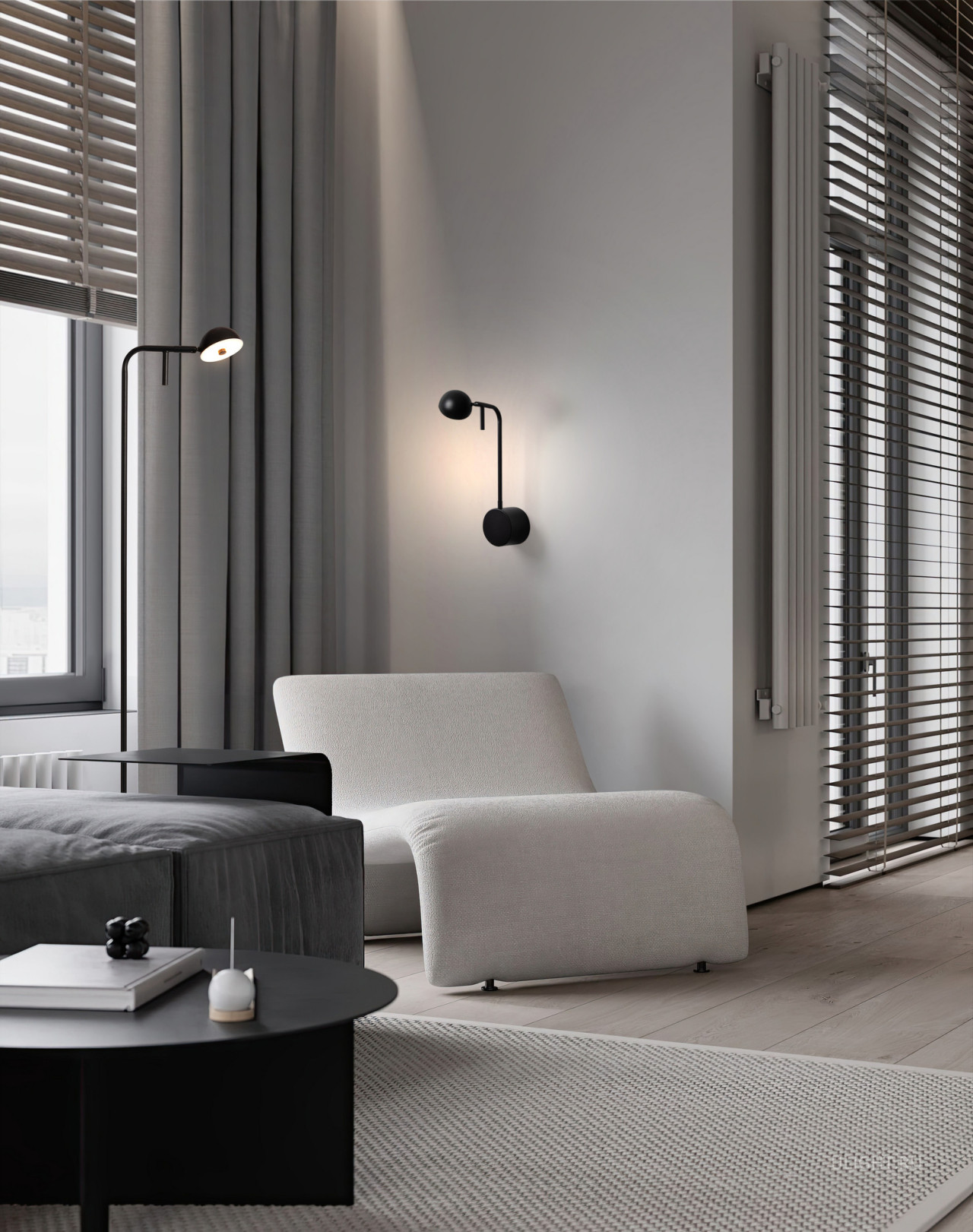 Материал арматуры — металл, цвет — черный. Напольный торшер и настенные светильники оснащены LED-источниками света с цветовой температурой 2700К. Полусферические поворотные мини плафоны с LED освещением подчеркивают монохромную концепцию дизайна. Подходит для создания минималистичных и лофт интерьеров.