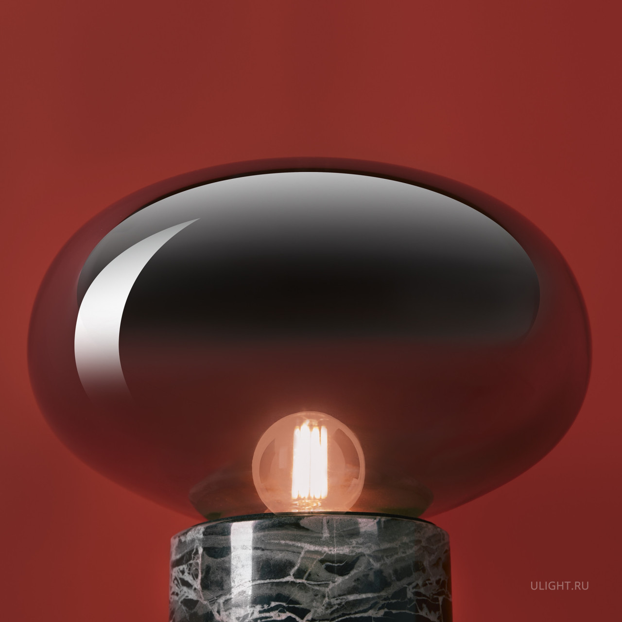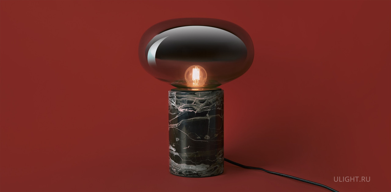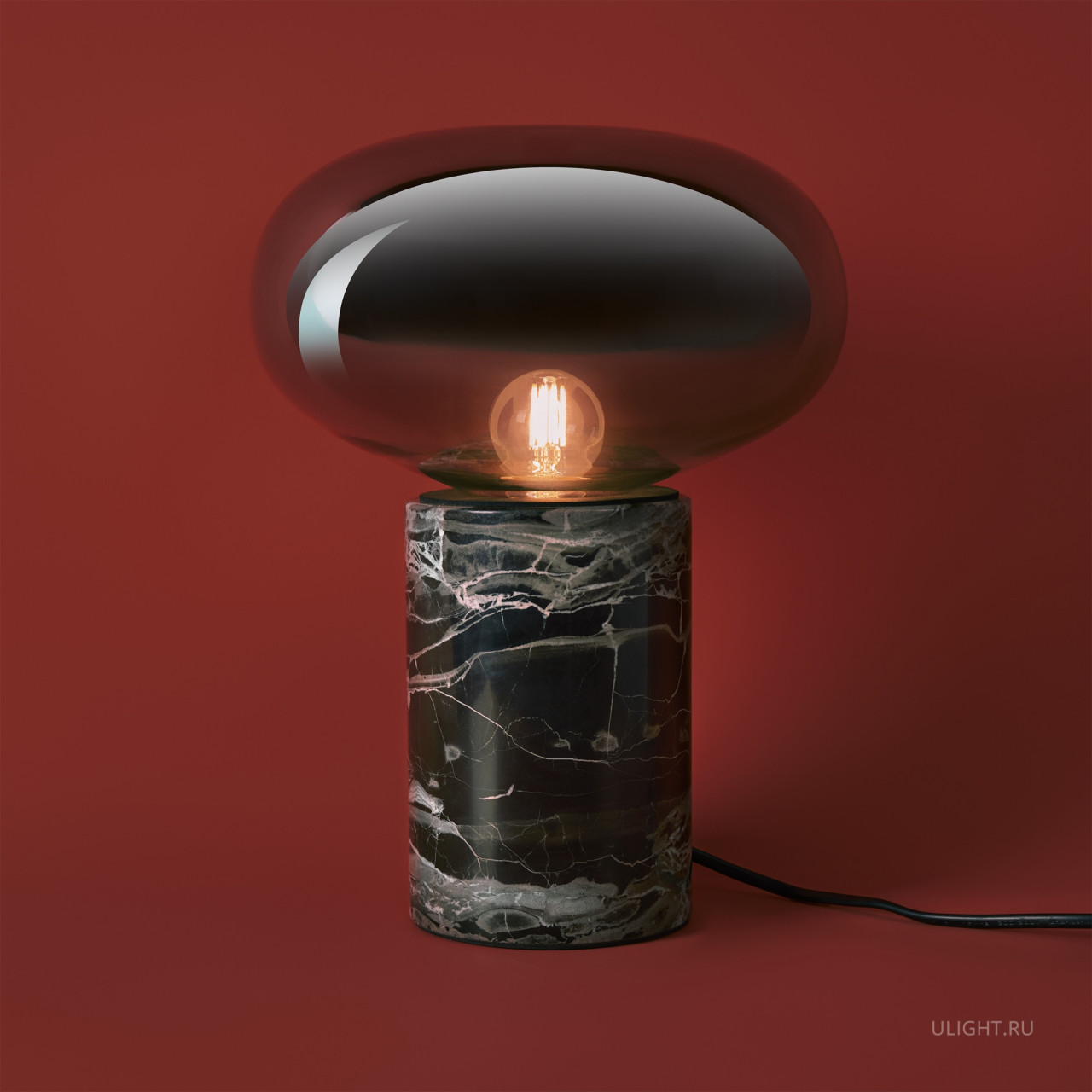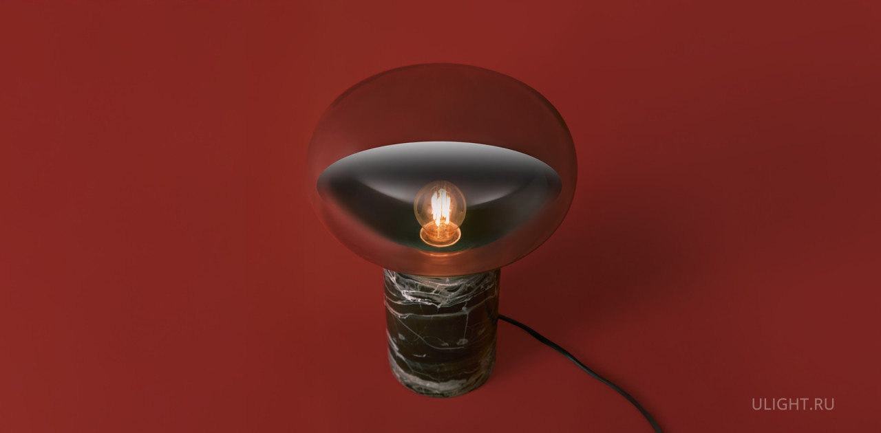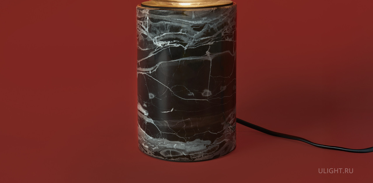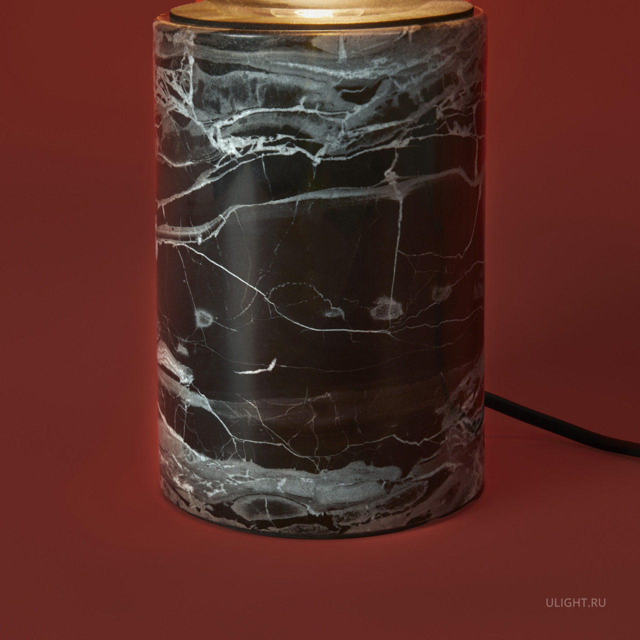 Материал основания мрамор натуральный, цвет — черный со светло-серыми прожилками. Плафон из гальванизированного серого стекла. Компактный размер настольной лампы из мрамора и стелка идеально впишется в интерьеры в современном и midcentury стиле.
