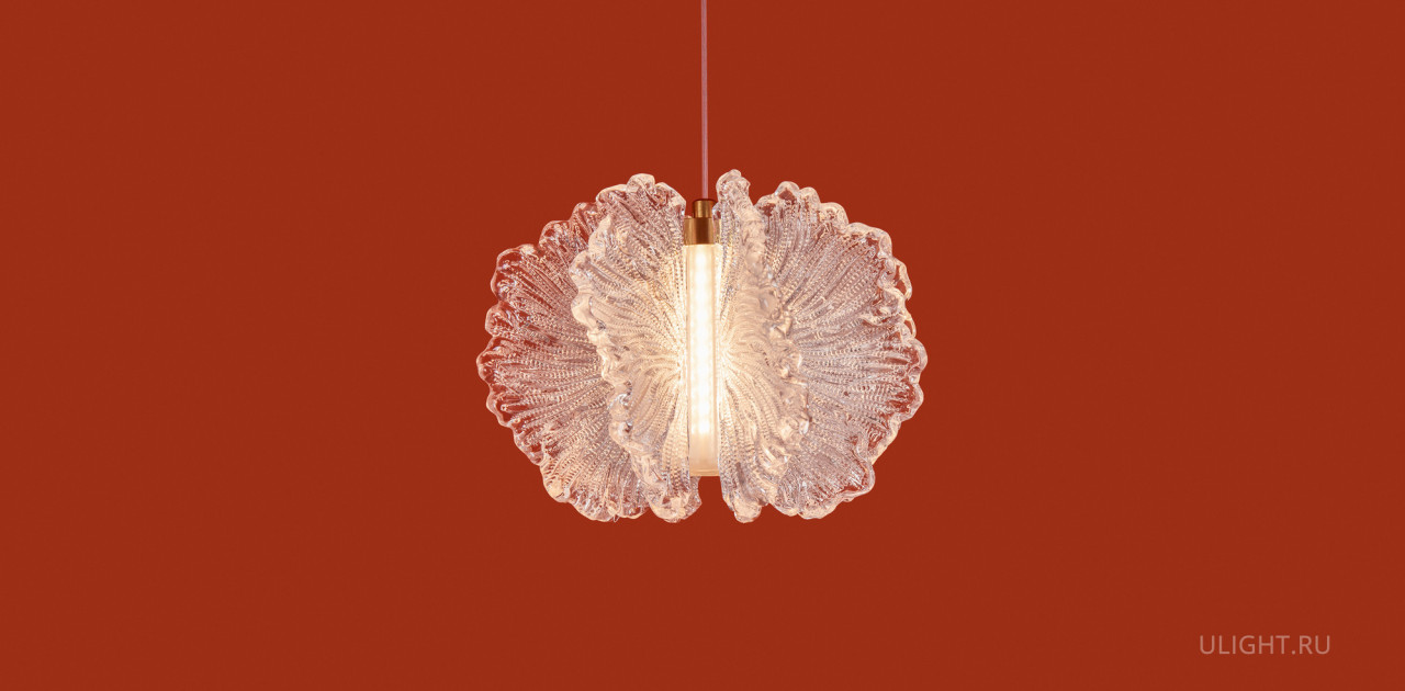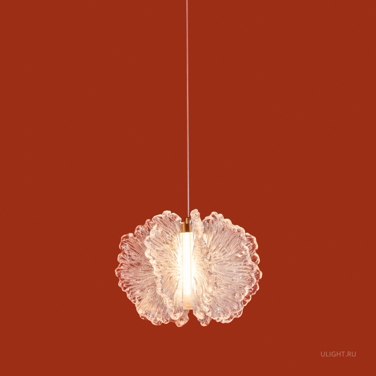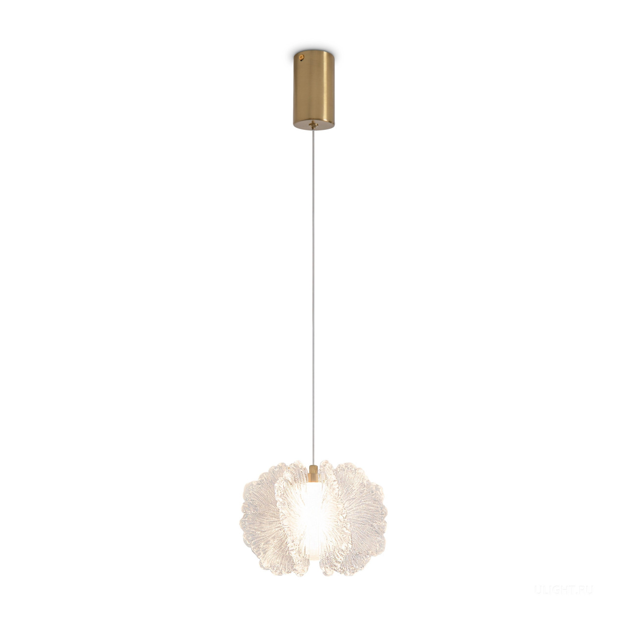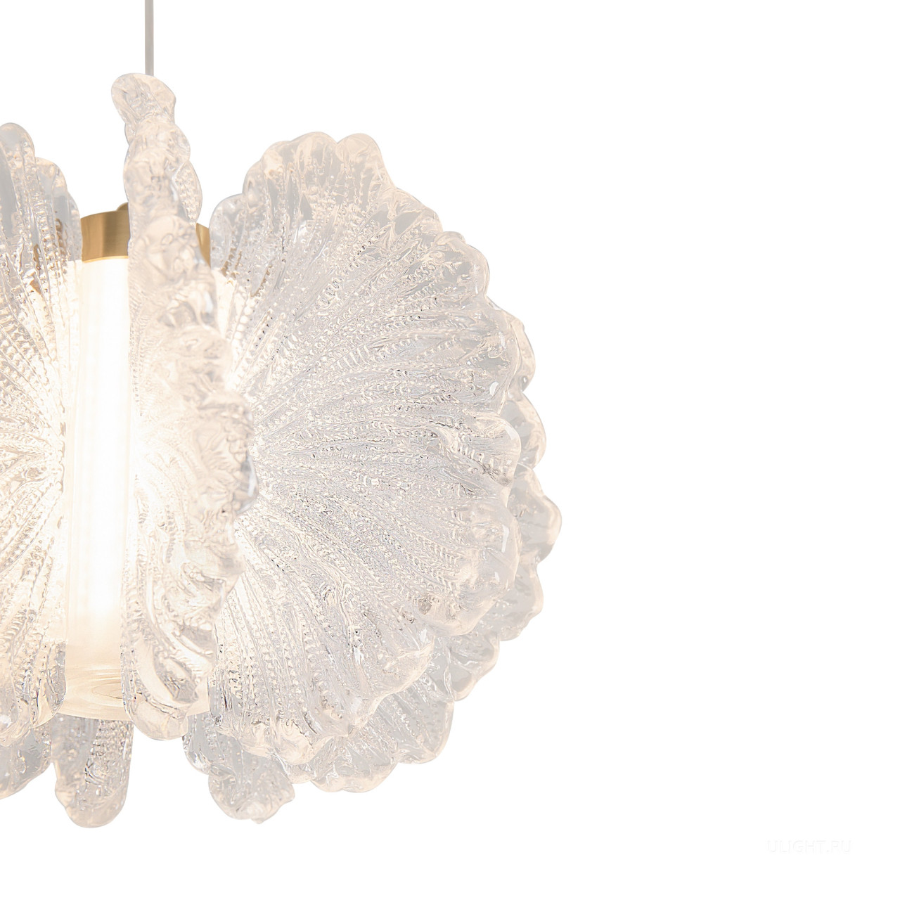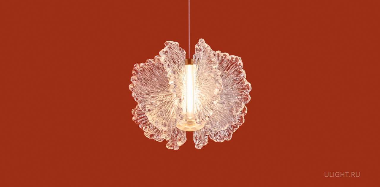 Подвесные светильники Flower: воздушные акриловые плафоны на металле. Встроенные LED (2700K), угол рассеивания 120°. Высота 1200 мм. Два варианта подвесов: каскадный и одинарный.