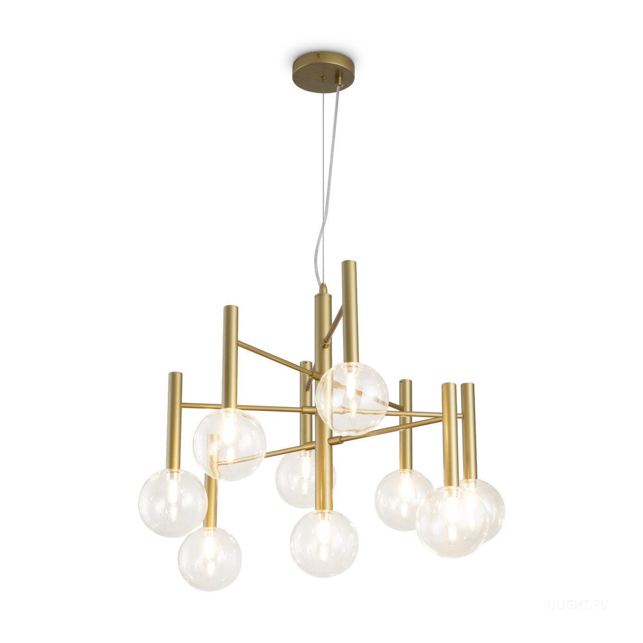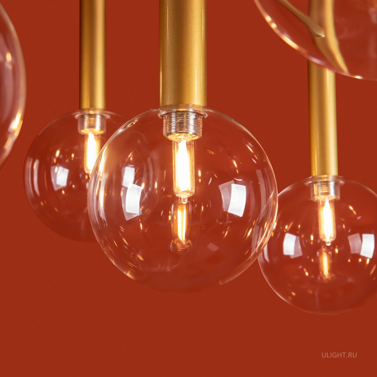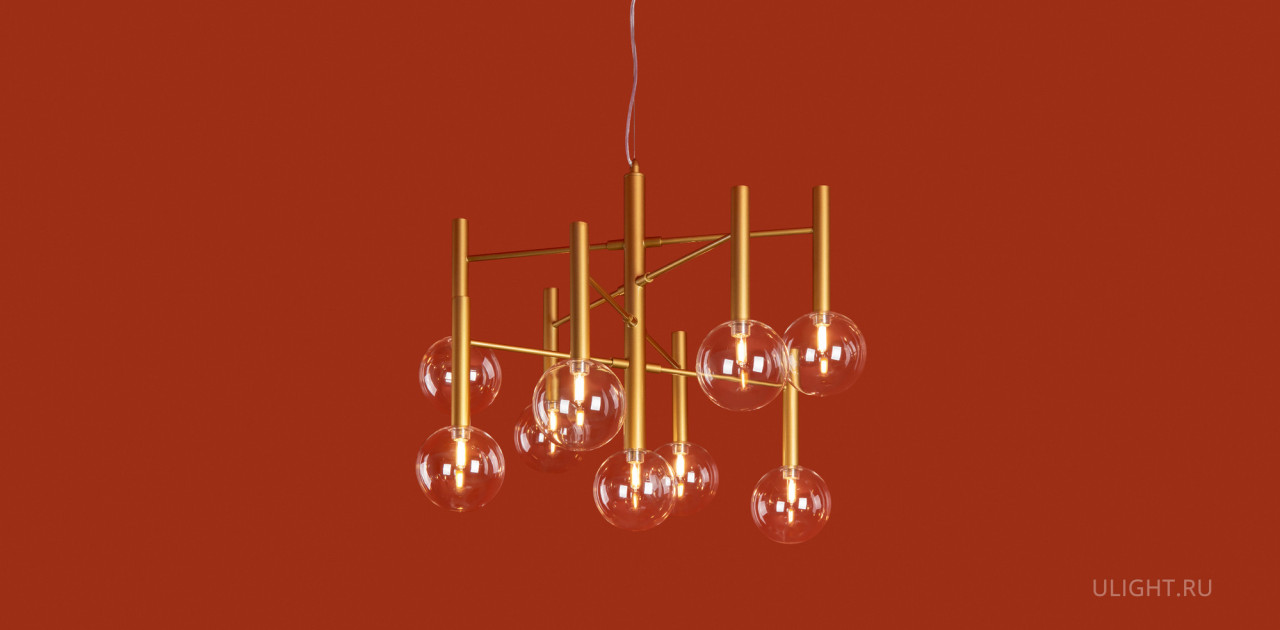 Арматура - металл в цвете матовое золото. Светильники с прозрачным дутым стеклом. LED источник света (2700K). Круглые стеклянные абажуры создают тёплый свет. У настенного светильника 2 источника света.