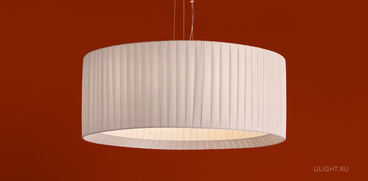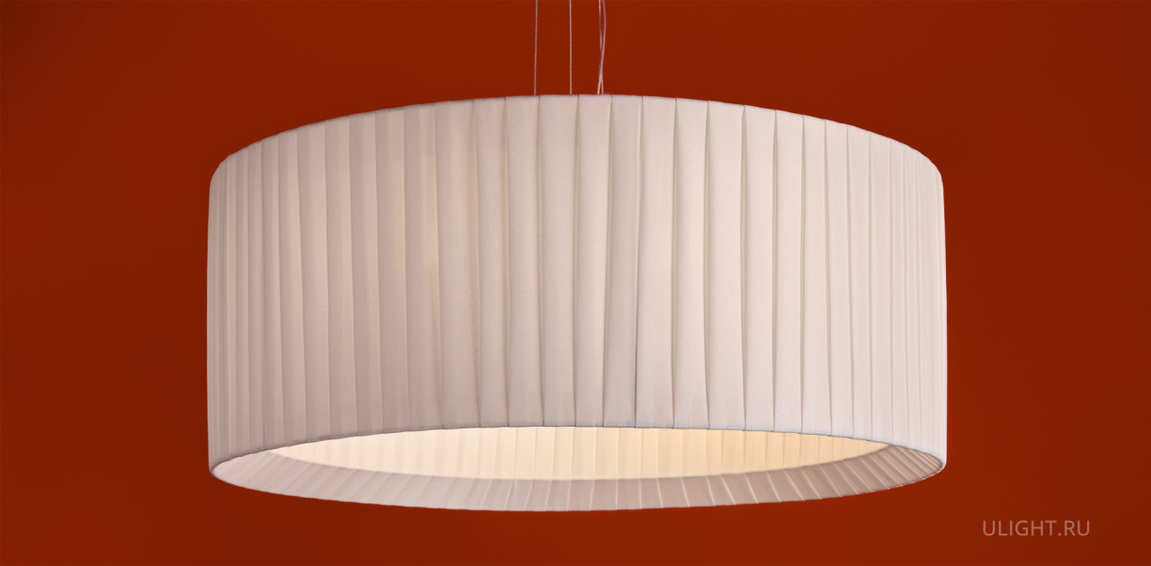 Металлическая арматура в цвете латунь. Подвесные светильники 2-х форм с плессированными абажурами, дополненные рассеивателем. Лампы E27/E14 (не в комплекте) дают мягкий рассеянный свет.