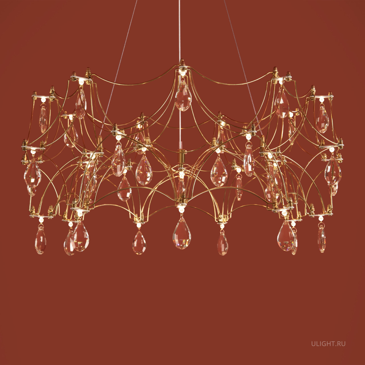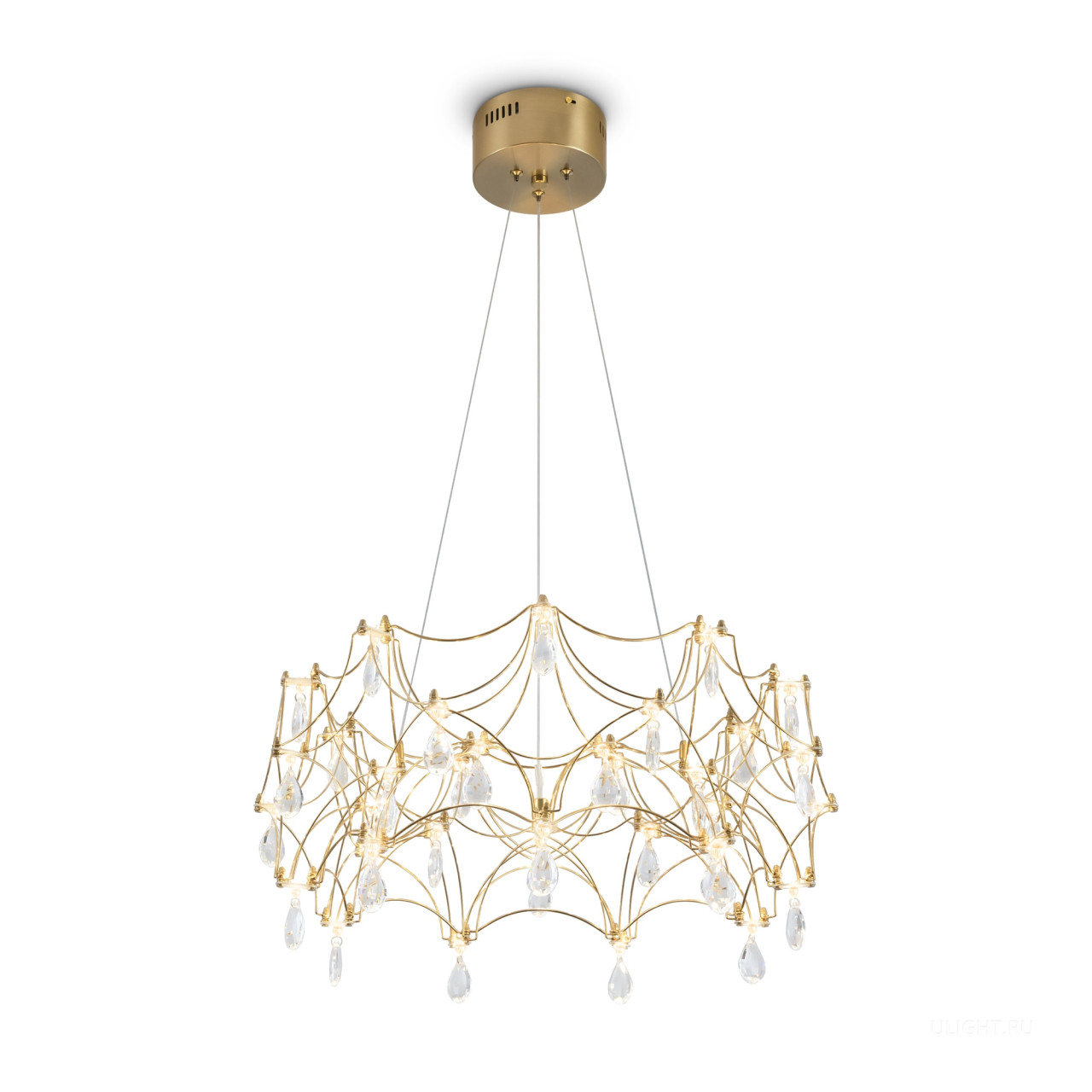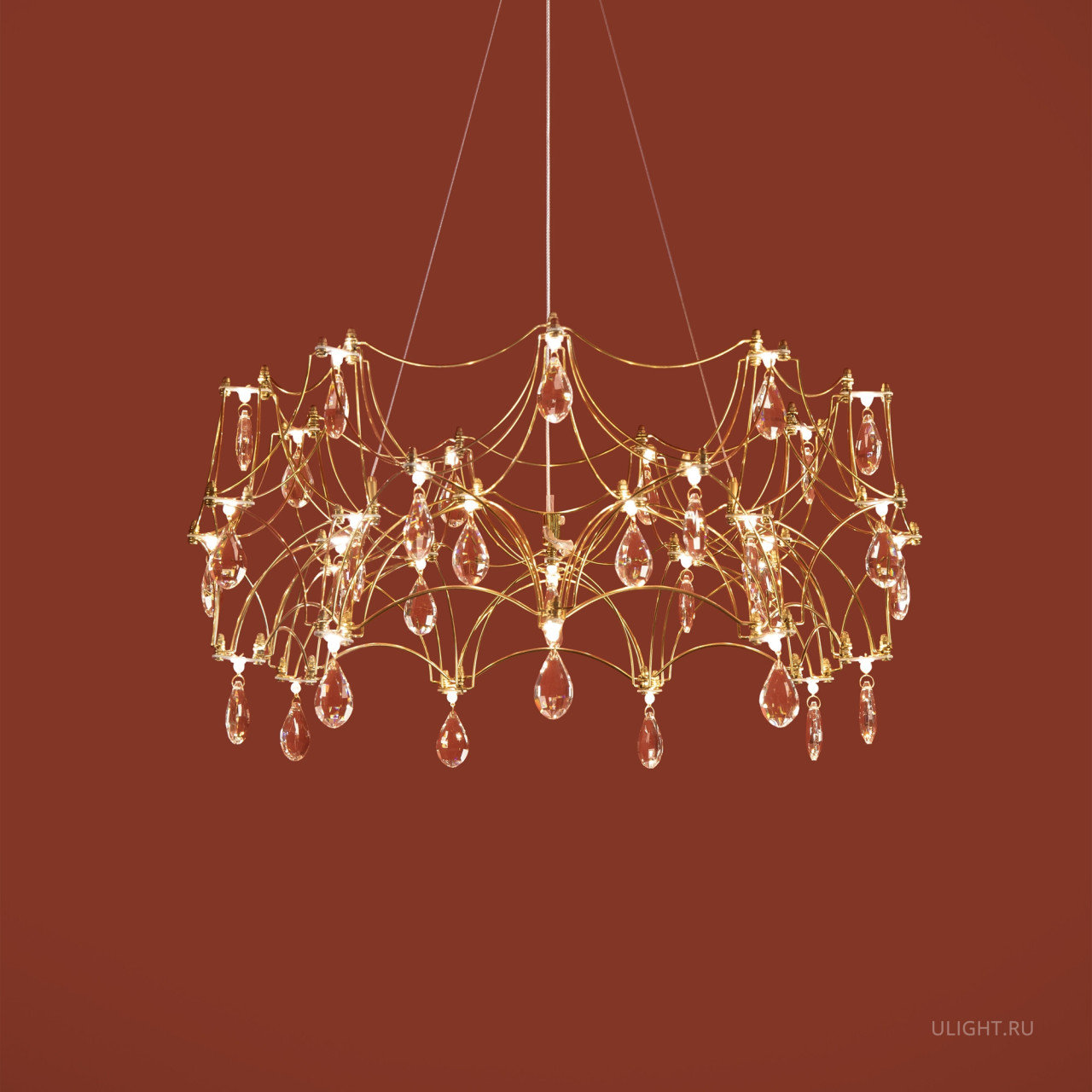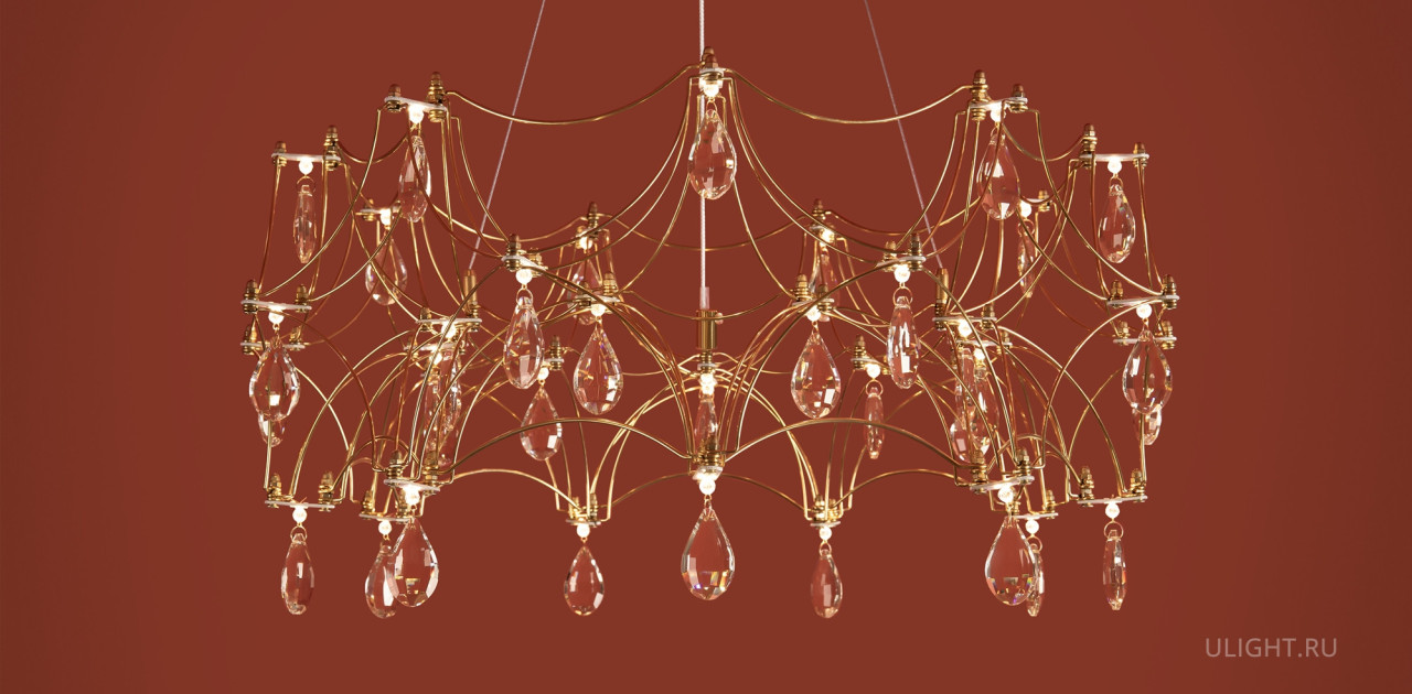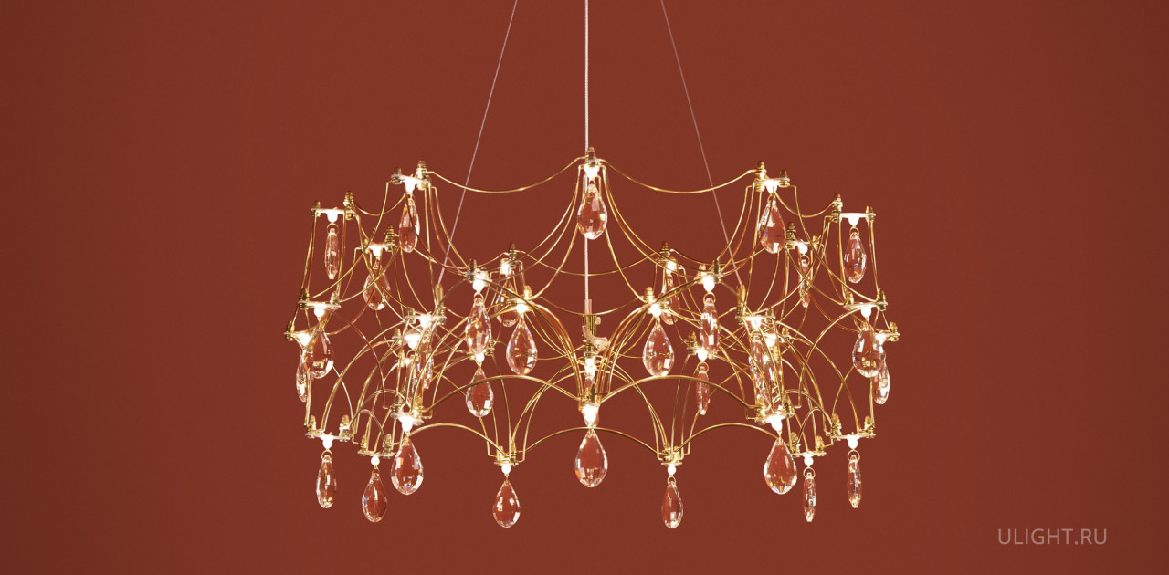 Воздушная конструкция с хрустальными капельками. Металл искусно изогнут и переплетен, образуя причудливый узор. Внутри этой металлической паутины расположены миниатюрные LED источники.