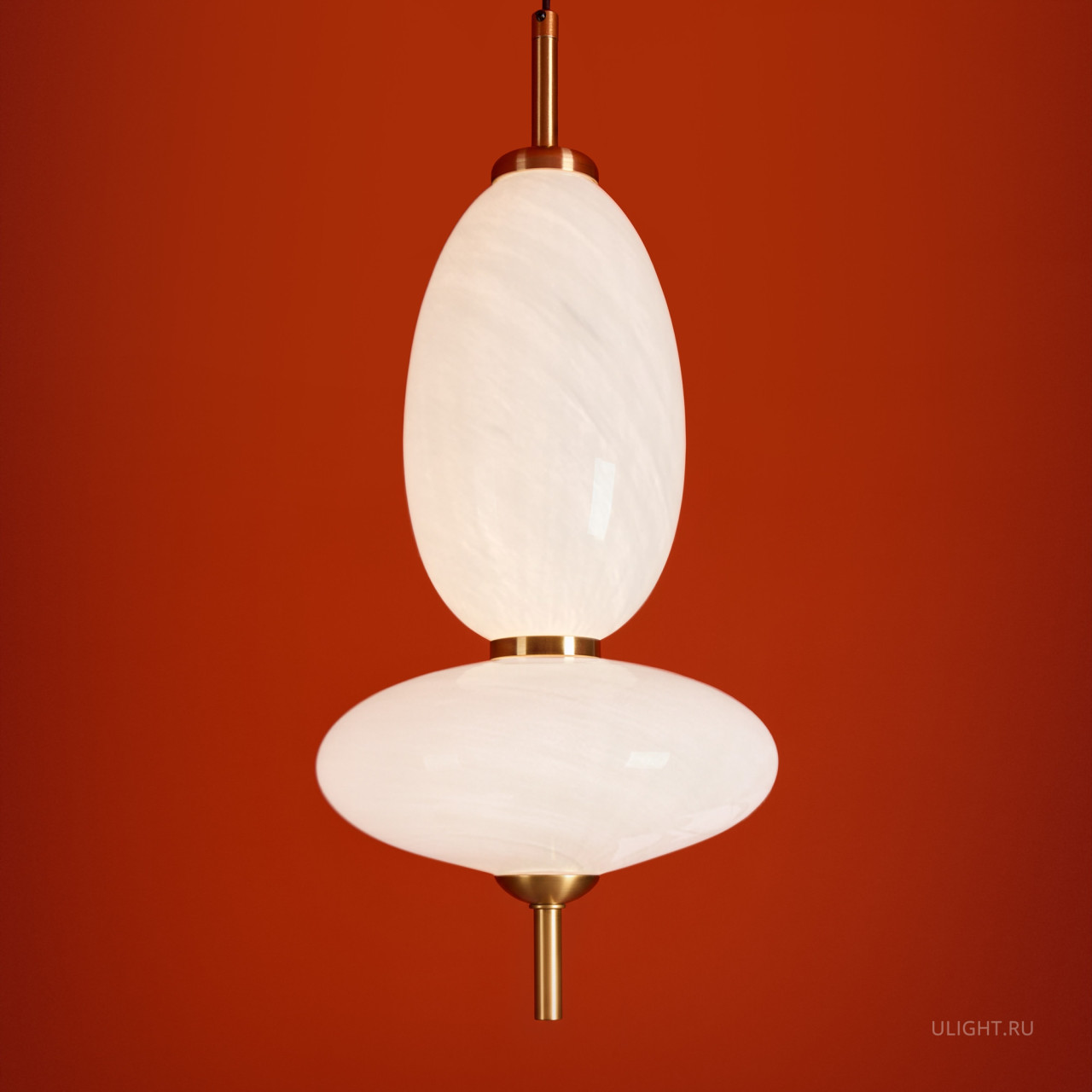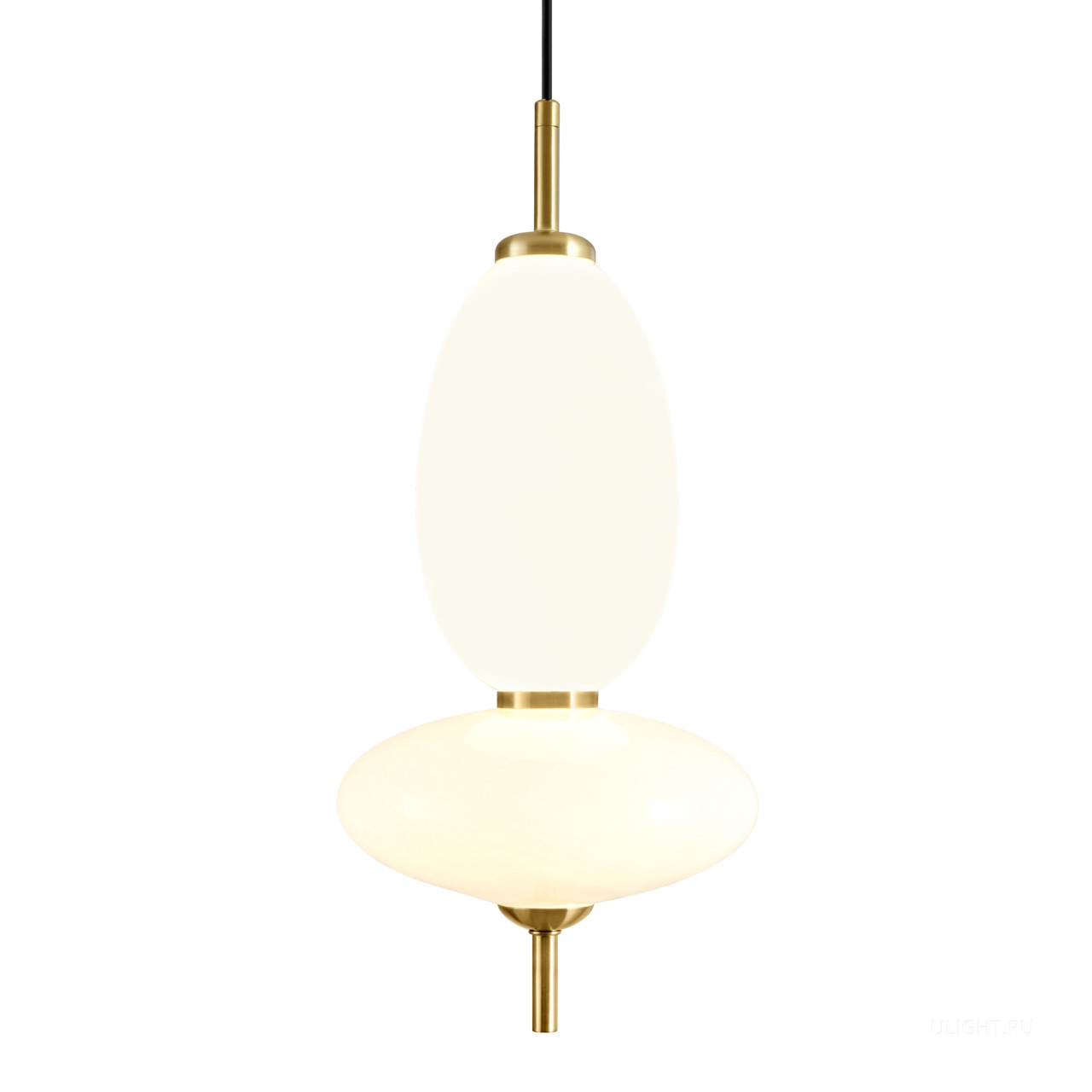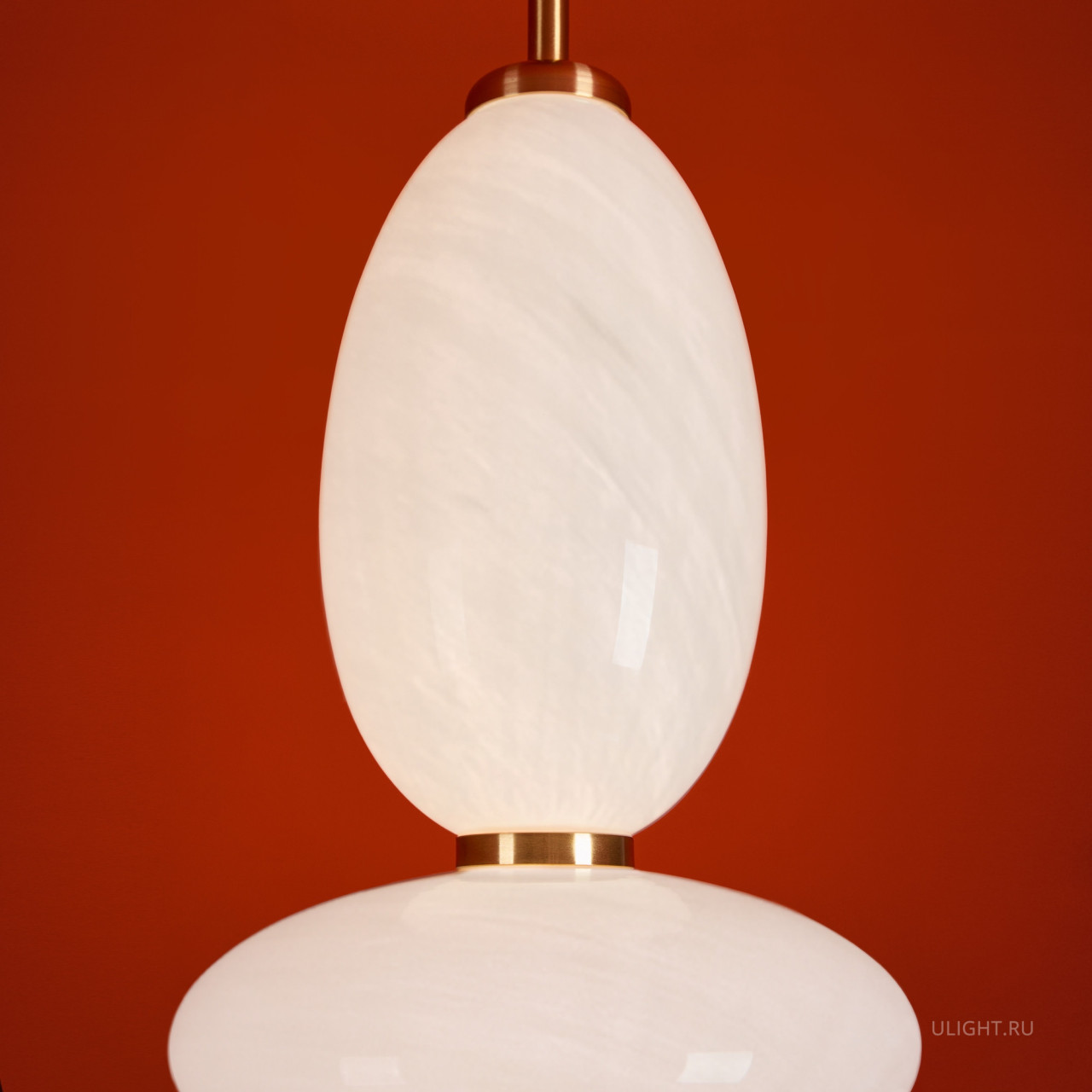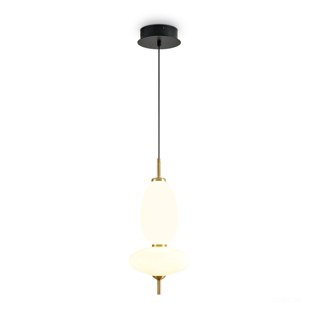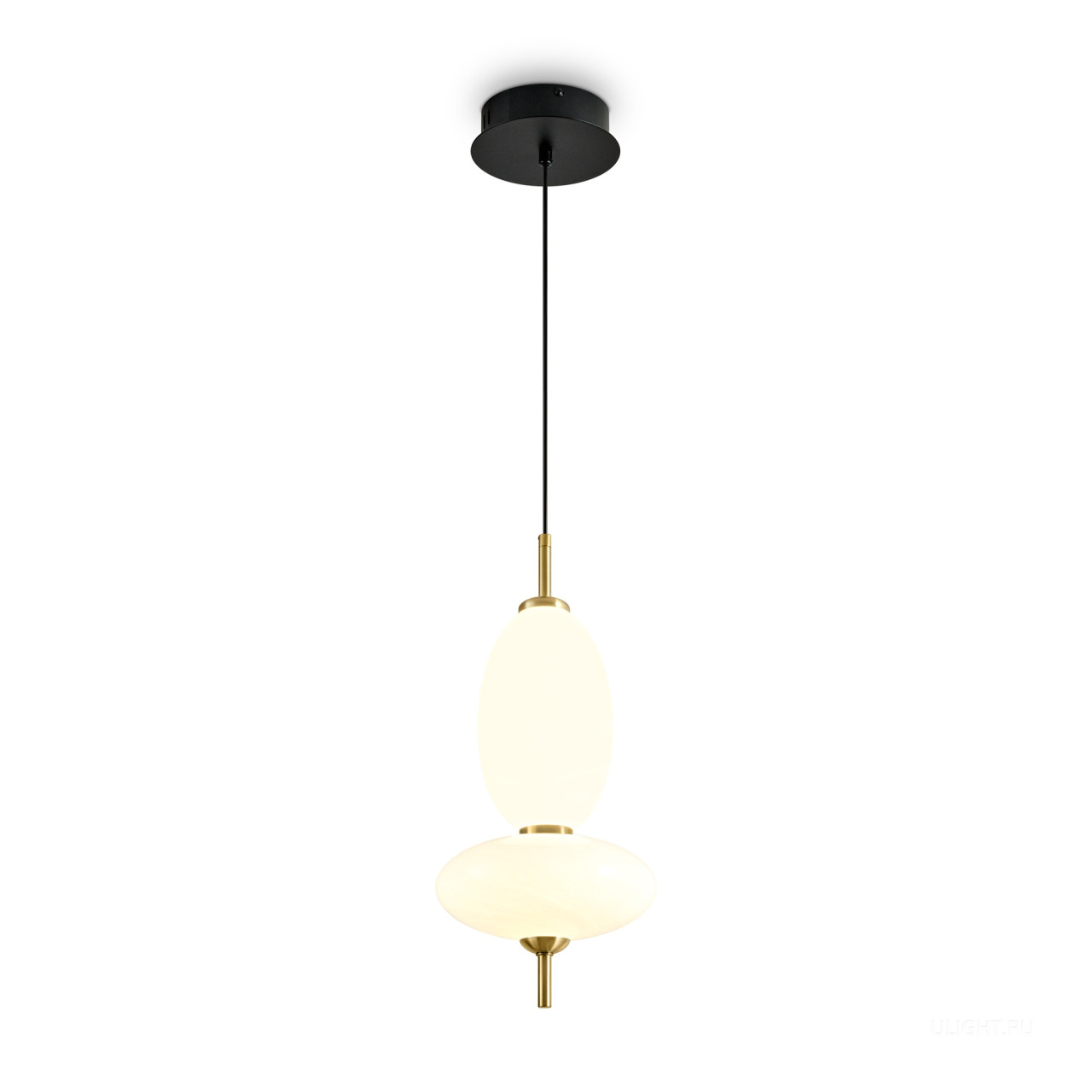 Металлическая арматура черного цвета. Глянцевые белые стеклянные плафоны с перламутровым рисунком и керамическими цветными элементами. LED источник света. Два вида подвеса.
