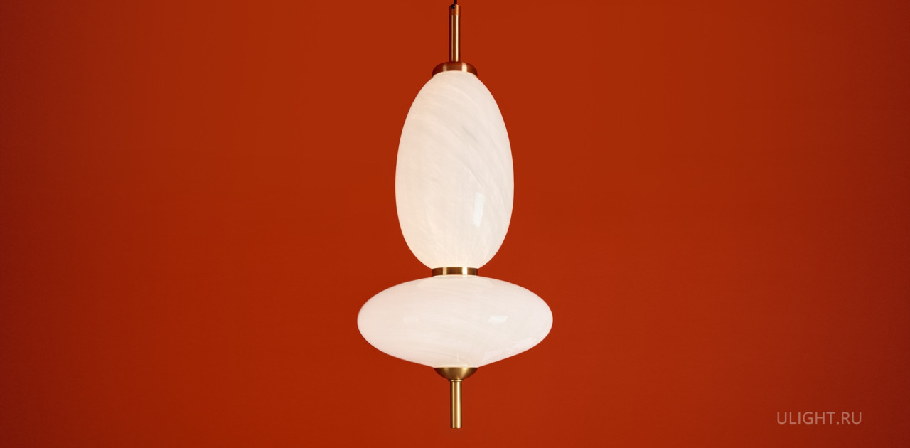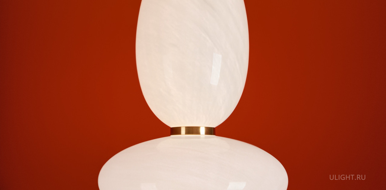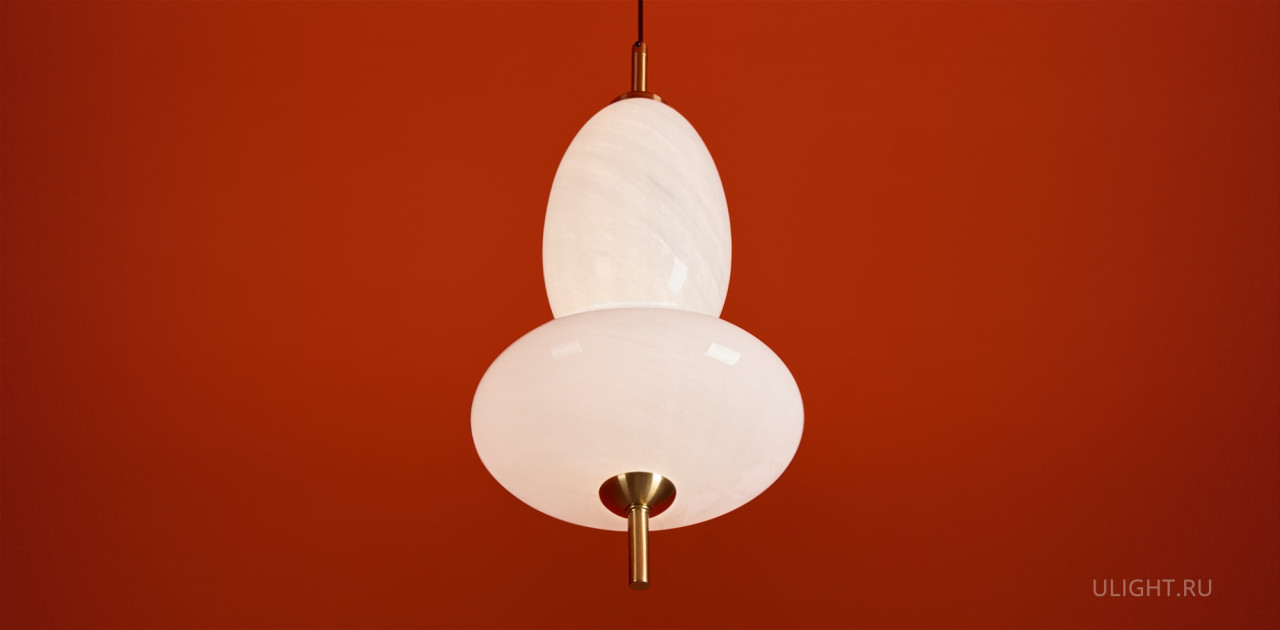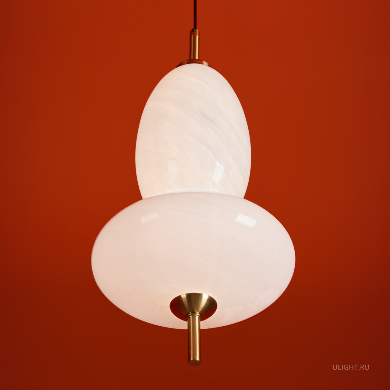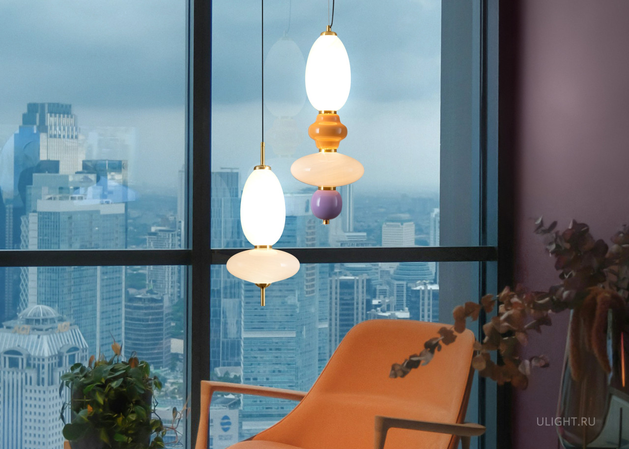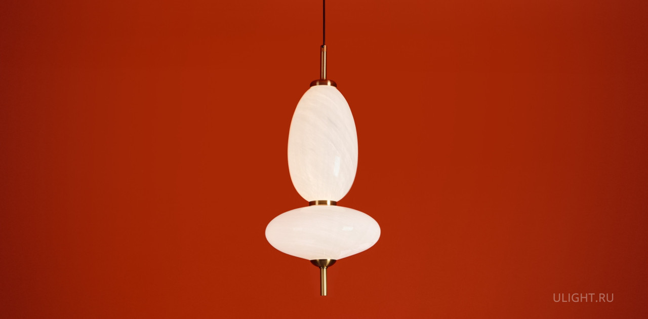 Металлическая арматура черного цвета. Глянцевые белые стеклянные плафоны с перламутровым рисунком и керамическими цветными элементами. LED источник света. Два вида подвеса.