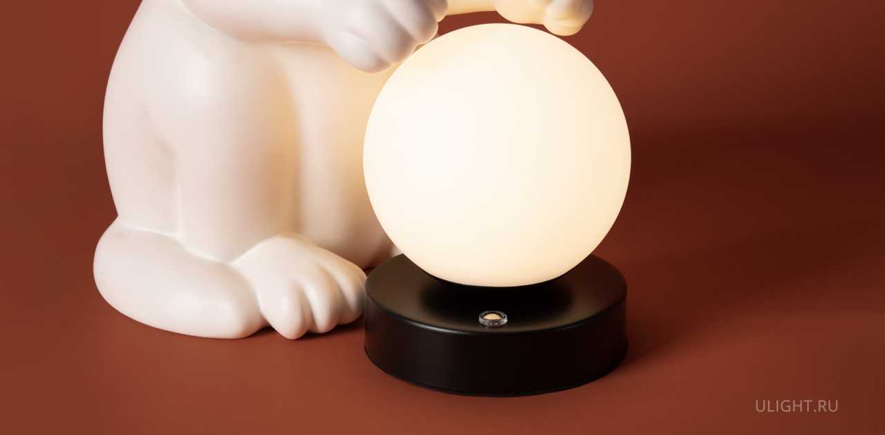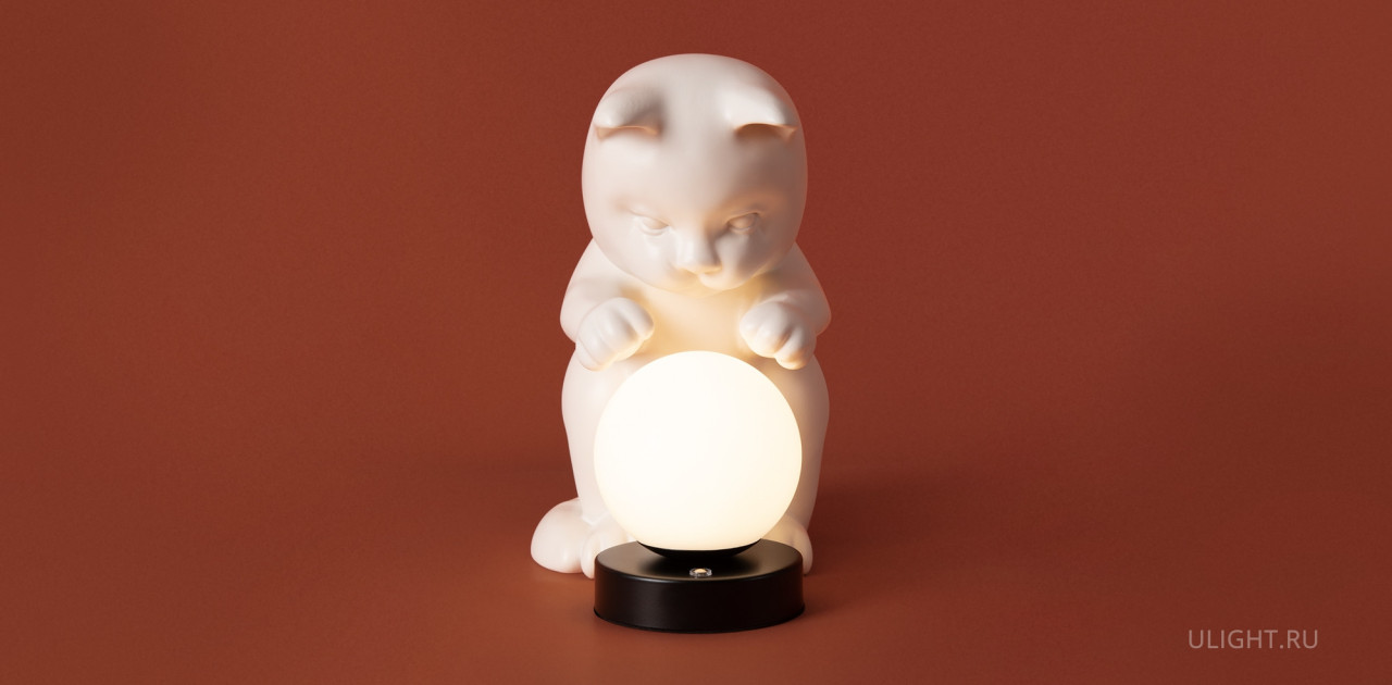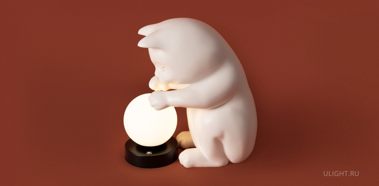 Арматура — полирезин. Абажур из белого матового пластика, форма сферы. Интегрированный LED источник света 3000К. Высота 270 миллиметров. Сенсорное управление. Фигурка котика (RAL 9001) в комплекте.