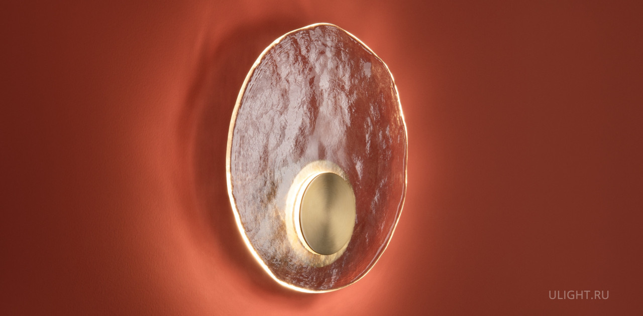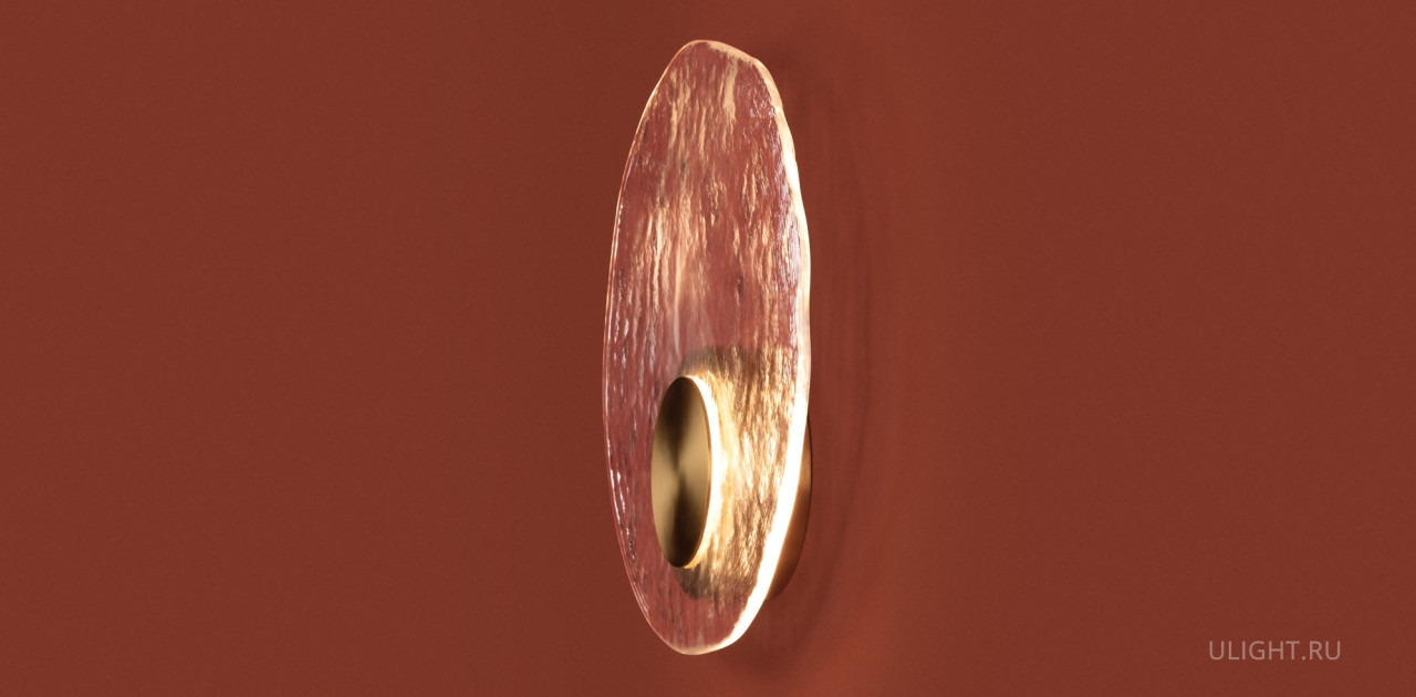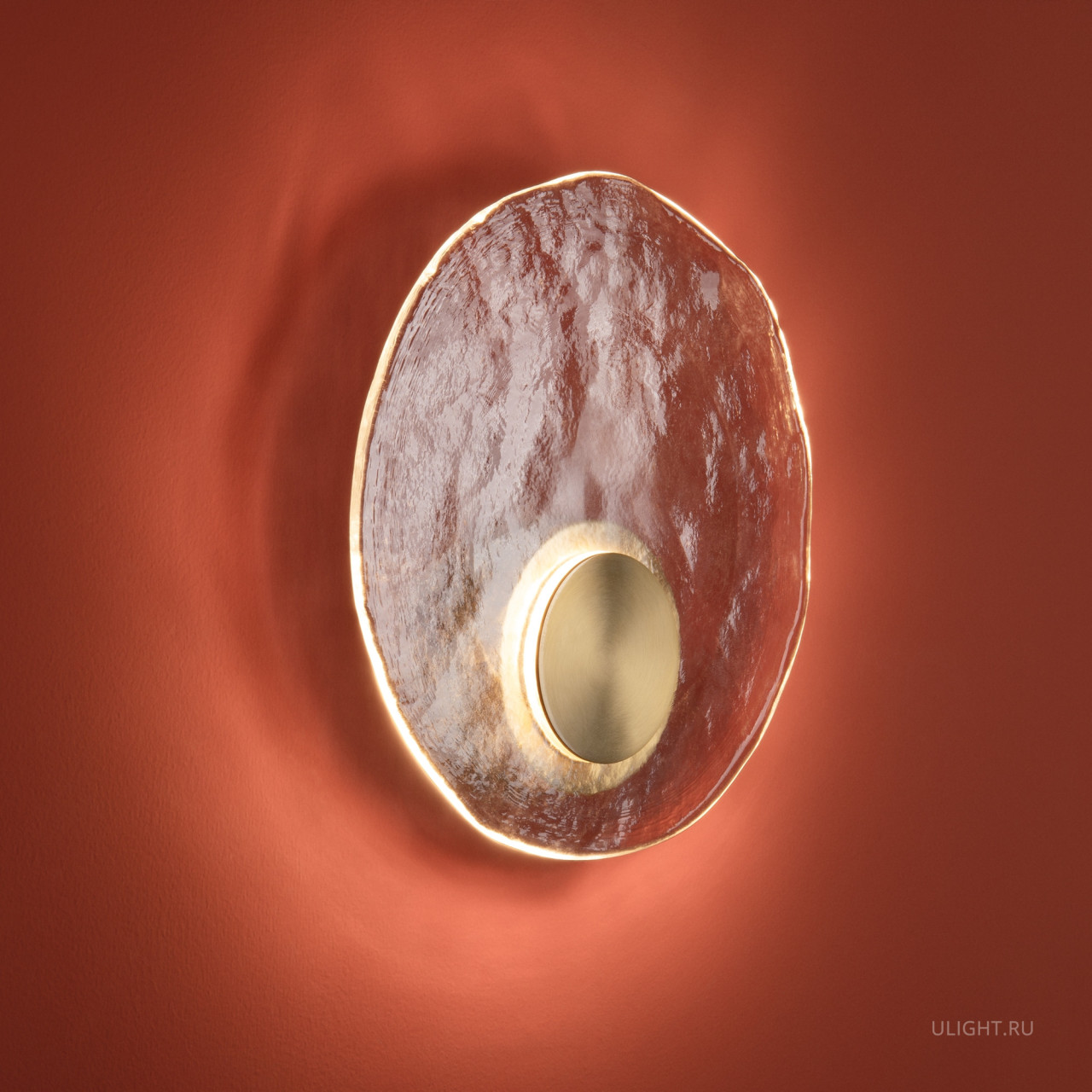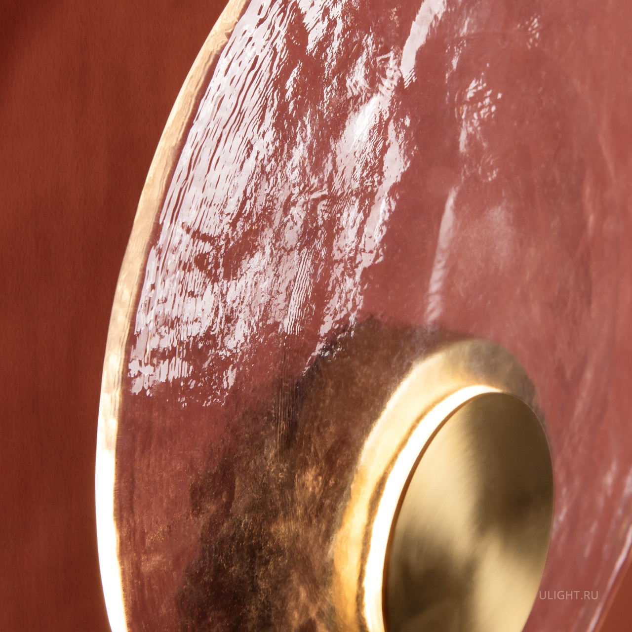 Материал арматуры — металл, цвет — латунь. Настенные светильники оснащены LED-источником света с цветовой температурой 2700К. Уникальное стекло ручного производства обеспечивает равномерное свечение всей поверхности плафона. Для достижения наилучшего светового эффекта рекомендуется использовать в сочетании с основными источниками света.