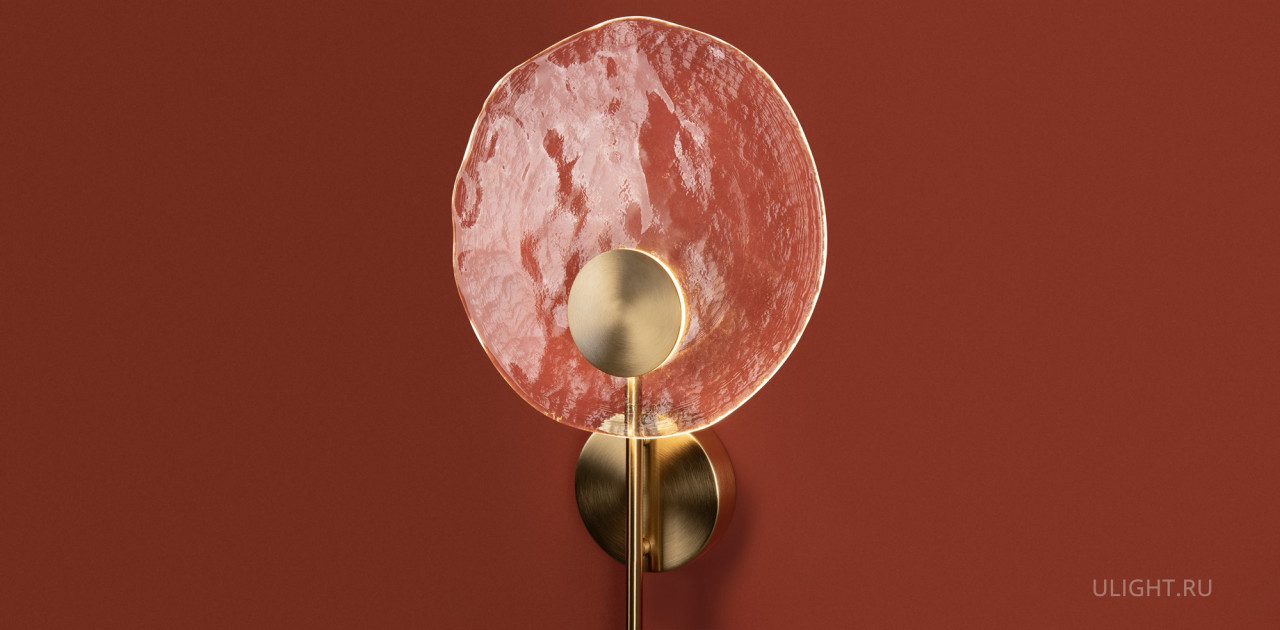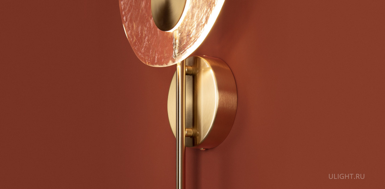 Материал арматуры — металл, цвет — латунь. Настенные светильники оснащены LED-источником света с цветовой температурой 2700К. Уникальное стекло ручного производства обеспечивает равномерное свечение всей поверхности плафона. Для достижения наилучшего светового эффекта рекомендуется использовать в сочетании с основными источниками света.