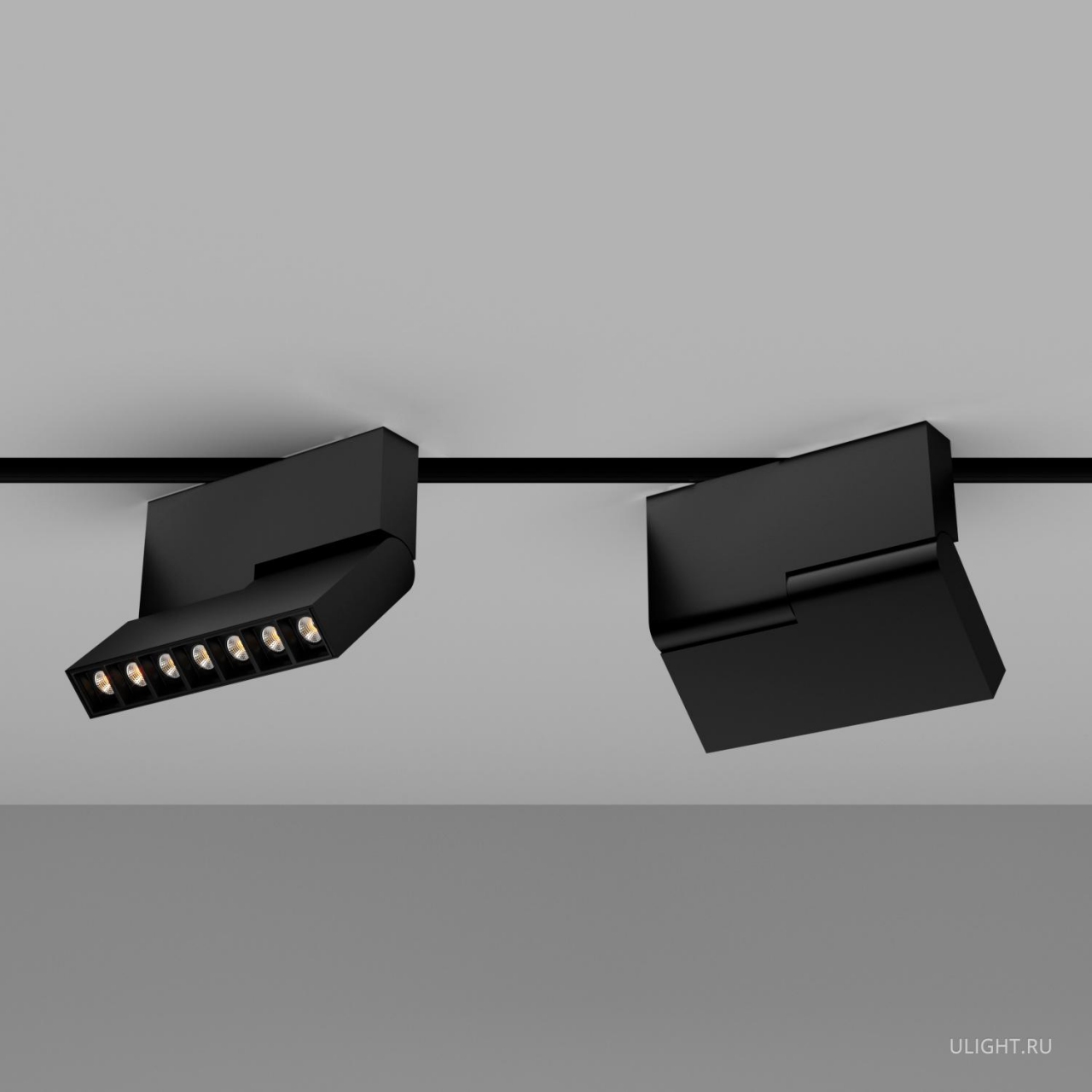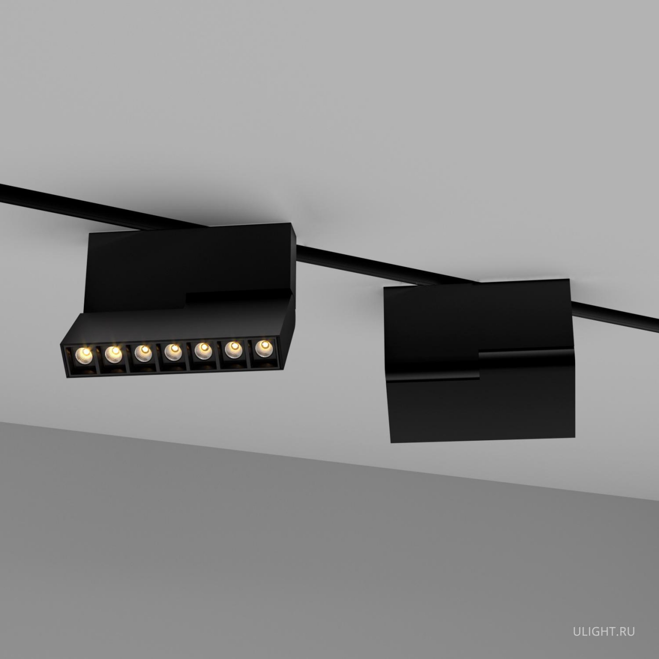 Поворотный механизм линейного трекового светильника позволяет наклонять корпус в пределах 135° и 180°, направляя свет в нужную сторону. Светильник представлен в черном и белом цвете.