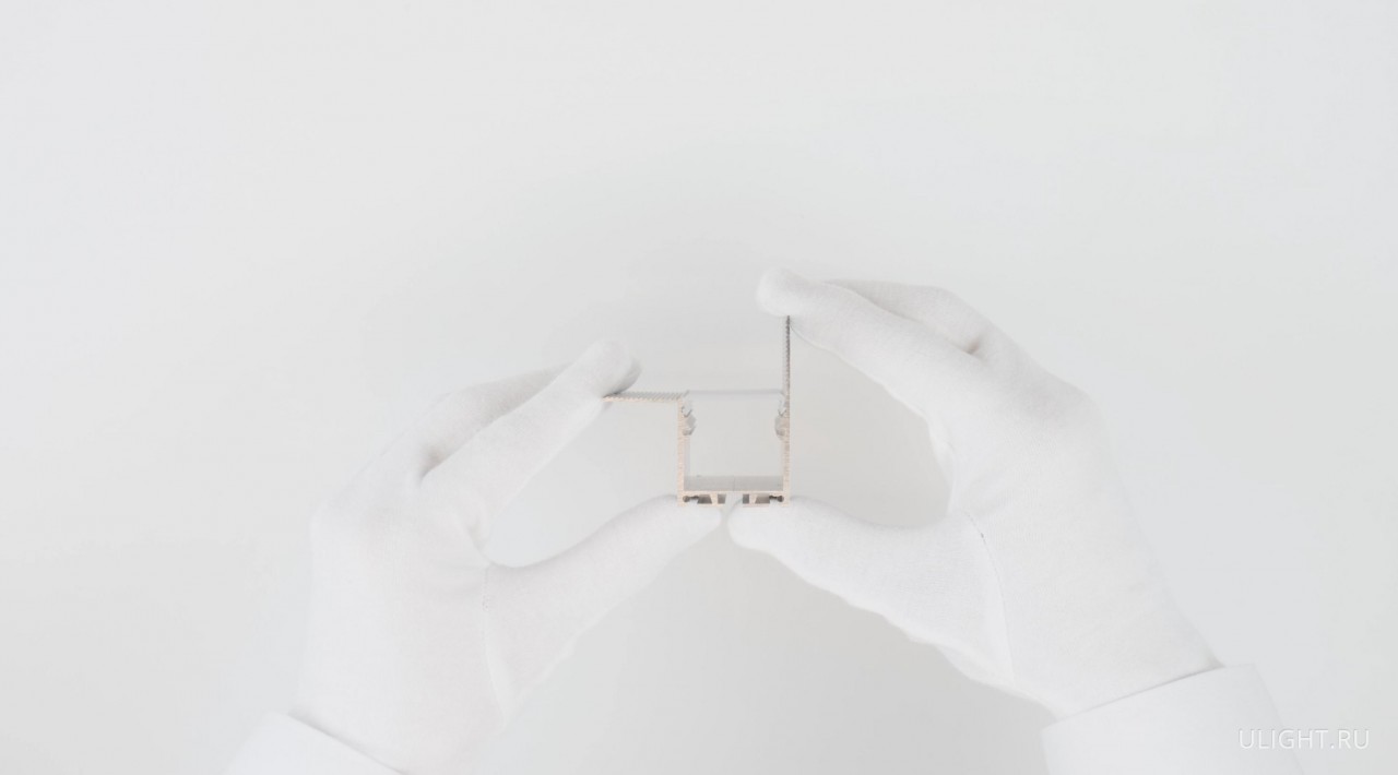 Профиль изготавливается из алюминиевого сплава 6063 (АД31 // ГОСТ 4784-97) и проходит закалку на прессе с достижением максимально прочного состояния Т6. Поверхность обрабатывается на итальянской линии анодирования «Qualanod» – корпус светильника обладает высокой стойкостью к царапинам и коррозии.