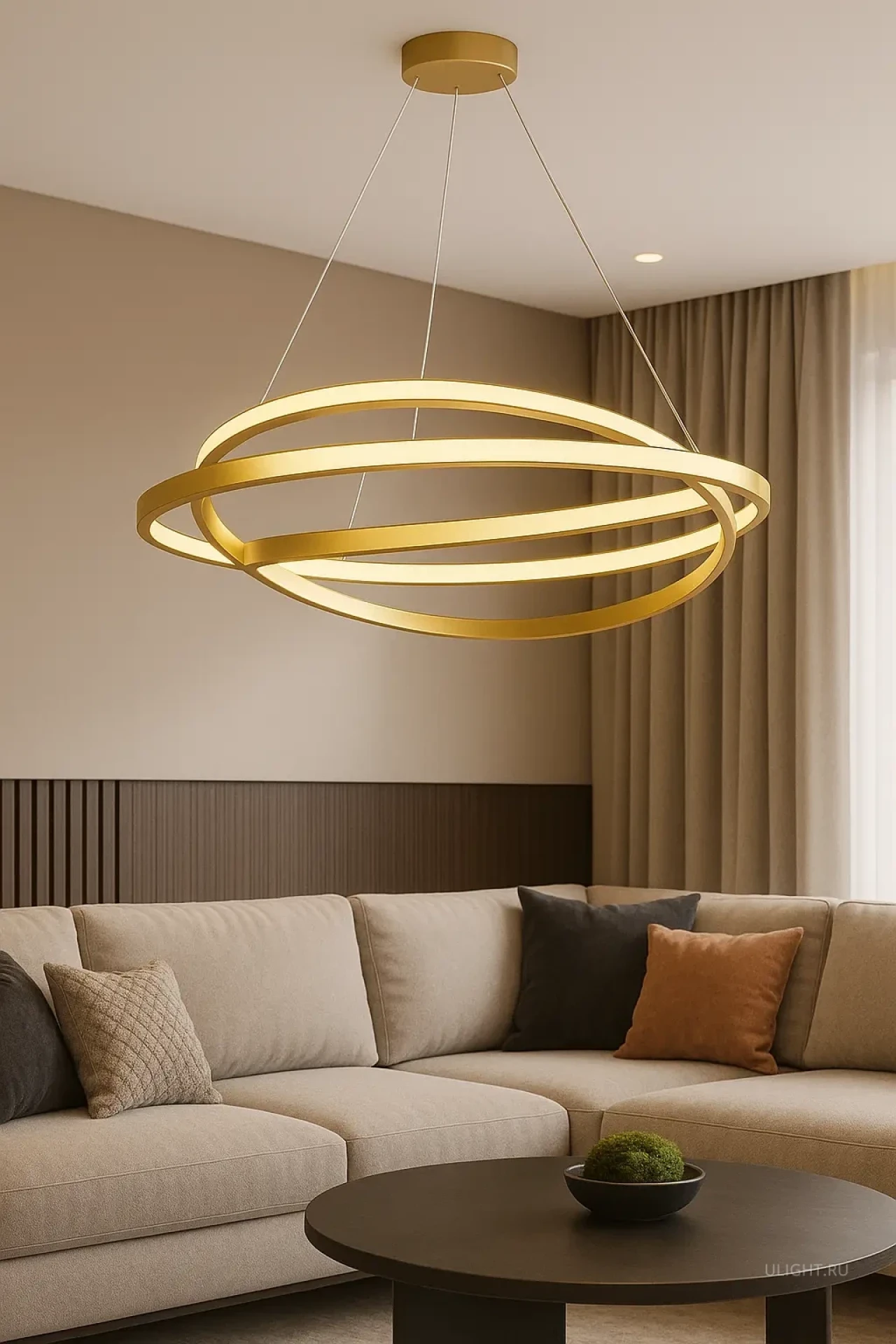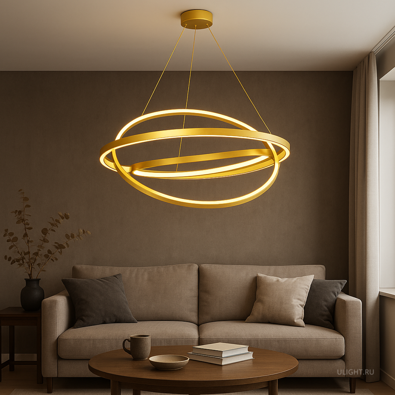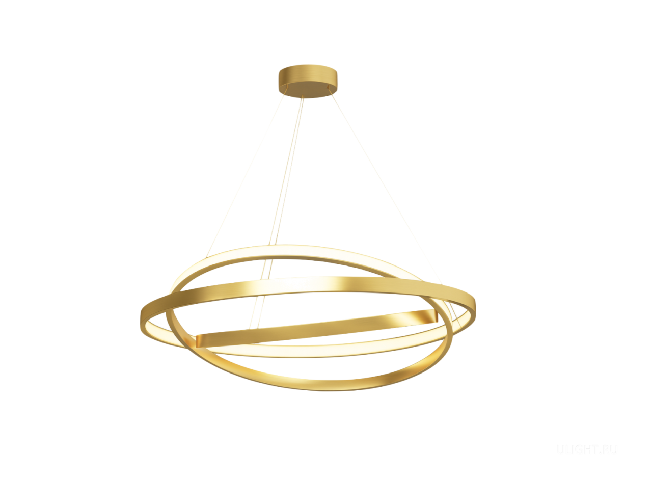 Эта люстра — воплощение динамики и гармонии света. Её плавно пересекающиеся кольца образуют изящную композицию, будто застывшее движение. Матовая золотая поверхность мягко отражает свет, создавая ощущение тепла и утончённости.