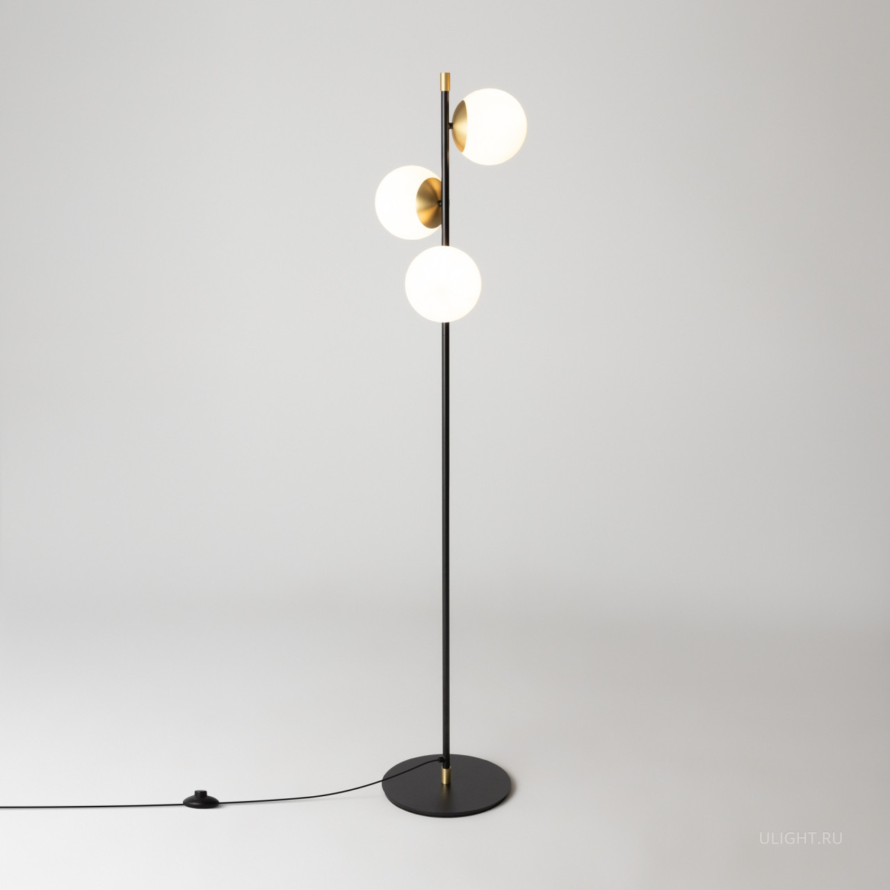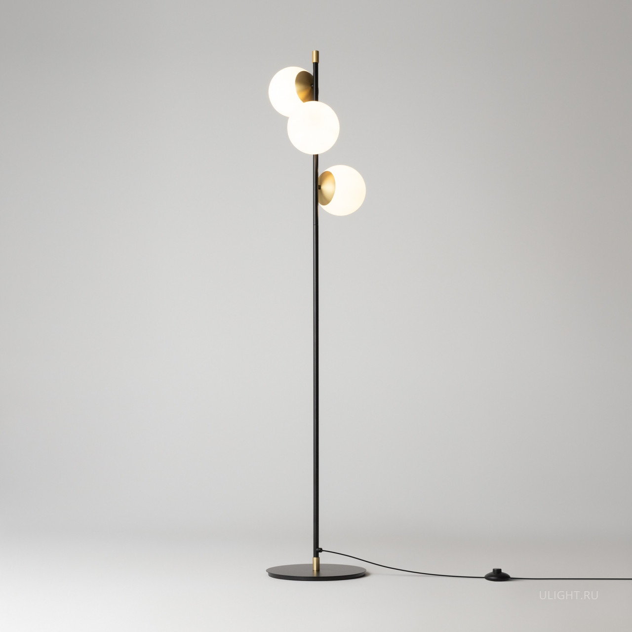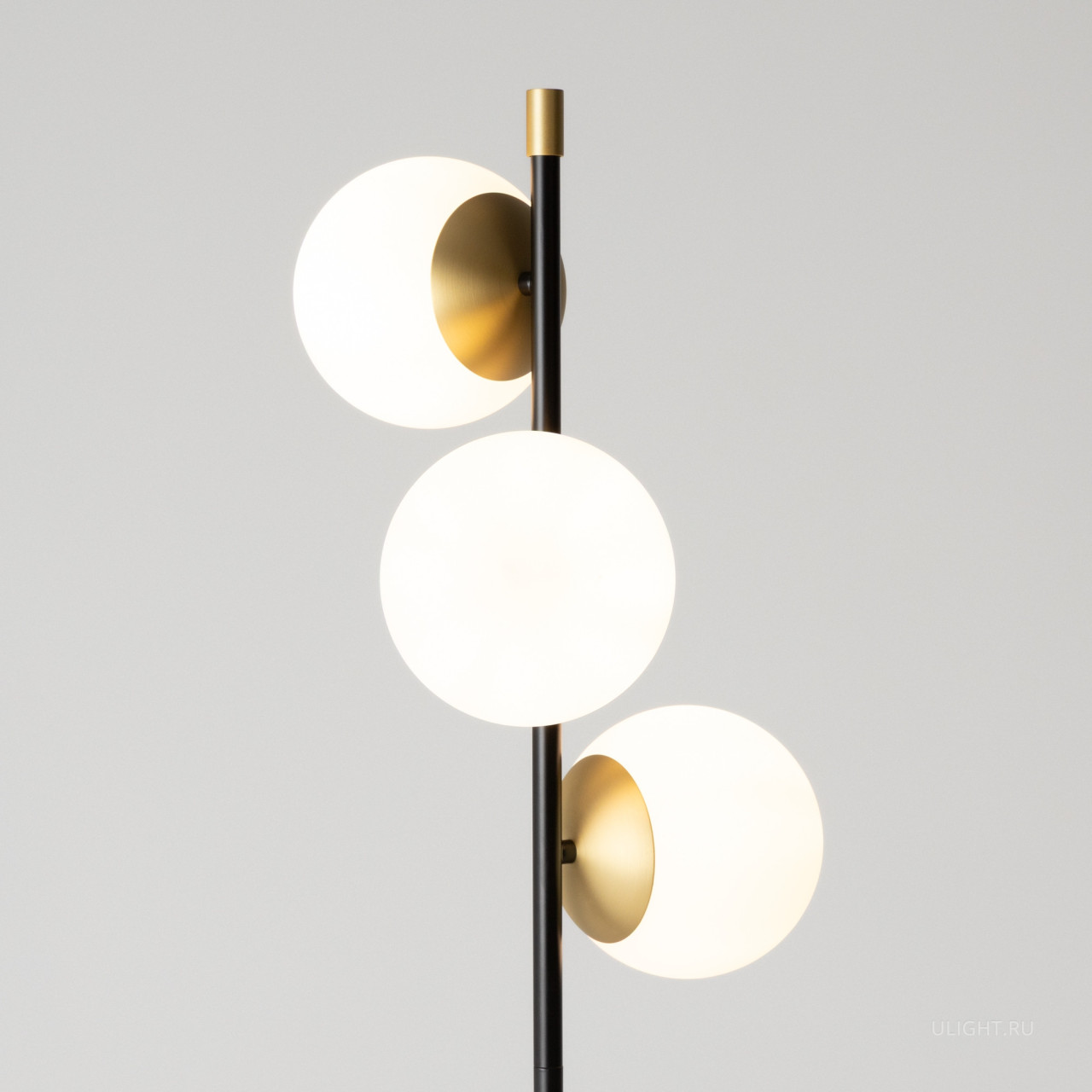 Арматура из металла в цвете матового золота. Плафоны-сферы из матового выдувного стекла. Модная асимметрия в дизайне. Источник света — лампы с цоколем Е14.