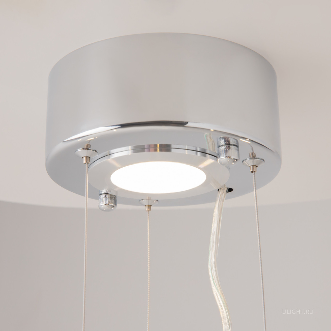 Материал арматуры – металл, цвет – хром. Декоративные рожки из прозрачного стекла. Трендовые обтекаемые формы в дизайне. Высота подвесных люстр регулируется тросом.