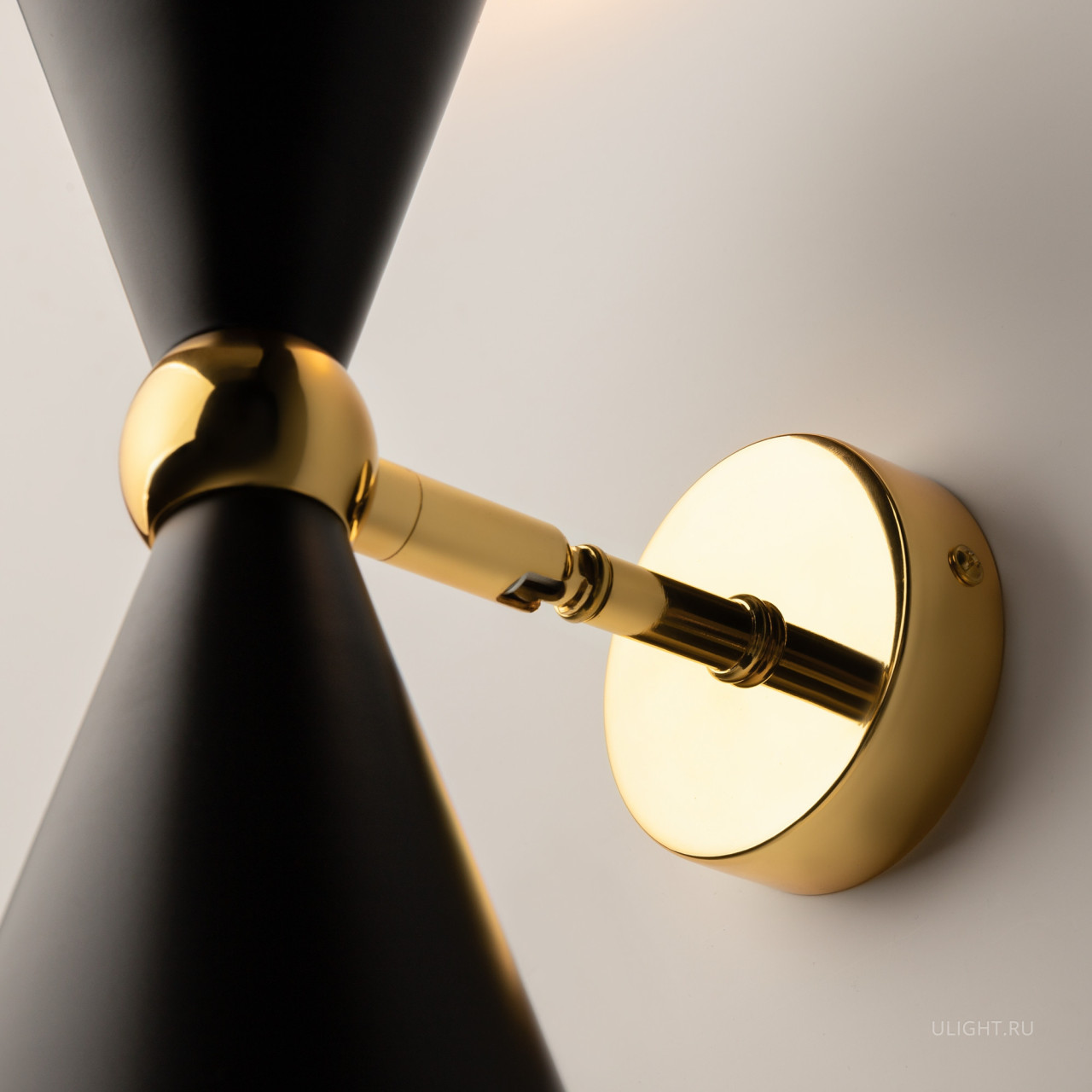 Материал арматуры - металл, оттенок – золото. Металлические плафоны изнутри окрашены в золотой цвет. Внешняя сторона в двух вариантах оттенков: черный и белый. Поворотный механизм, рожки вращаются.