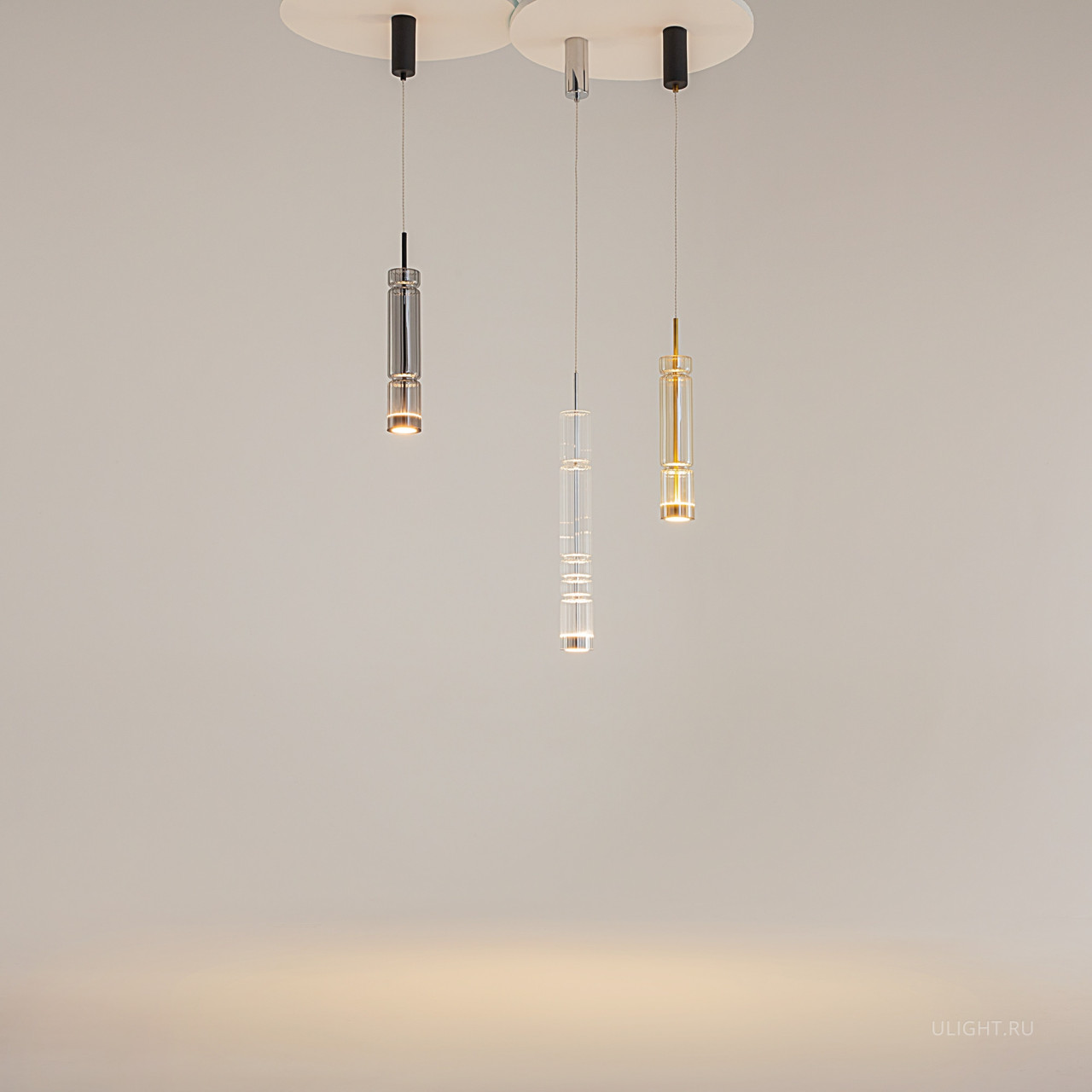 Арматура - металл, цвет - хром, черный. Цилиндрические плафоны из стекла с вертикальным рельефным рисунком в трех оттенках: прозрачный, коньячный, дымчатый. Метафора древнегреческих храмовых колонн в образе светильников. LED-источник света. Цветовая температура 3000К.
