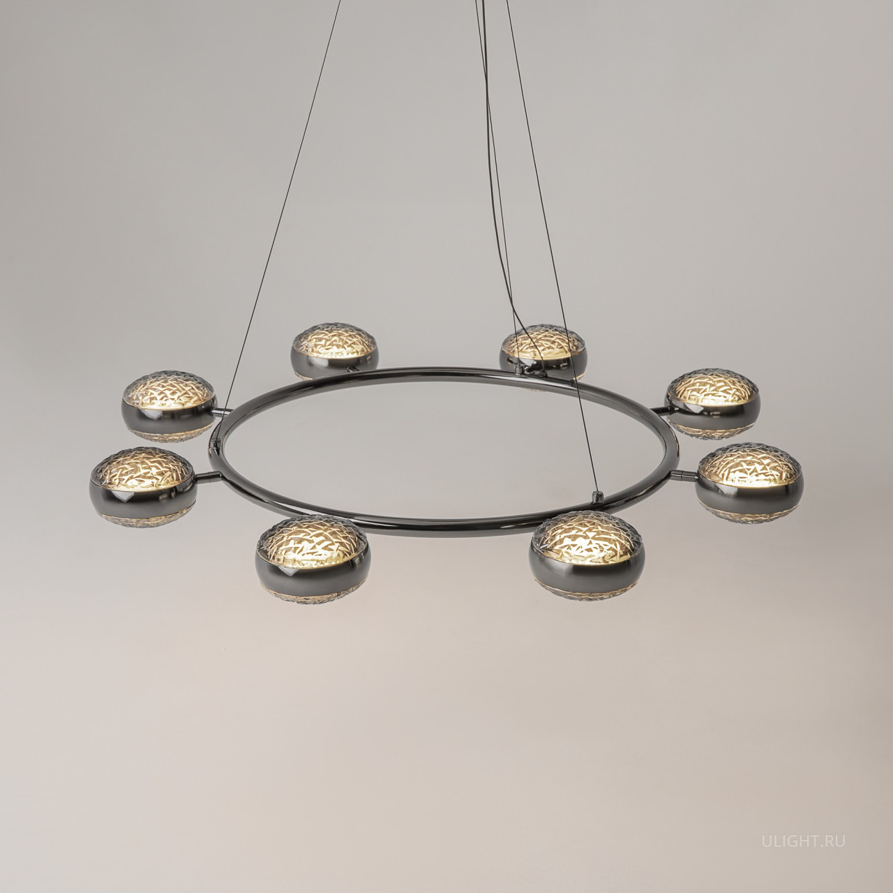 Два цветовых сочетания: сатинированная арматура из металла в цвете латунь в комбинации со стеклянными плафонами янтарного оттенка или трендовый черный хром с глянцевым финишем в сочетании с тонированными светло-серыми плафонами. Источник света: LED. Цветовая температура 3000К, угол рассеивания 120 градусов. Провод длиной 3 м можно регулировать по высоте — светильник подходит для помещений с высокими потолками.