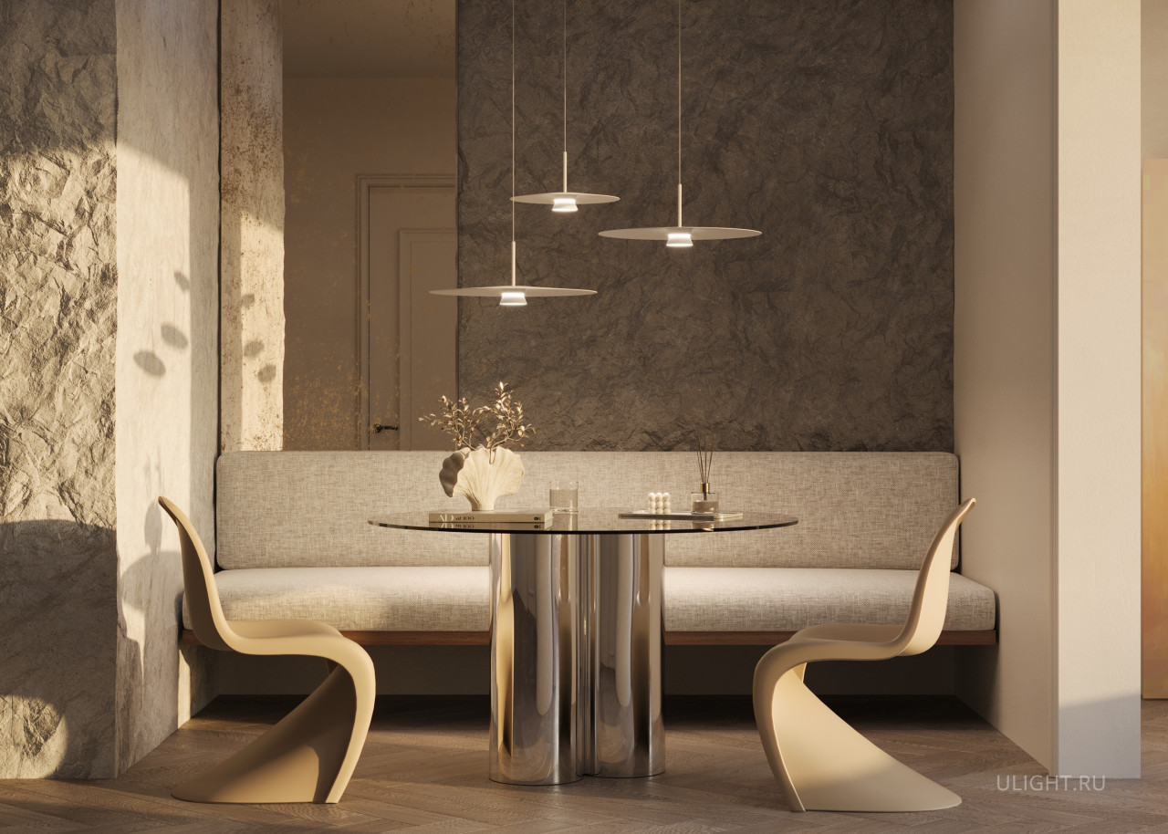 Серия Platte представлена одинарными подвесными светильниками диаметром 350 и 500 мм. Цвет металлической арматуры и плафонов – белый. Источник света – LED. Тип рассеивания — рассеянный. Цветовая температура — 3000 К. Угол рассеивания — 125°. В серии предусмотрен длинный регулируемый провод 3 м.