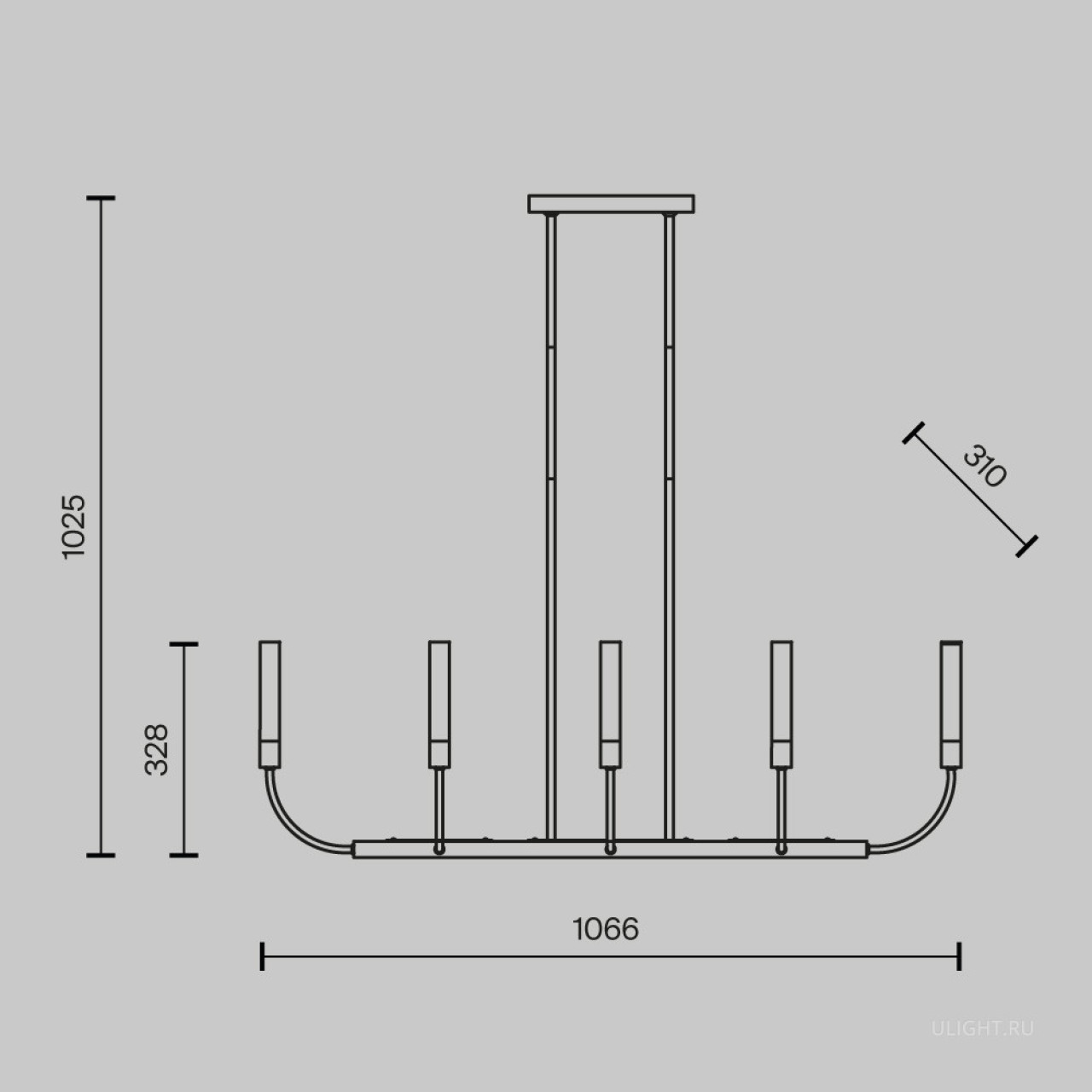 Металлическая арматура. Цвет — латунь. Плафоны-цилиндры — матовое стекло. Трендовый арочный силуэт. В качестве источников света используются лампы с цоколем G9.