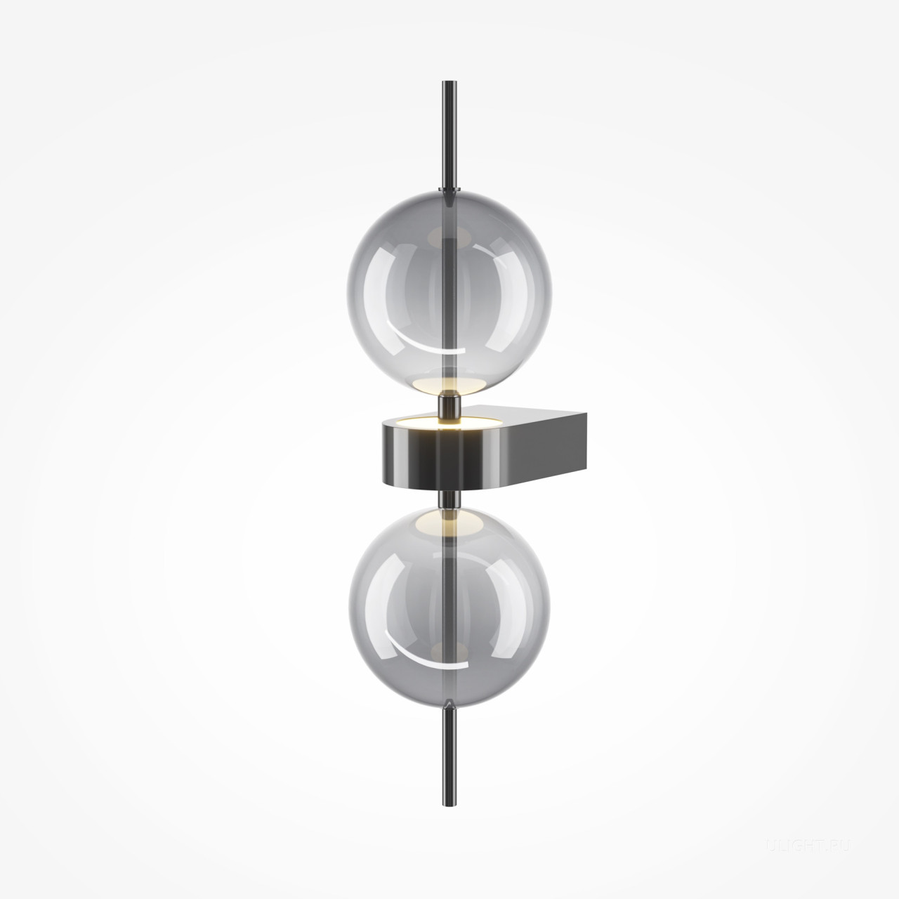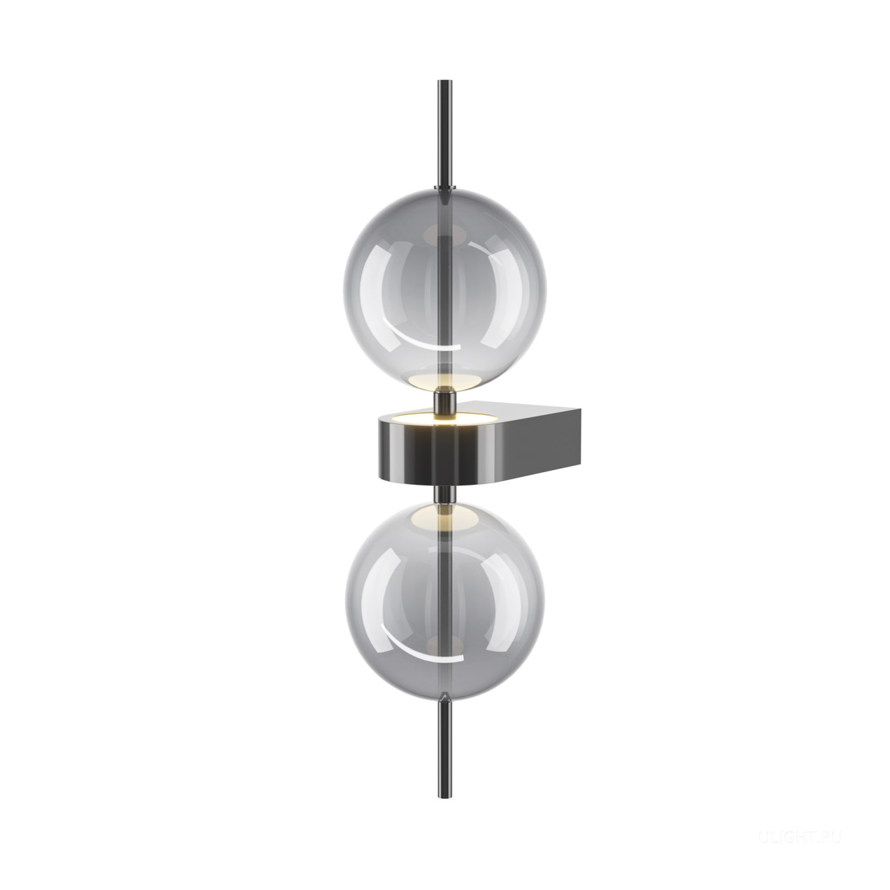 Серия включает подвесной светильник, бра, напольный и портативную модели. Стеклянные плафоны с зеркальным градиентом, черная глянцевая арматура из металла. LED-источник (3000K) скрыт матовым рассеивателем. Конструктивные особенности: магнитные потолочные чаши у подвесов и магнитное основание у бра обеспечивают монтаж без видимого крепежа. Напольный и аккумуляторный светильники диммируются при длительном удержании кнопки. Серия отмечена премиями Red Dot и A’design за инновационный дизайн.