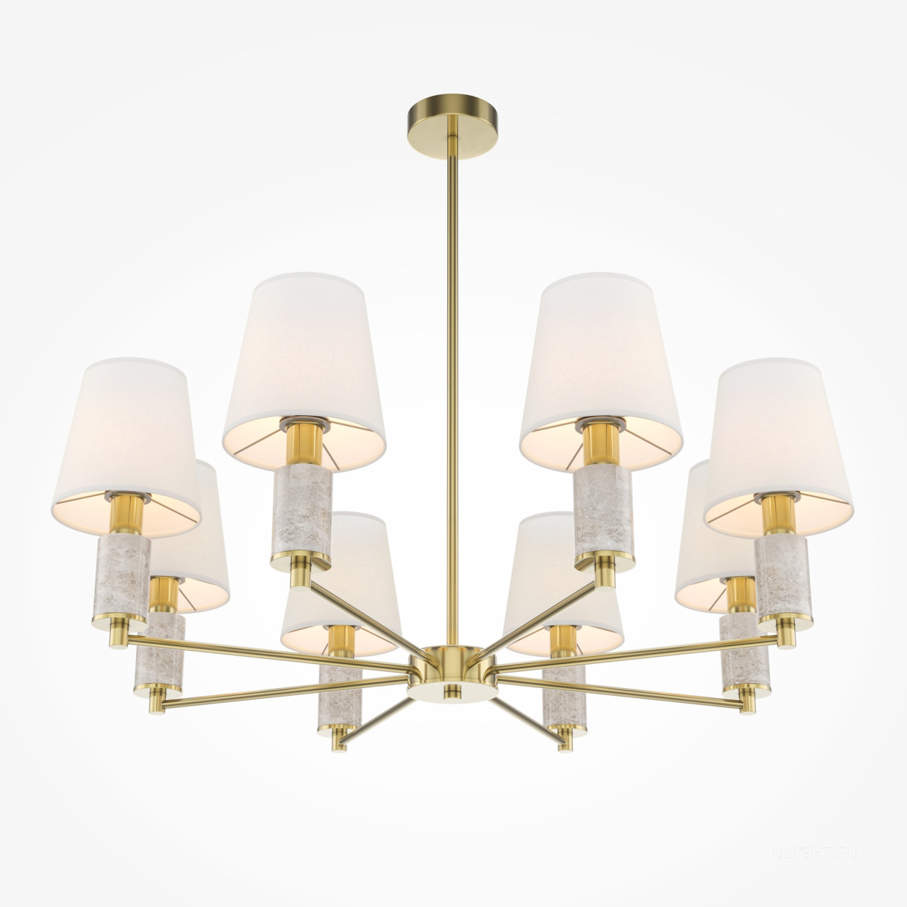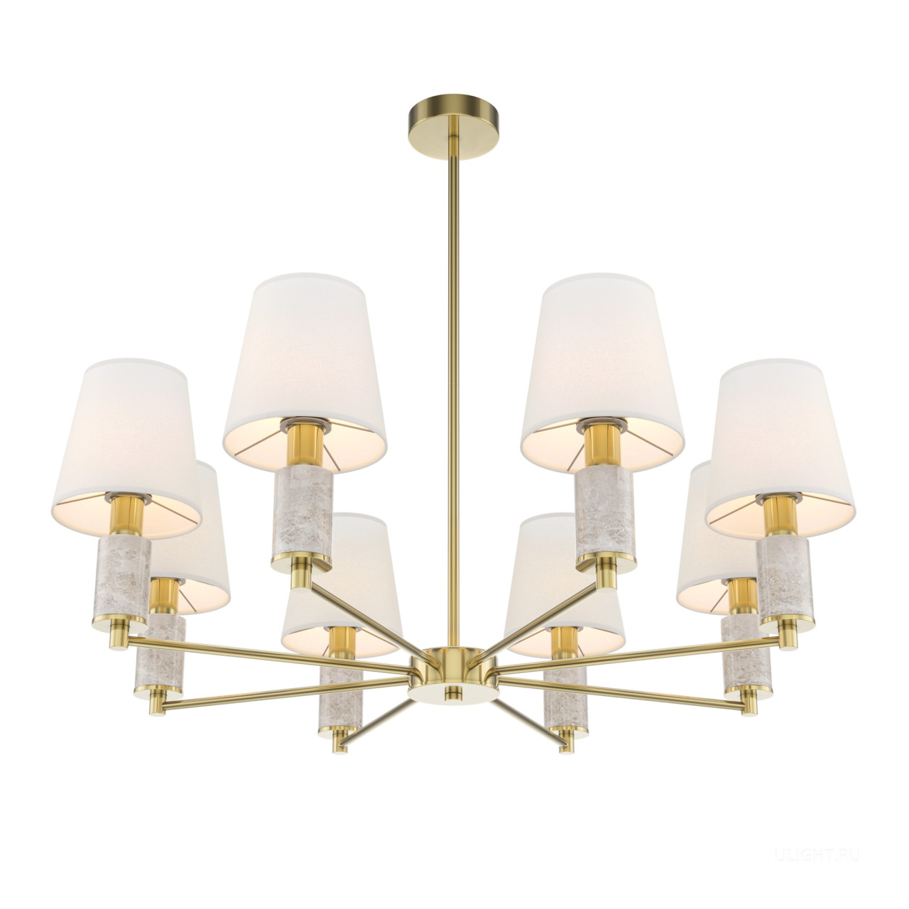 Серия включает подвесные (6 и 8 рожков), настенные, настольные и напольные светильники. Арматура: металл цвета сатинированной латуни с декоративными элементами из серого мрамора. Абажуры: текстиль. Сменный источник света с цоколем E14. Высота подвесных светильников регулируются сегментами штанги. Классический дизайн в современном исполнении. Предназначены для основного и акцентного освещения жилых помещений. Универсальное применение: гостиные, столовые, спальни, кабинеты, прихожие.