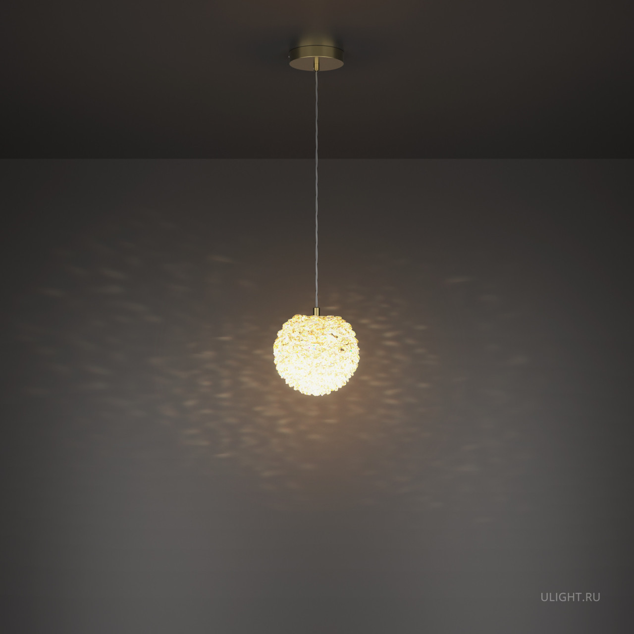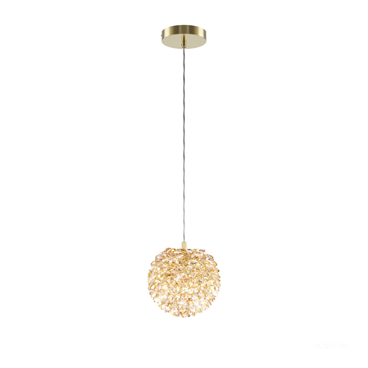 Подвесной светильник выполнен из металла в цвете теплой латуни с плафоном из хрусталя. Сменный источник света, цоколь: G9. Диаметр плафона: 130 мм, высота регулируется до 3183 мм. Светильник состоит из множества хрустальных элементов, создающих эффект мерцания. Предназначен для использования в интерьерах классического и современного стилей. Рекомендуется для гостиных, столовых и спален. Возможность комбинирования нескольких подвесов на разной высоте для создания каскадного эффекта.
