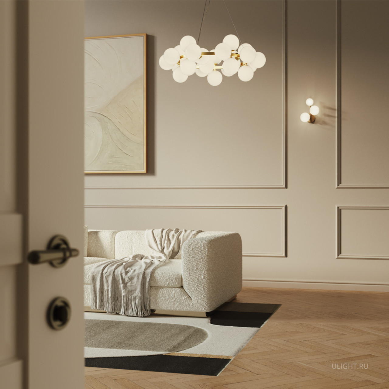 Получить расчет проектаМеталлическая арматура в четырех цветах: матовый черный, хром, золото, латунь. Плафоны — выдувное стекло. Цвета — дымчатый, янтарный, коньячный. Дизайн с имитацией молекулярной структуры. Высота подвесных светильников регулируется тросом. Лампа с цоколем G9.