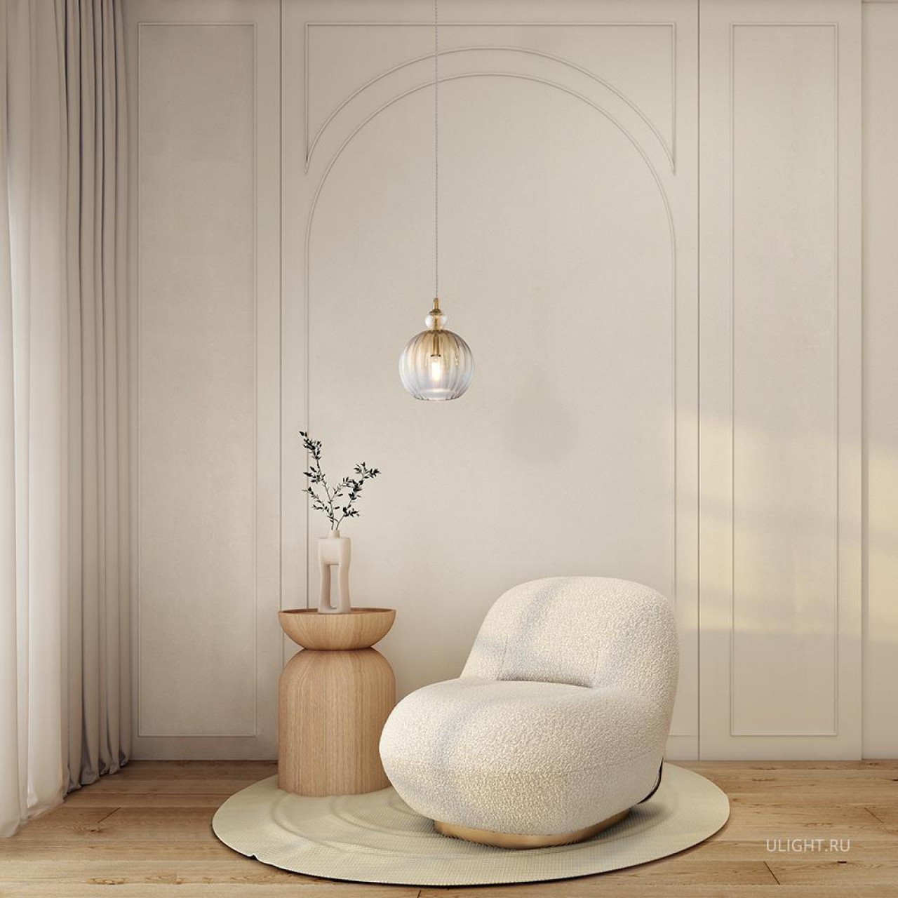 Материал арматуры – металл, оттенки – черный, латунь, хром. Плафон из стекла с рельефным рисунком. Оттенки плафонов: дымчатый, янтарный, белый. Витой провод. Регулируемая высо