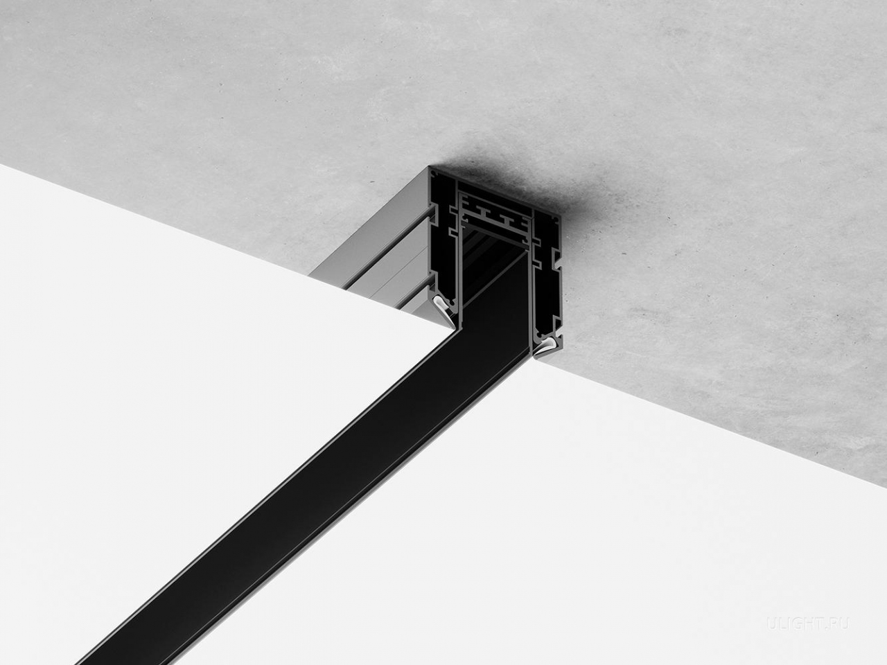 Конструкция состоит из двух частей: закладная и трек. Специально предусмотренные пазы закладной позволяют легко зафиксировать полотно натяжного потолка, используя специальный гарпун. После чего в закладную устанавливается сам трек. Гарпунная система крепления обеспечивает простой монтаж световой линии в натяжной потолок.